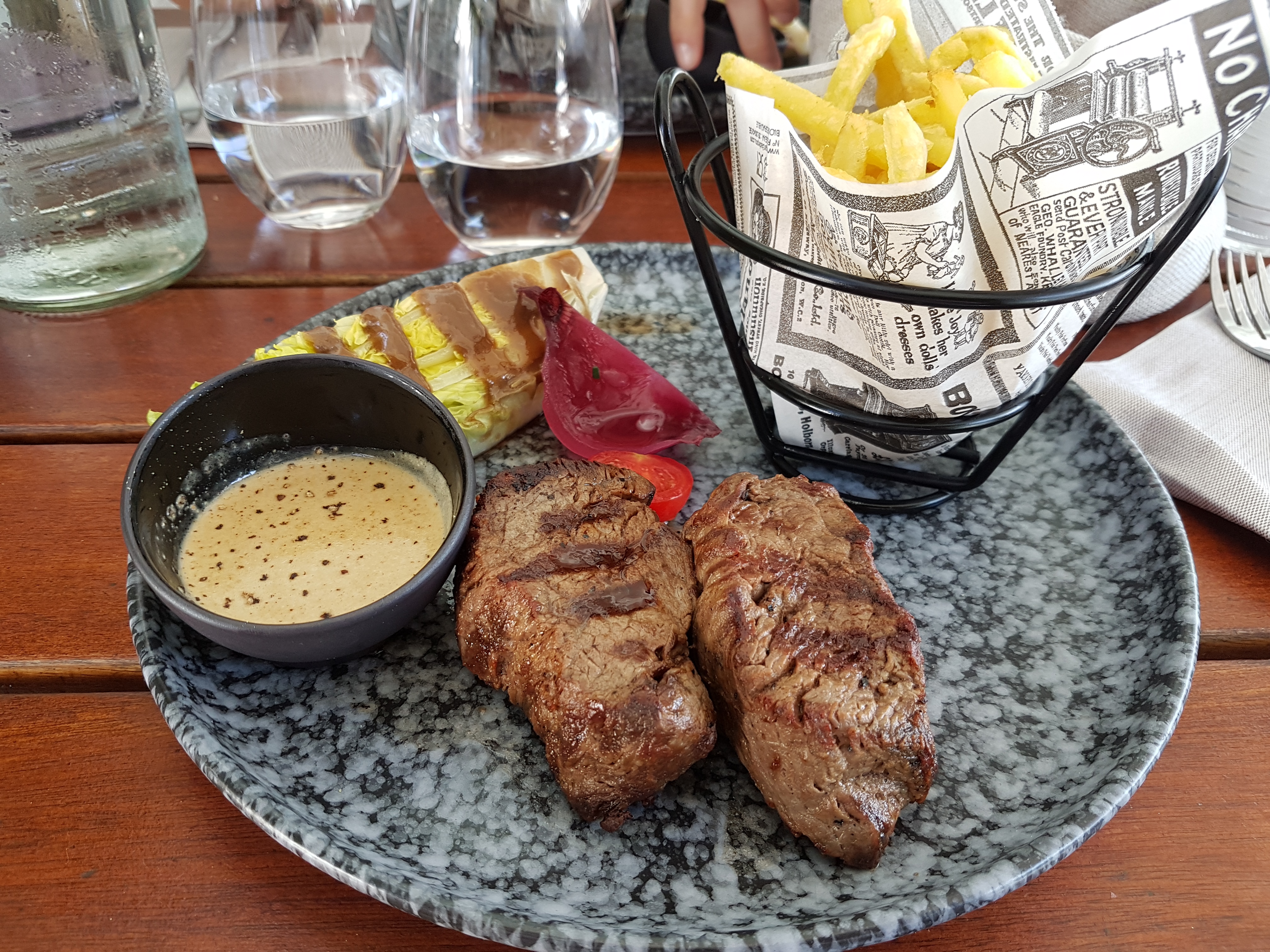 Très déçu, les frites soit disant maison ne le sont pas (je n'ai rien contre les frites industriel du moment que l'on ne m'annonce pas qu'elles sont maison), la sauce au poivre avait un arrière goût horrible, les sauces ketchup mayo et moutarde étaient servis dans un contenant et étaient toutes sèches... Heureusement que la viande était bonne mais du coup sans sauce ni accompagnement ! Et l'état des toilettes n'en parlons pas ! À éviter !