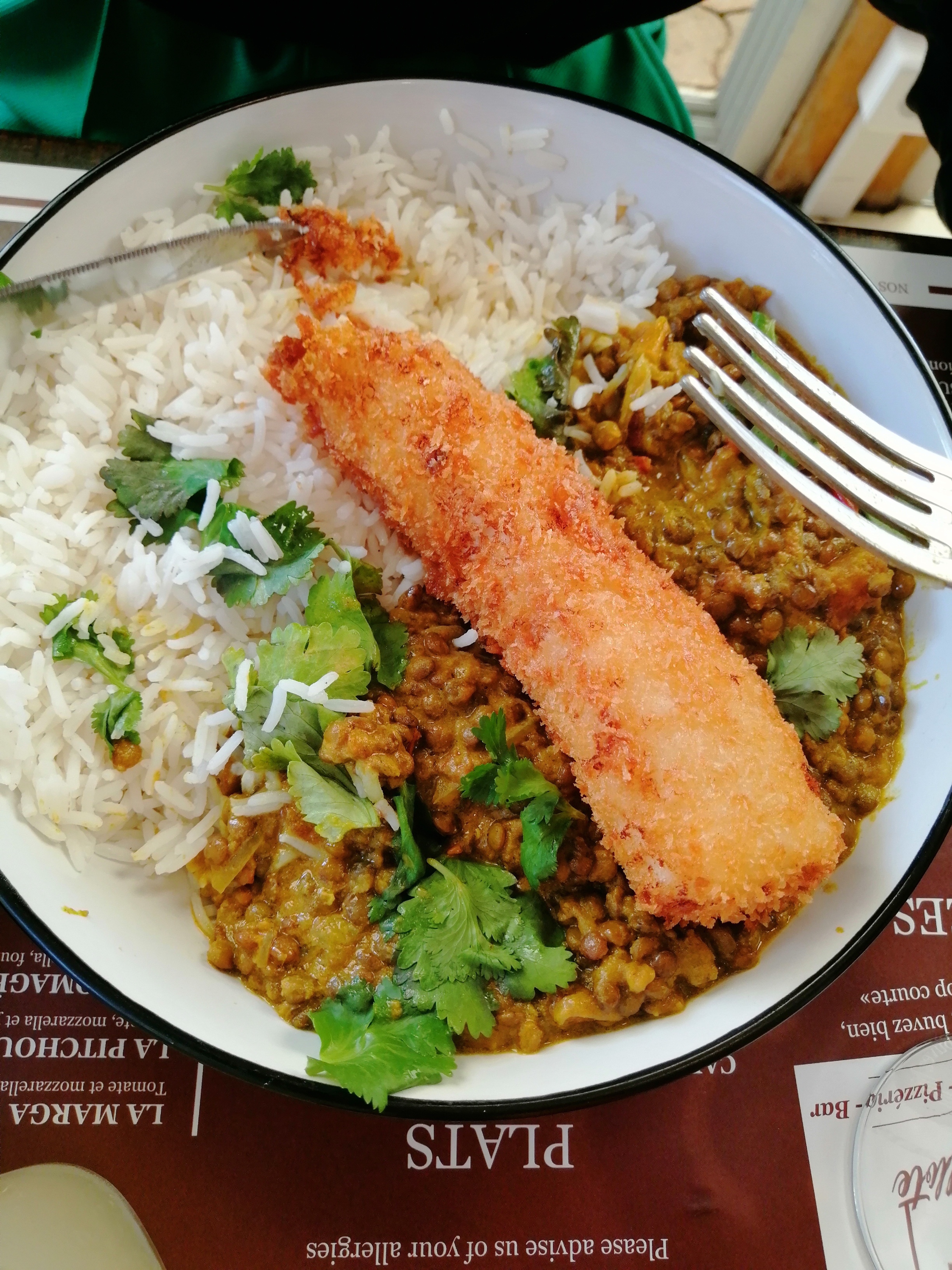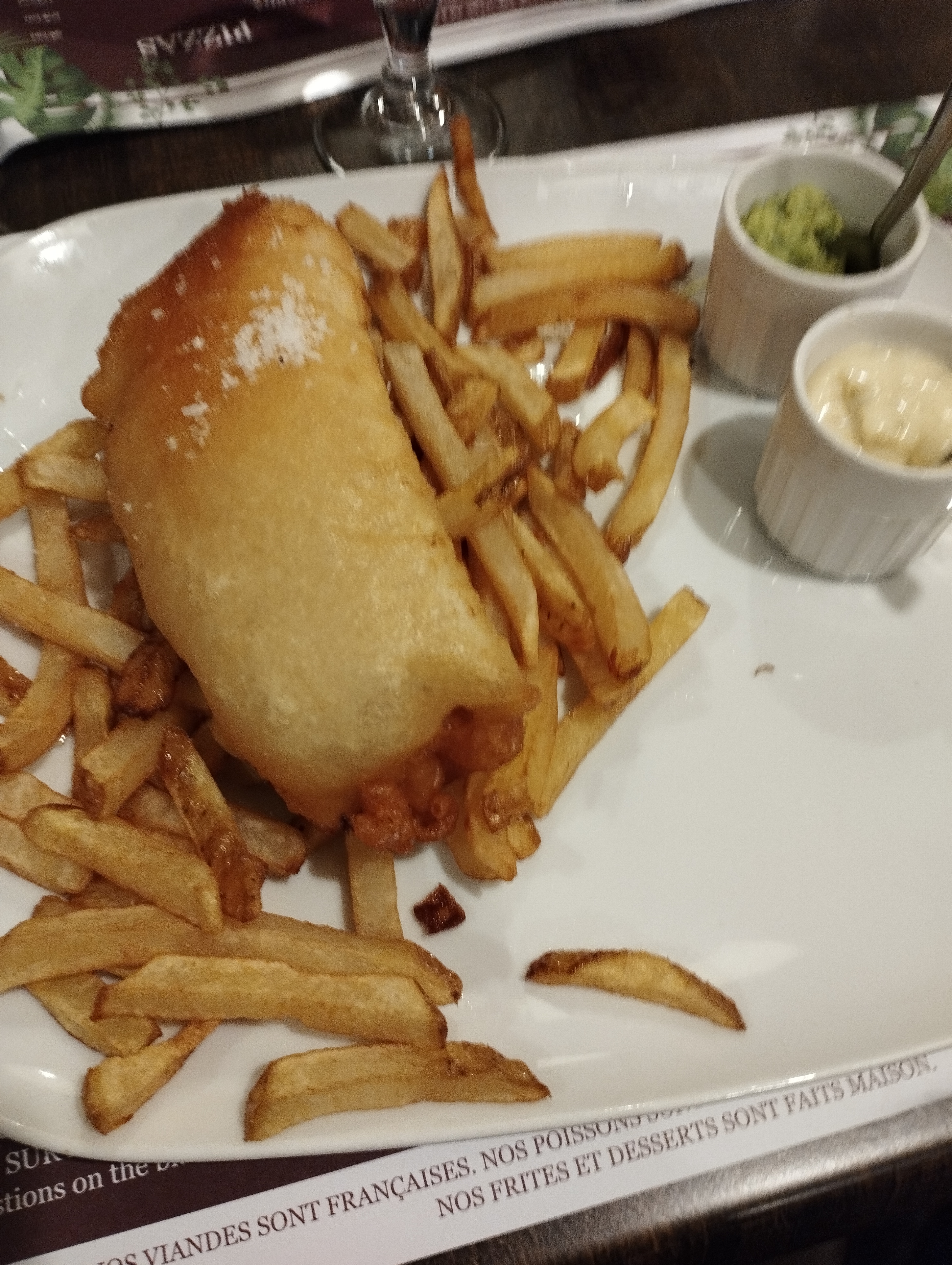 La serveuse à été vraiment au top de son professionnalisme, merci à elle pour son sourire. L'accueil est moyen. Quant aux moules au curry, elles étaient délicieuses et de bonnes tailles, et moins chères que dans la plupart des restaurants. J'ai longtemps hésité à commander un fish & ship, a la place des moules, et finalement, avec mon ami, nous avions partagé un fish & ship en guise d'entrée. Nous avons été extrêmement déçus. Le poisson était frais, c'est sûr, mais la panure... Ce n'était pas du tout croustillant, ça ressemblait à un gros beignet de poisson. Ça n'avait aucun goût et aucun assaisonnement. Et j'ai été ravis de ne pas le commander en plat principal. Peut être serait il judicieux de revoir cette recette ? Endroit bien placé et agréable cependant.