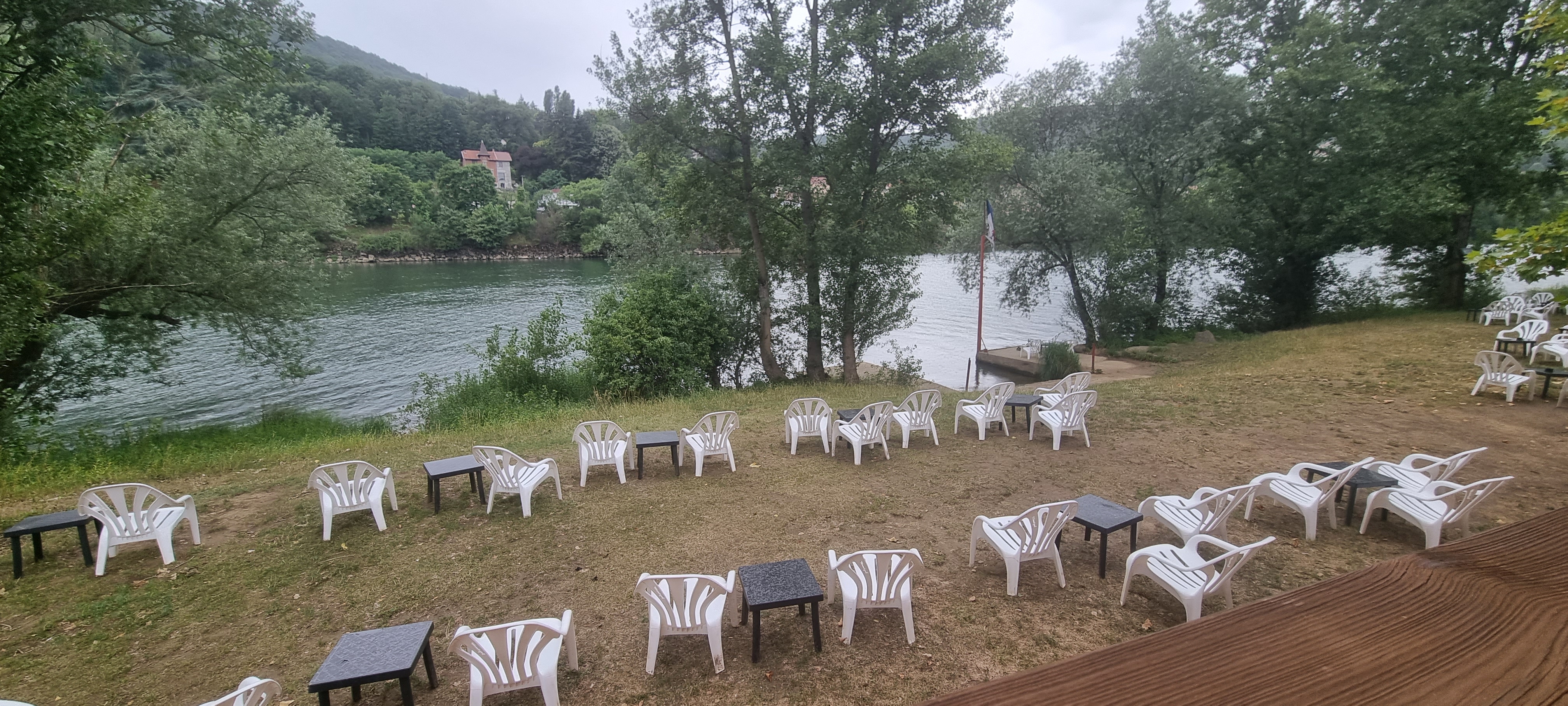 Superbe terrasse au bord Saône + quelques chaises les pieds dans l'eau service souriant, franc sourire.. un moment enchanteur merci !