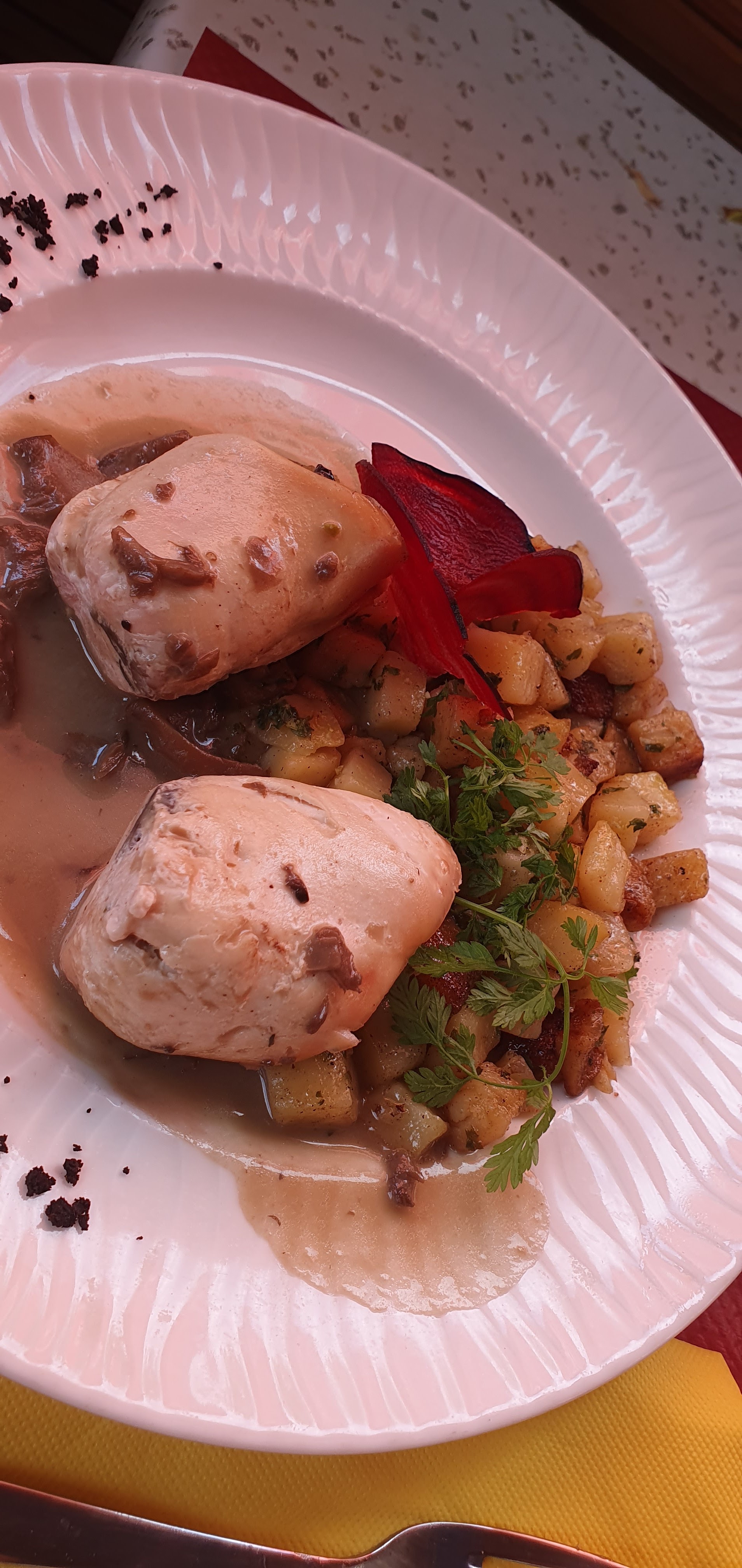 Plat canette sauce aux morilles, bon mais assiette arrivée tiėde, dommage. Par contre tiramisu noisette excellent.