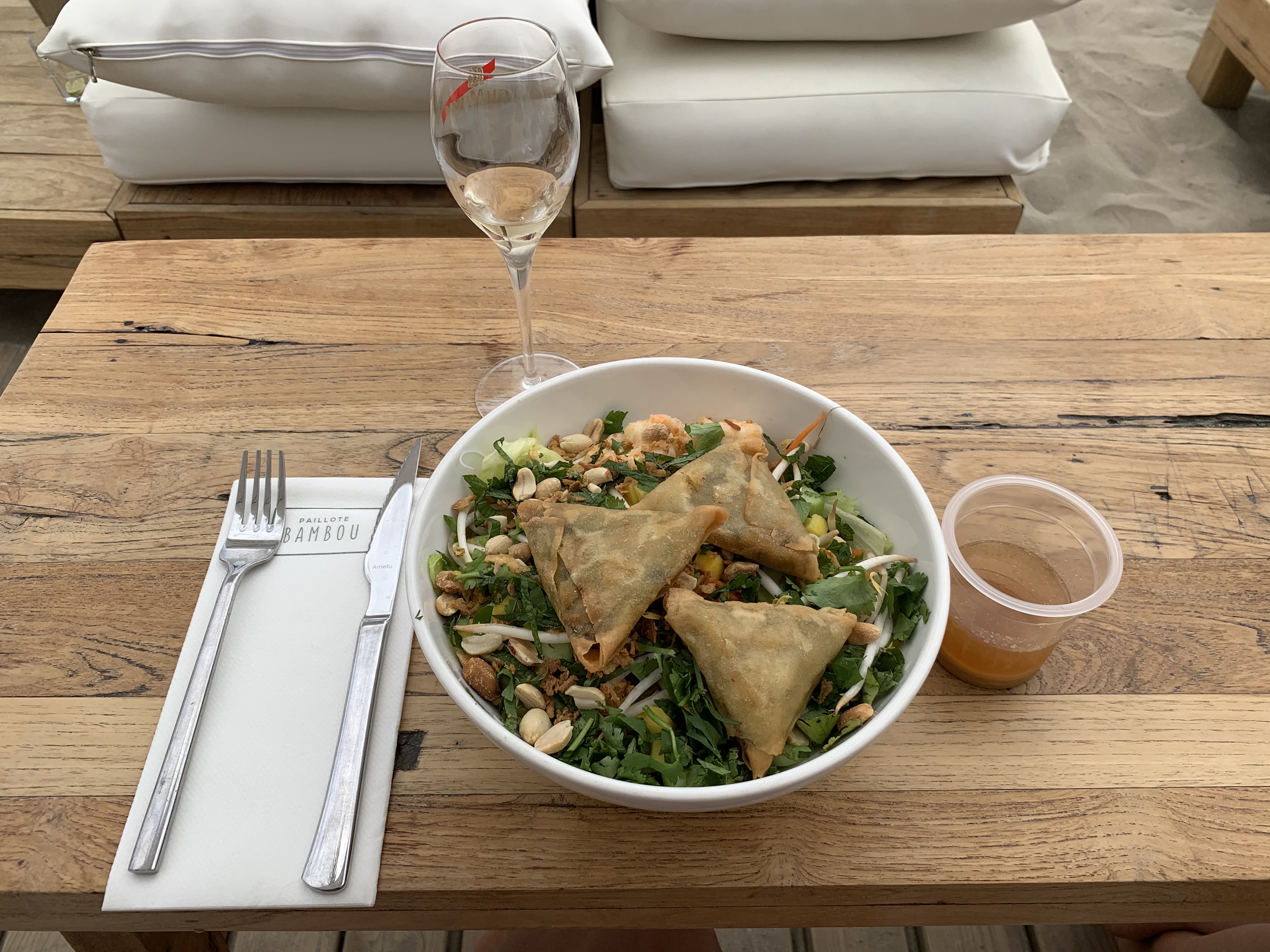 2 étoiles uniquement pour la lenteur du service, l’absence de port du masque par l’une des serveuses (qui plus est un peu hautaine), la suffisance du manager de la plage et les foutas non fournies contrairement à la paillote Pampa (business is business des foutas sont à la vente à 25€)! Les beds sont classes mais la texture plastifiée donne chaud et il n y a pas de dossier ajustable, uniquement des oreillers/coussins ce qui ne permet pas une très grande latitude au niveau du maintien. En revanche j’attribue le prix de la magnifique déco à cette paillote: simple et raffinée, dans un esprit nature. Côté restauration, les salades etaient très bonnes!