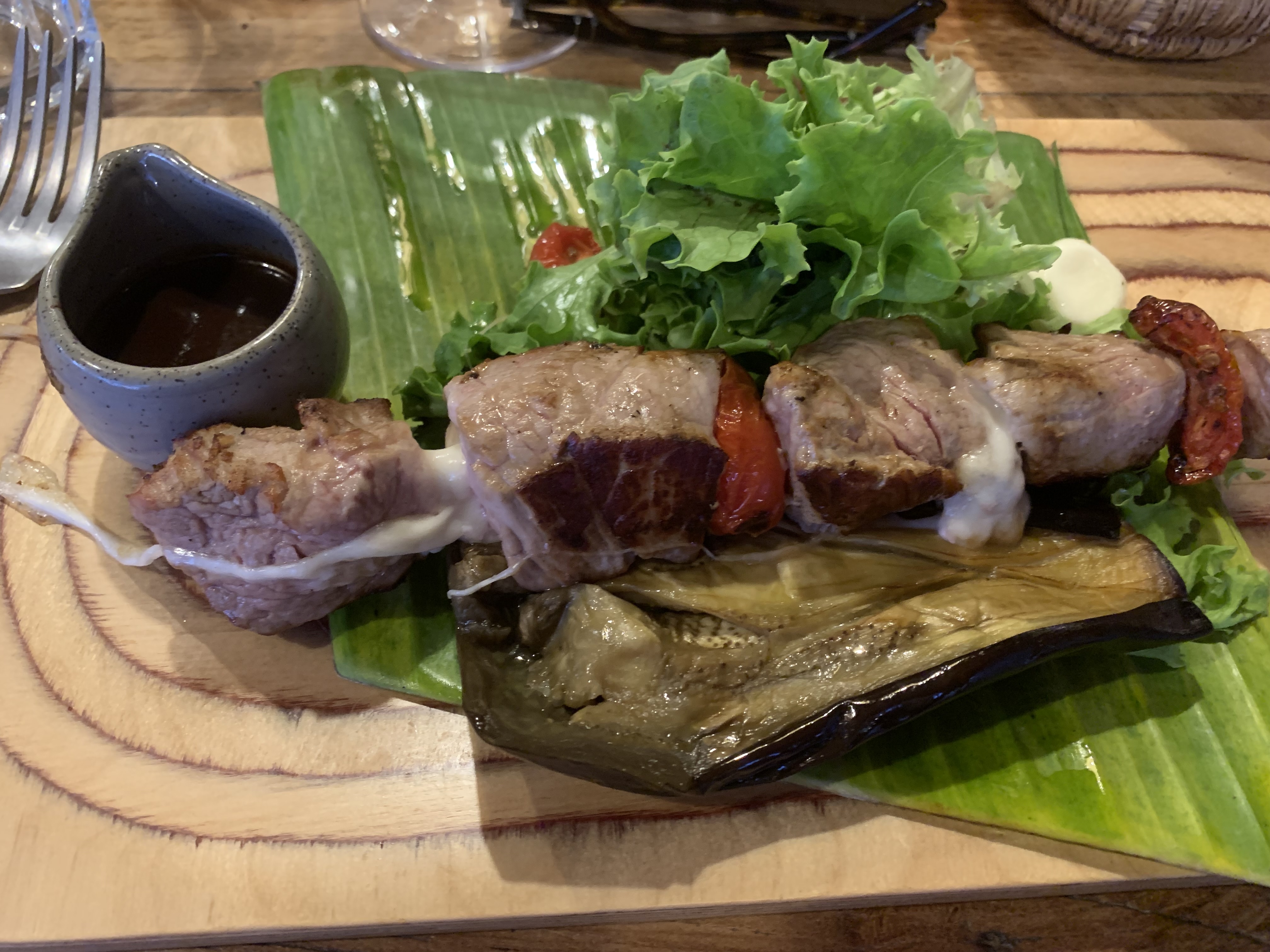Très jolie cadre, décoration parfaite. Il y a un mais salade interdite le soir c’est tellement dommage, tapas interdit à table uniquement côté bar… j’ai du me rabattre sur la brochette de poulet sinon il n’y a que 2 viande proposée et assez cher. L’énoncé été brochette de poulet et salade de riz. Alors brochette ok et du riz nature avec 2 morceaux concombre dedans sans sauce sans rien… pour quasiment 30€. Je trouve que c’est ce moquer des gens. A ce prix là au moins une vinaigrette