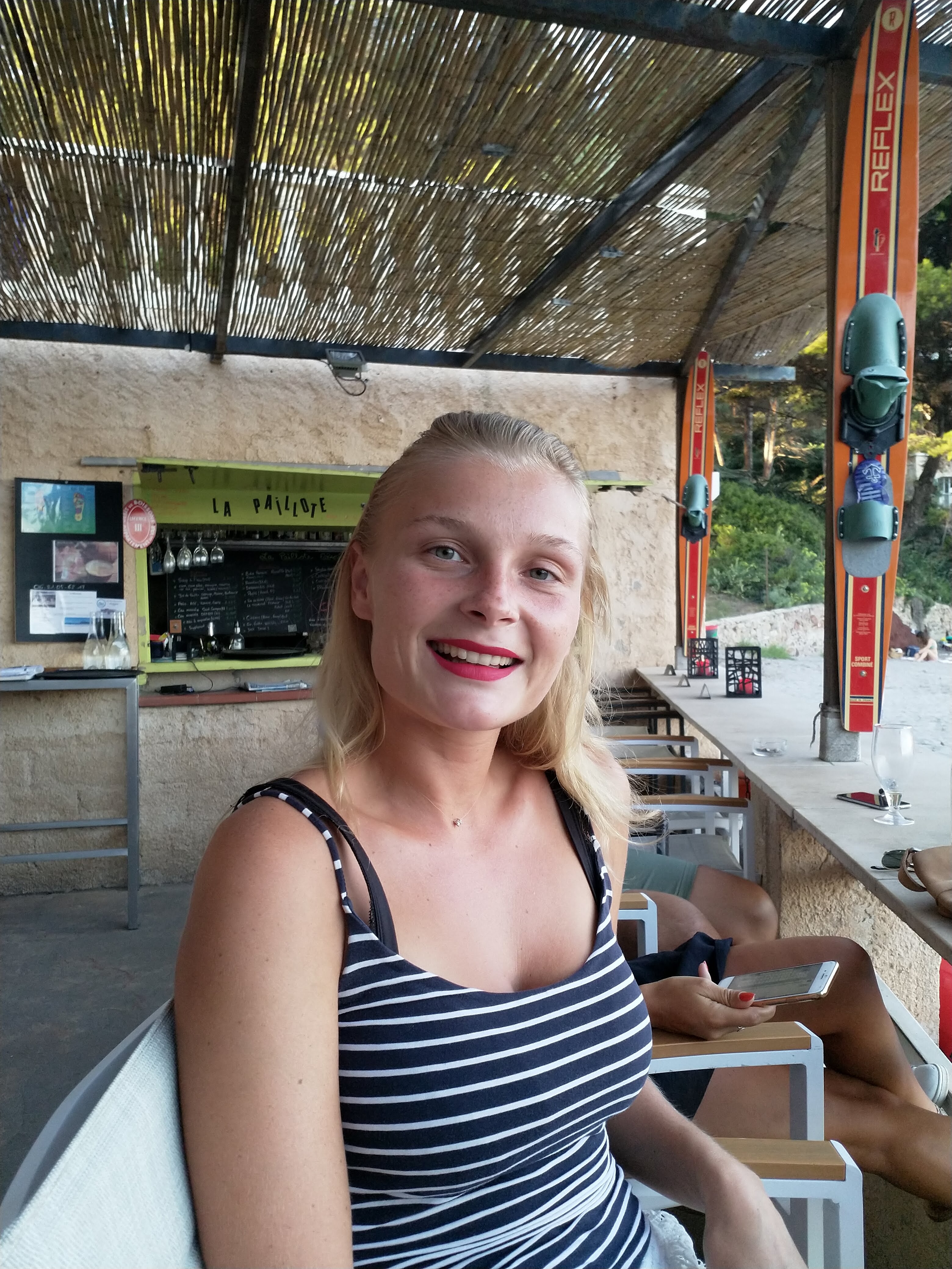 Arrivé en kayak à 14h30 et affamé il ne nous à pas était possible d'y déjeuner cependant nous avons bu un verre et manger une crepes nutella assez bonne , pate effectuer avec un soupçon defleur d oranger , service pas tres rapide , pas une ambiance folle mais terrasse joliment decorer façon paillote