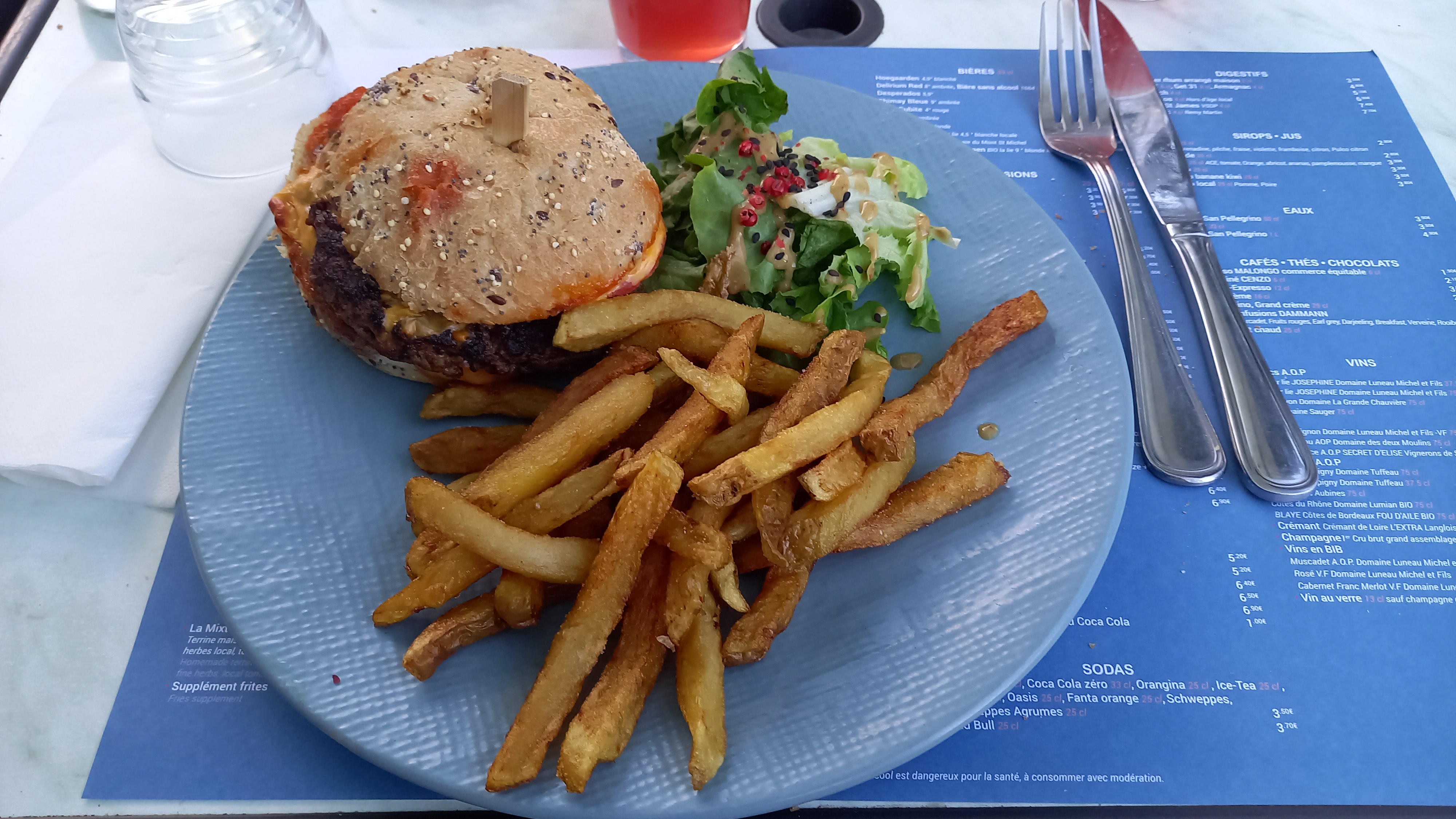 Le lieu ne paie pas forcément de mine de la rue et ce n'est pas le restaurant qu'on voit le plus sur cette carte et pourtant c'était parfait. Accueil super gentil. Les burgers sont très bons avec le pain très croustillant sur le dessus. La tartine du pêcheur était très bonne aussi. Avec les crevettes juste épicées top. Et le plat du jour délicieux (poisson en papillote avec une purée maison miam et des petits légumes super) La terrasse au bord de l'eau. Le sourire à toutes les lèvres et un mot gentil à chaque fois que les serveurs apparaissaient. Le service se fait en changeant de serveur quasiment à chaque passage, ils sont donc tous très sympas... Et faits pour ce métier. La terrasse était pourtant pleine. Et notre chien a eu le droit à son bol d'eau les deux fois où nous y sommes allés. Personne n'est oublié. 👍