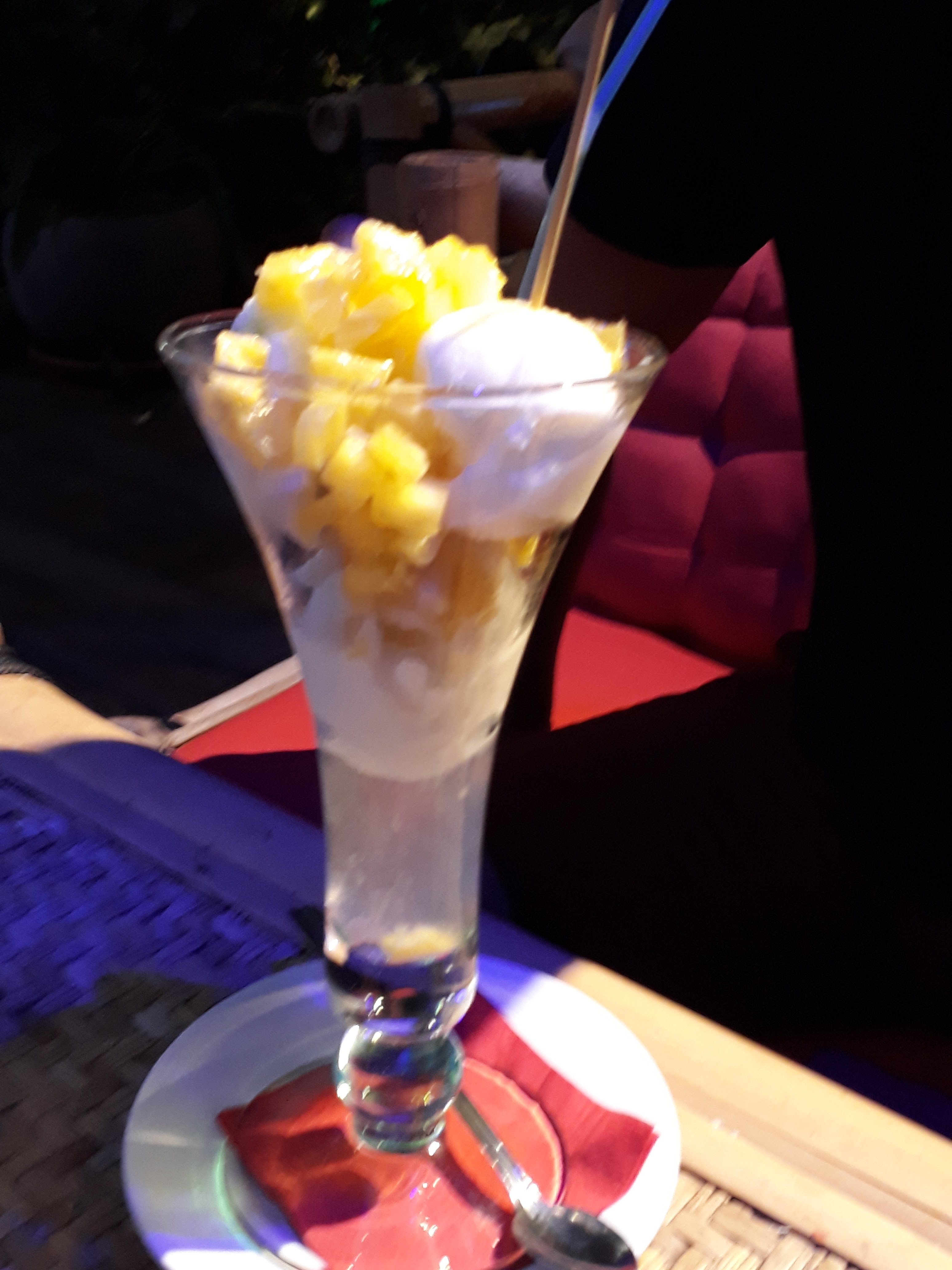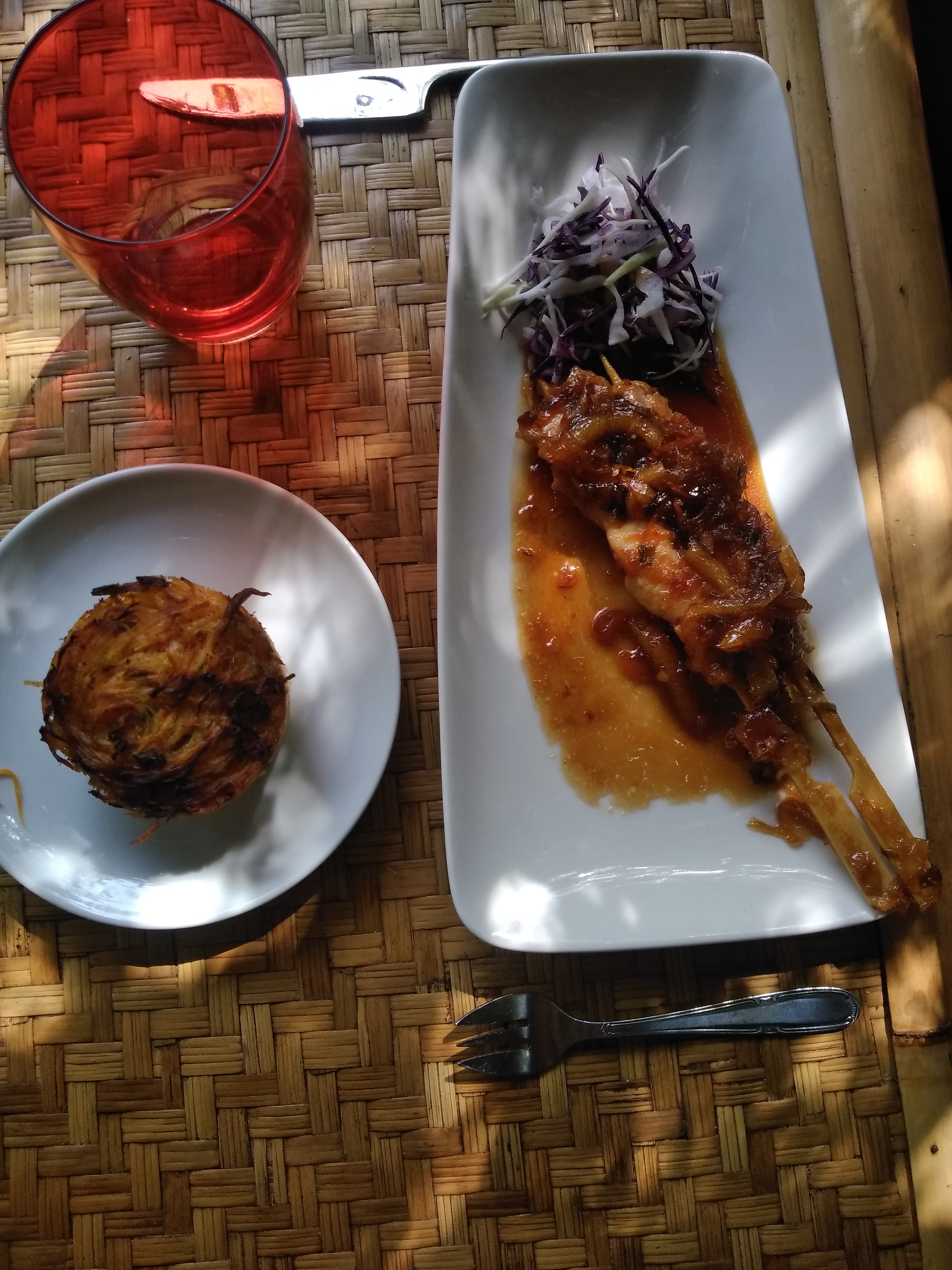 Première visite lundi, arrivé au bar pour l’apéro à 18h, assez calme (fin de saison je suppose) Le cadre, les bons cocktails nous on décidés à aller manger dans le restaurant. On a voulu faire confiance à la suggestion du moment : nems; samousa; brochettes de crocodile. (Digestif gentiment offerts au bar!) C’était délicieux! Pendant la soirée, on a pu parler à plusieurs personnes serveurs ( bar/restau) Ils ont tous été, serviable, aimable, bref.. de bons serveurs Au point d’y retourner à notre dernière soirée dans le sud deux jours plus tard. C’est la première fois pour nous que nous retournons deux fois dans le même restaurant pendants nos vacances.