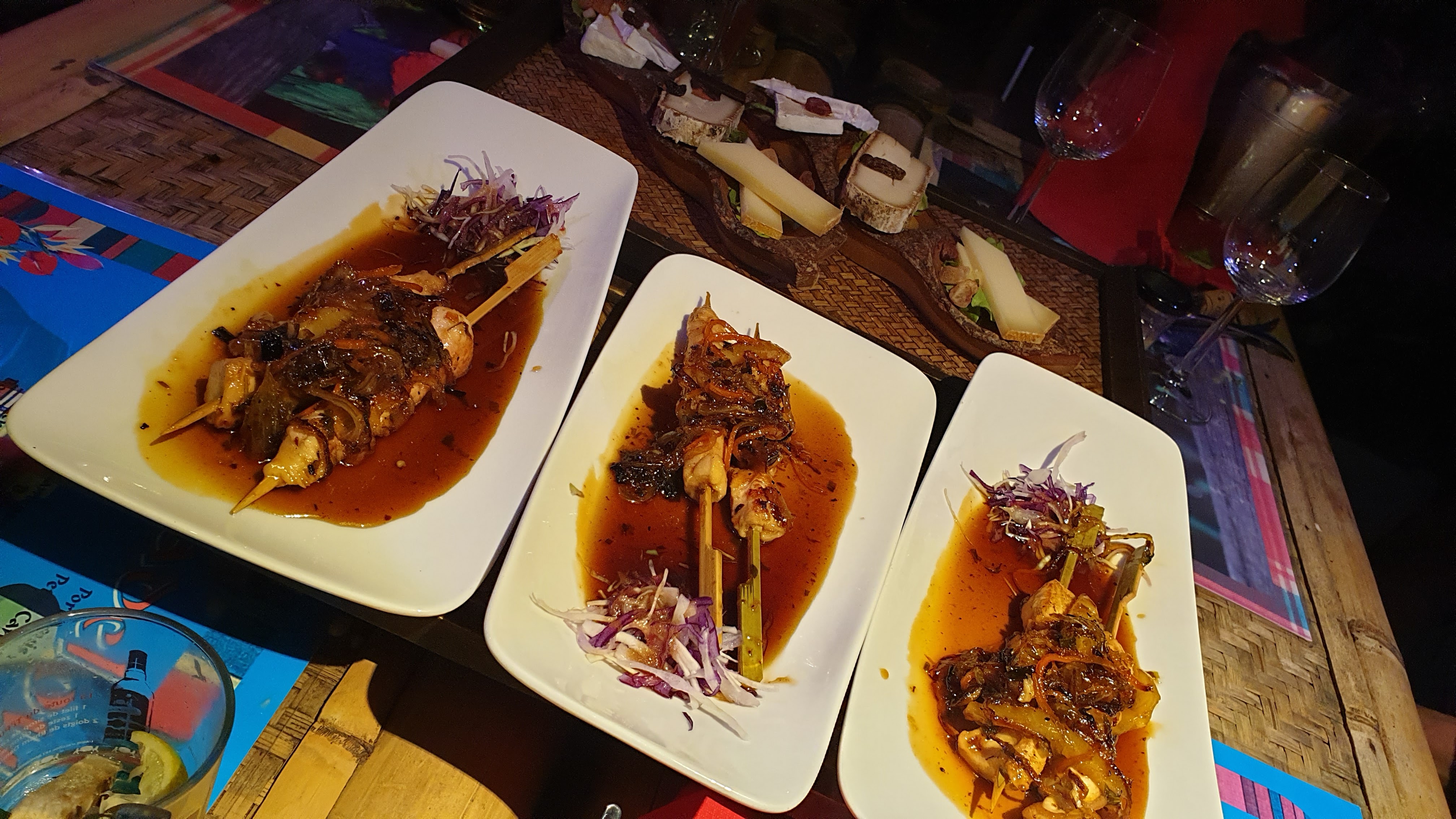 On est venu a 7 dans ce restaurant sur conseil d' un ami qui ne pratique que le bar. Une attente interminable entre chaque plat. Verre et caraffe d' eau sur demande...et encore il a fallu aller chercher les verres soit meme. Les cocktails n' ont rien d' expetionnel. Mojito a eviter absolument. Les acras n' ont absolument aucun gout. Les plats sont ridiculeusement petit, c' est a chaque fois deux petites brochettes avec leur sauce ainsi que des bols de riz, gratin de pomme de terre (bon) ou ratatouille en portion menu enfant. Dans l' ensemble les plats sont pas mauvais bien relevé mais mal assaisonnés. La sauce aux amande est tres bonne. Les desserts sont moyens, l' astuce de la chantilly marche a merveille dans les coupes de glaces. Les serveurs/euses sont globalement d' une grande incompetence et d' une lenteur legendaire digne du pays de leur specialitée. Cet etablissement a un gros gros potentiel au vu de la mise en scene mais est dirigé par des imcompetents. L' addition etait accompagnée d' un verre de planteur chacun pour faire digerer la note ultra salé pour ce que nous avons consommés. Tout le mobilier est en bambou. Des tables avec chaises hautes pour deux personnes. Au dela de deux vous serez sur des banquettes et table basse tres inconfortable pour manger. Pour définir la lenteur de ce cirque. On est rentré dans le lieu a 21h30 et on est repartis a 1h30. Trop tard pour aller au mac do ! !!!
