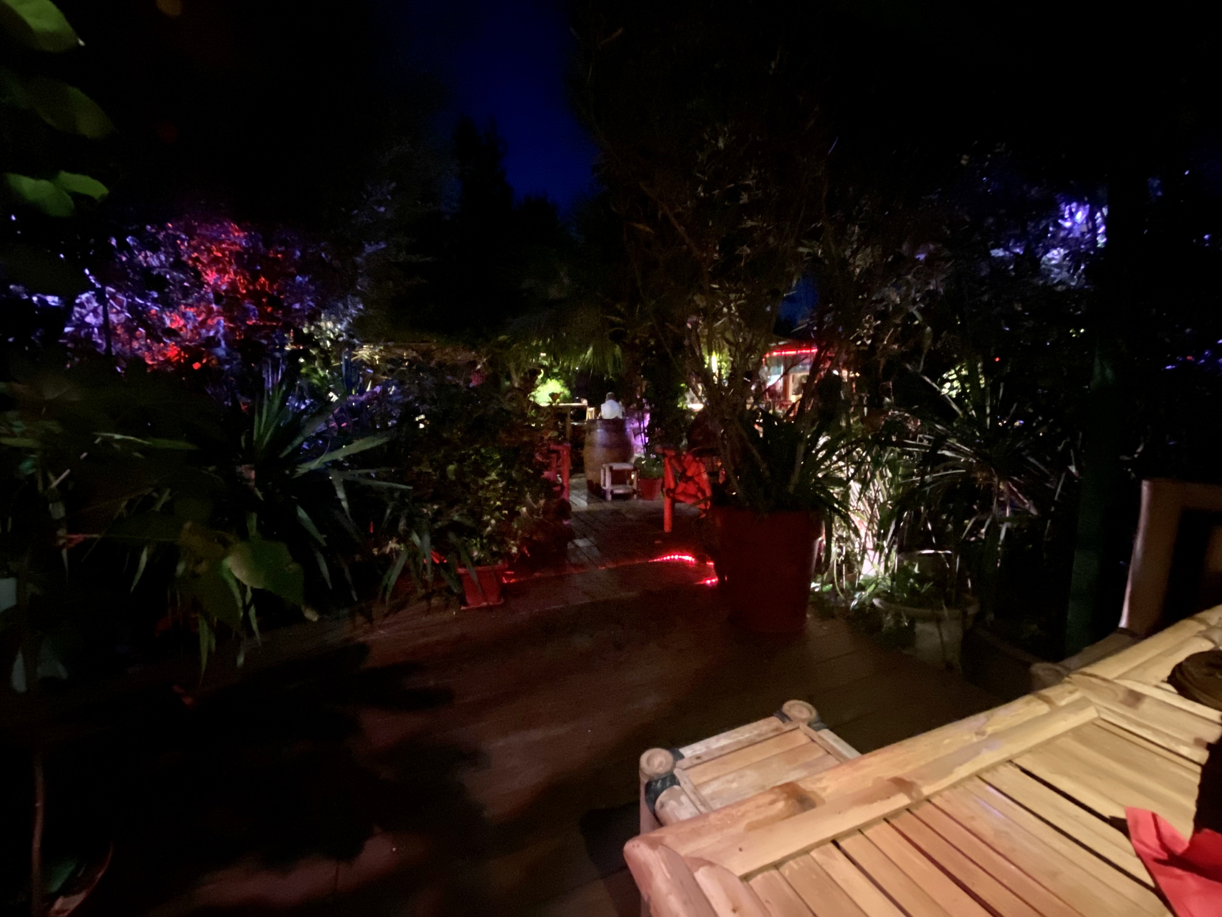 Génial et atypique, endroit à connaître. Les lumières de couleurs changeantes mettent en valeur la nature qui fait le décor principal à ciel ouvert, avec une ambiance tropicale. Bravo pour le concept 👌 J'adore 😀 J'y reviens dès que j'en ai l'occasion
