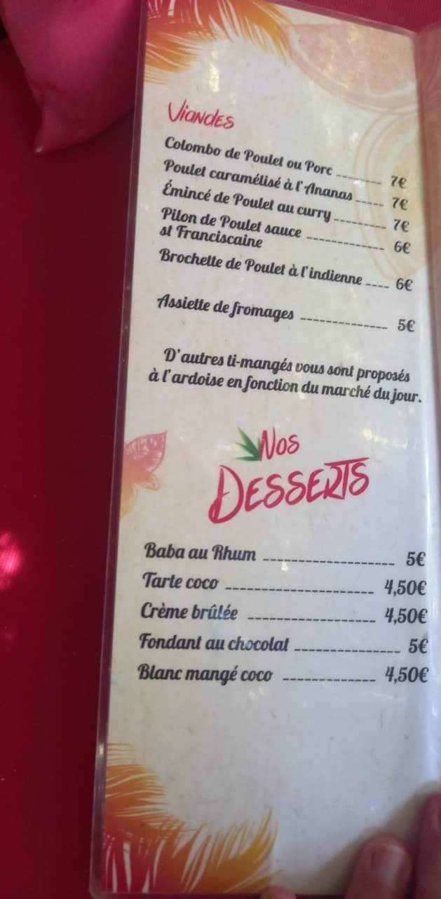 Désolant. Ne pas y aller pendant l ete mais hors saison mai juin ou septembre Service minable l ete et en plus le patron fait des remontrances et est très désagréable. On nous a servi les entrées et les plats en même temps. J ai demandé à réchauffer nos plats. Ca été compliqué..réponse du patron il faut le préciser a la commande en plus il y a beaucoup de monde et ici c est comme ça que ça se passe. Un peu de bon sens monsieur le patron. On ne sert pas tout en même temps. Lees accras à déconseiller pas de morue. Juste de la farine frit. Quant au colombo de poulet il n a aucun goût. Meme moi métropolitaine le mien est meilleur. Et la patronne encaisse mais ne demande pas si tout c est bien passe. Hélas non. En juin c etait parfait