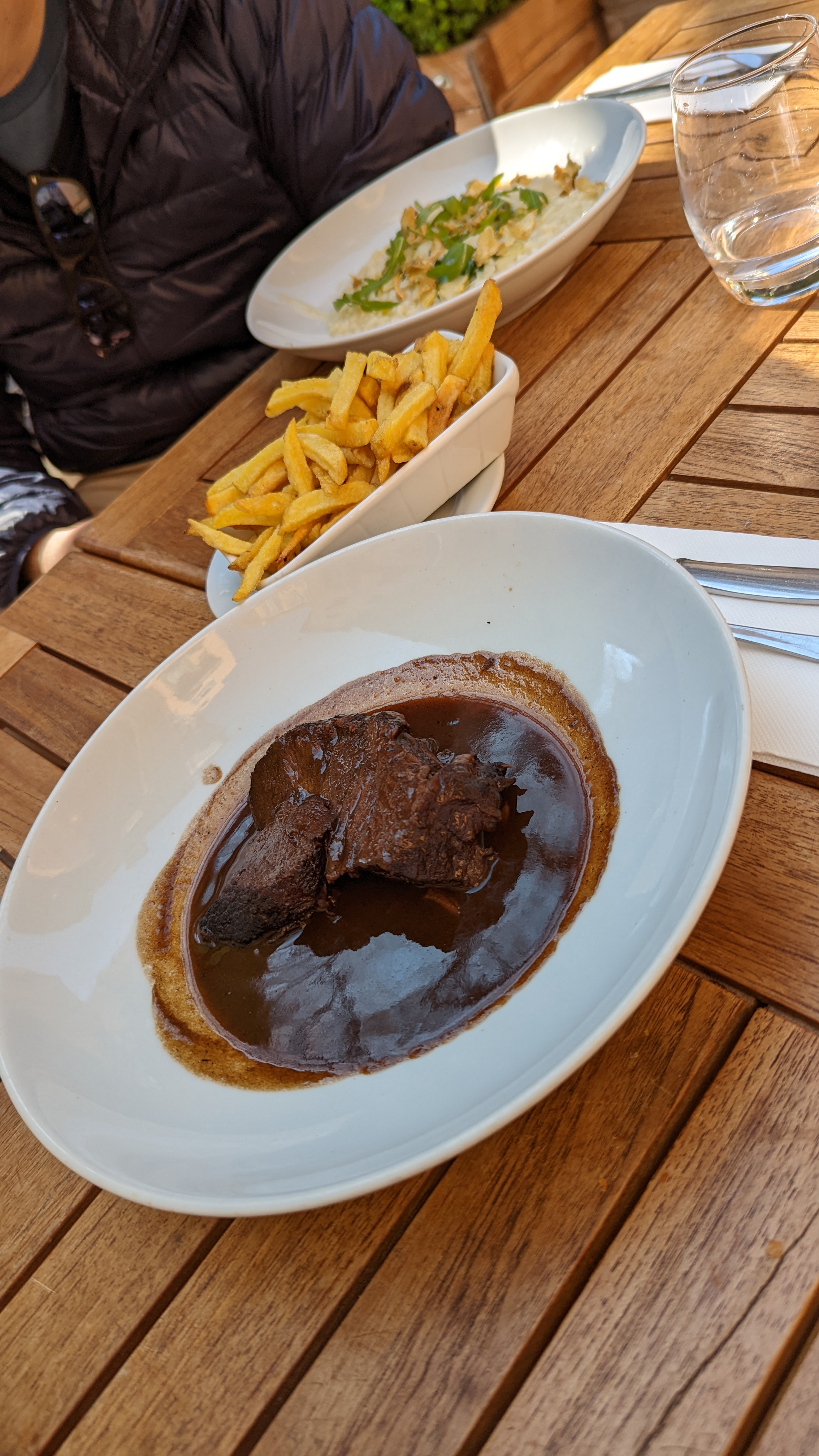 Grand espace extérieur avec beaucoup d'espace pour les poussettes et les petits enfants. La nourriture est superbe. Nous avons commandé le ragoût de bœuf et le plat du jour (riosotto aux artichauts) et les deux étaient excellents. Le bœuf était tendre et savoureux, on avait à peine besoin d'un couteau. La salade niçoise est uniquement en été car ils n'utilisent que le meilleur de la saison. Les serveurs étaient super. Merveilleuse expérience culinaire.