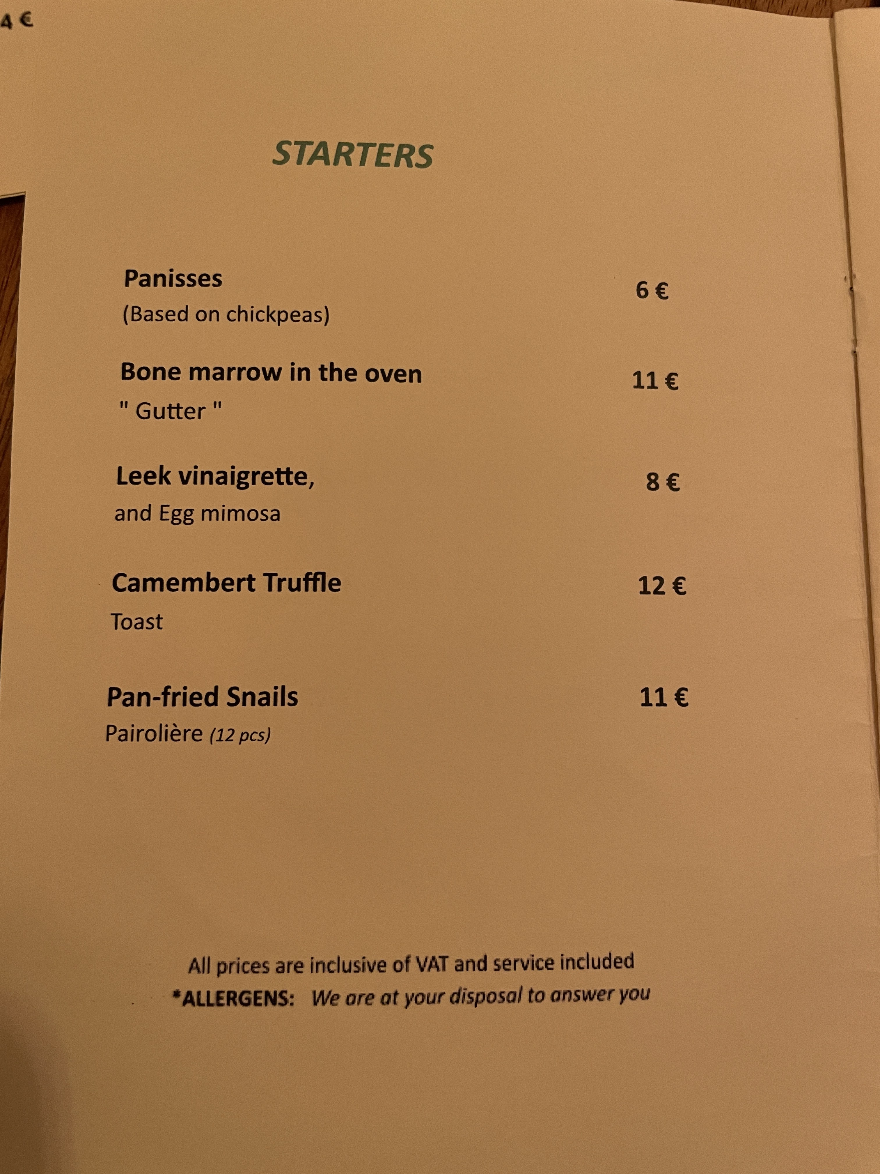 Plats intéressants, l'os à moelle était très bon ! Charmant restaurant dans le vieux centre de Nice. Vous devez vous informer à l'avance des heures d'ouverture. La première fois que nous y étions, c'était fermé.