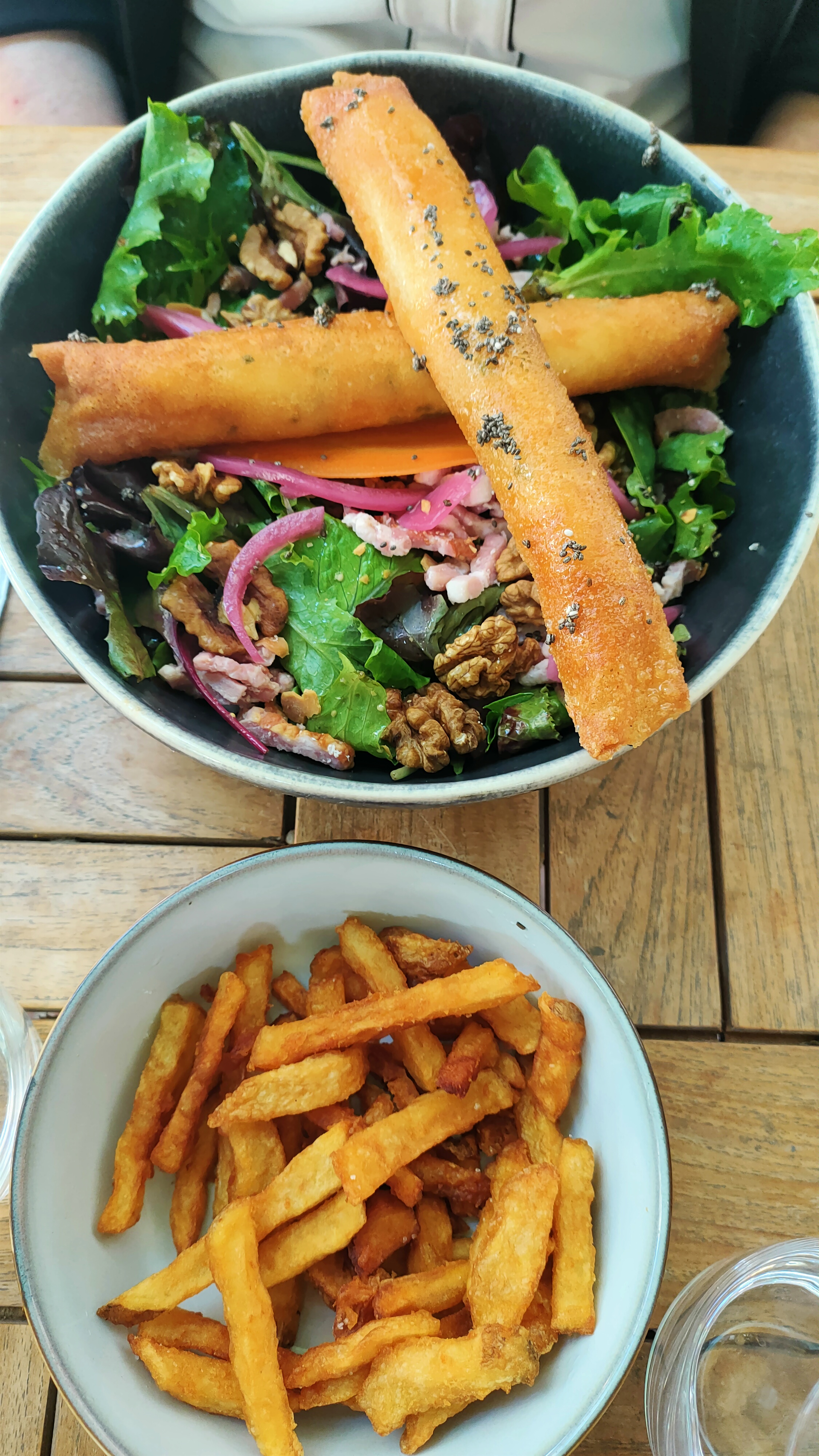 Salade fraîche et pain cuit au four, bon goût, mais pas exceptionnel. L'attente a été un peu longue pour le service de déjeuner après la pointe. Service grincheux et tables extérieures bancales.