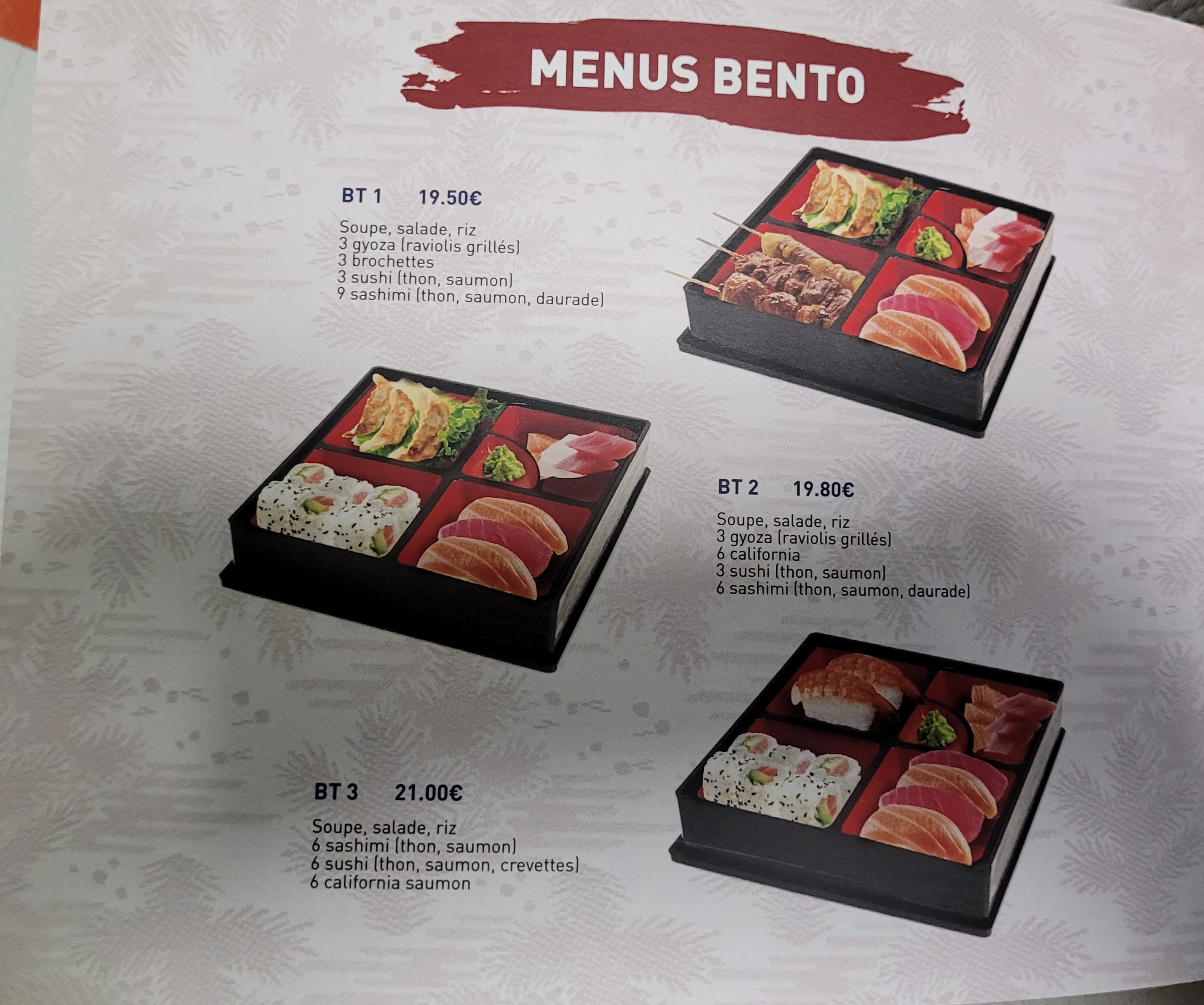 Nous avons pris tempura crevette en début de repas avec un cocktail et le bateaux B largement pour deux personnes .sushi et brochette préparer sur place à la commande . Super produit belle présentation sur des bateaux en bois . Bon rapport qualité prix. Sur place et à emporter.