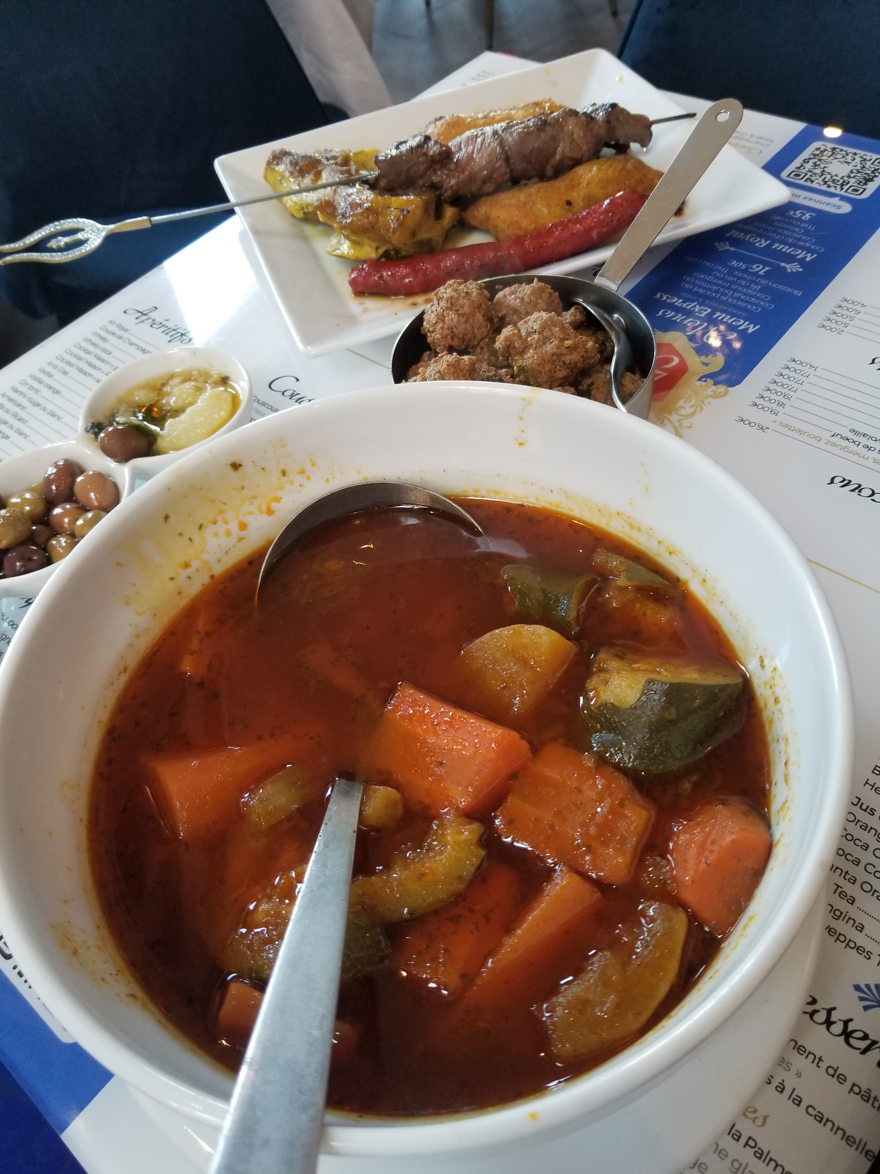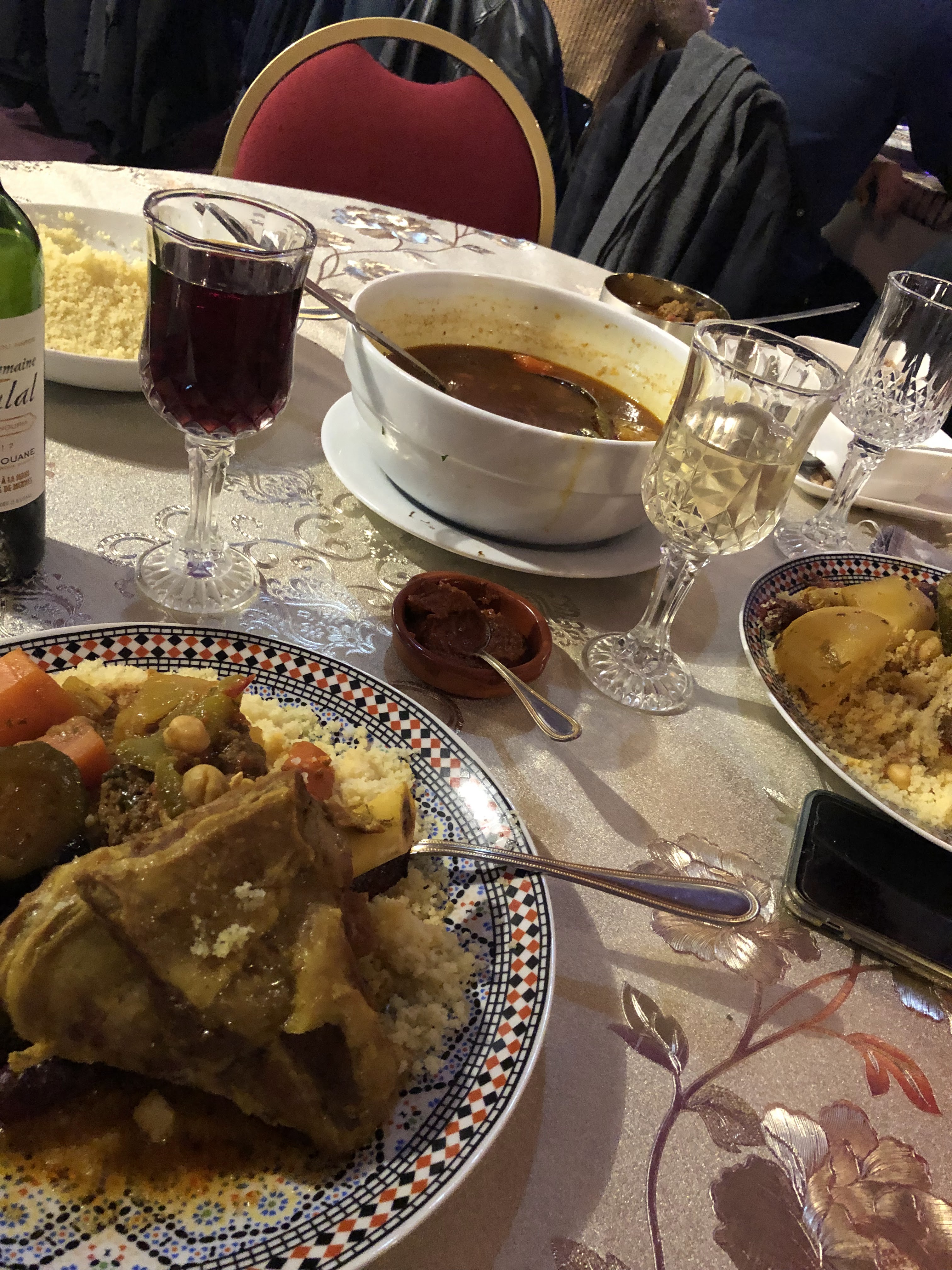 Bon accueil, service attentif, bons produits et portions généreuses, plats soignés. Ambiance étonnante. Nous avions réservé pour dinner à 7 entre collaborreurs d'un projet, collègues et prestataires. Une autre table fêtait un anniversaire, lumière tamisé, commentaire au micro et musique de circonstance. Puis nous avons été été surpris par la tournure karaoké qu'a pris notre aperitif. Puis encouragé par l'enthousiasme de la tablé, le micro a circulé ... Bastillas poulet partagé, 4 coucous royal, 1 couscous boulette, tajine agneau pruneau, tajine kefta, thé à la menthe. Nous nous sommes tous régalé. Ça faisait longtemps que je n'avais pas remangé un aussi bon tajine, depuis mon voyage au Maroc je crois. Merci pour cette soirée et ces échanges sur le pays.