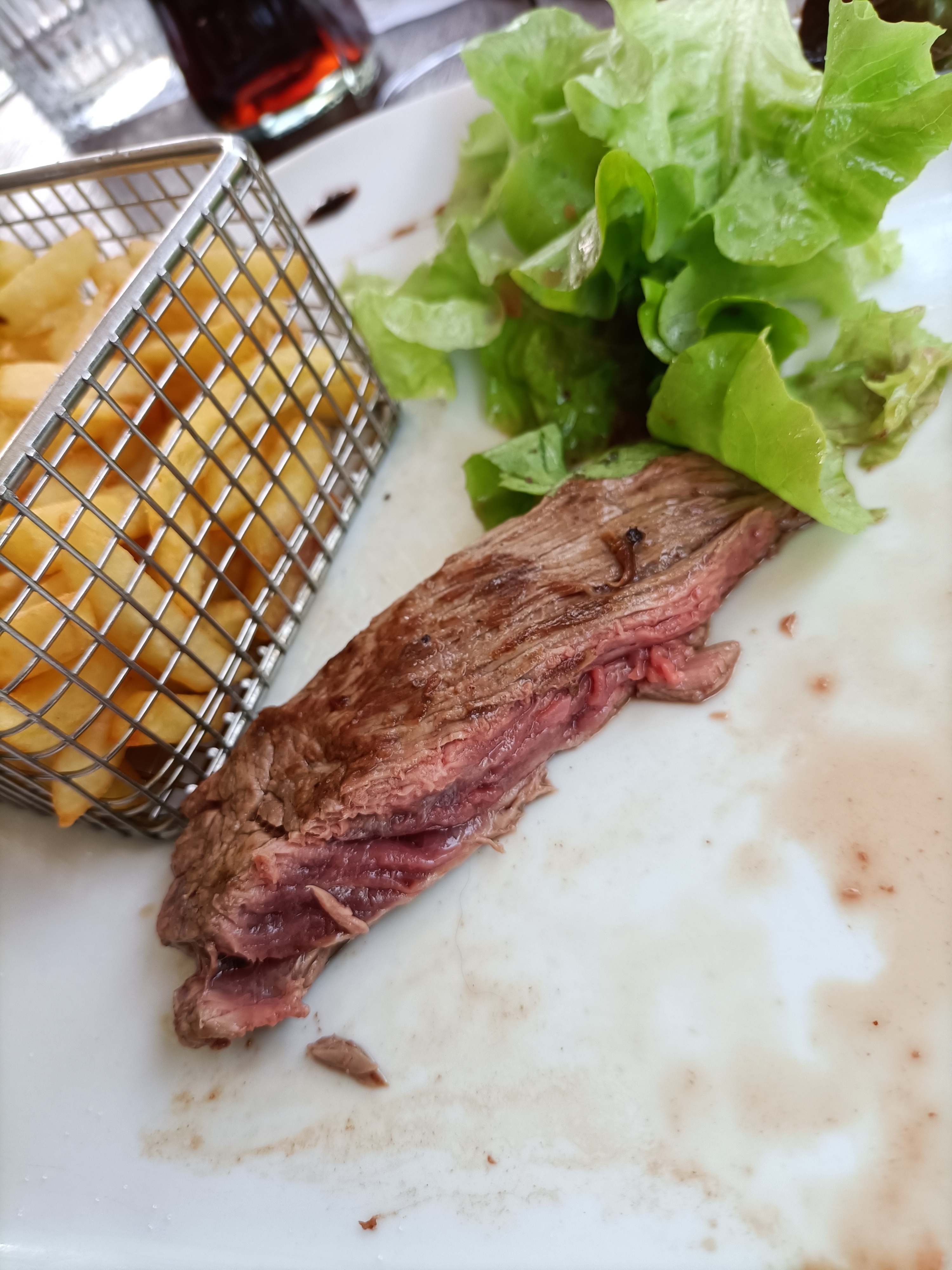 Je mets que 2 étoiles car lorsque tu as faim, que tu commandes de la bavette, qu'on te demande quelle cuisson et que tu réponds bleue, tu attends et tu t'imagines le plat. Quelle déception quand tu es servi et que tu vois 2 petits bouts de bavette minces, cramés sur une face et à peine saignants à l'intérieur avec un petit panier de frites. J'ai horreur de la viande cuite, jai mangé car j'avais faim, avec 5 tranches de pain pour couvrir le goût. Heureusement la tarte aux pommes était bonne.