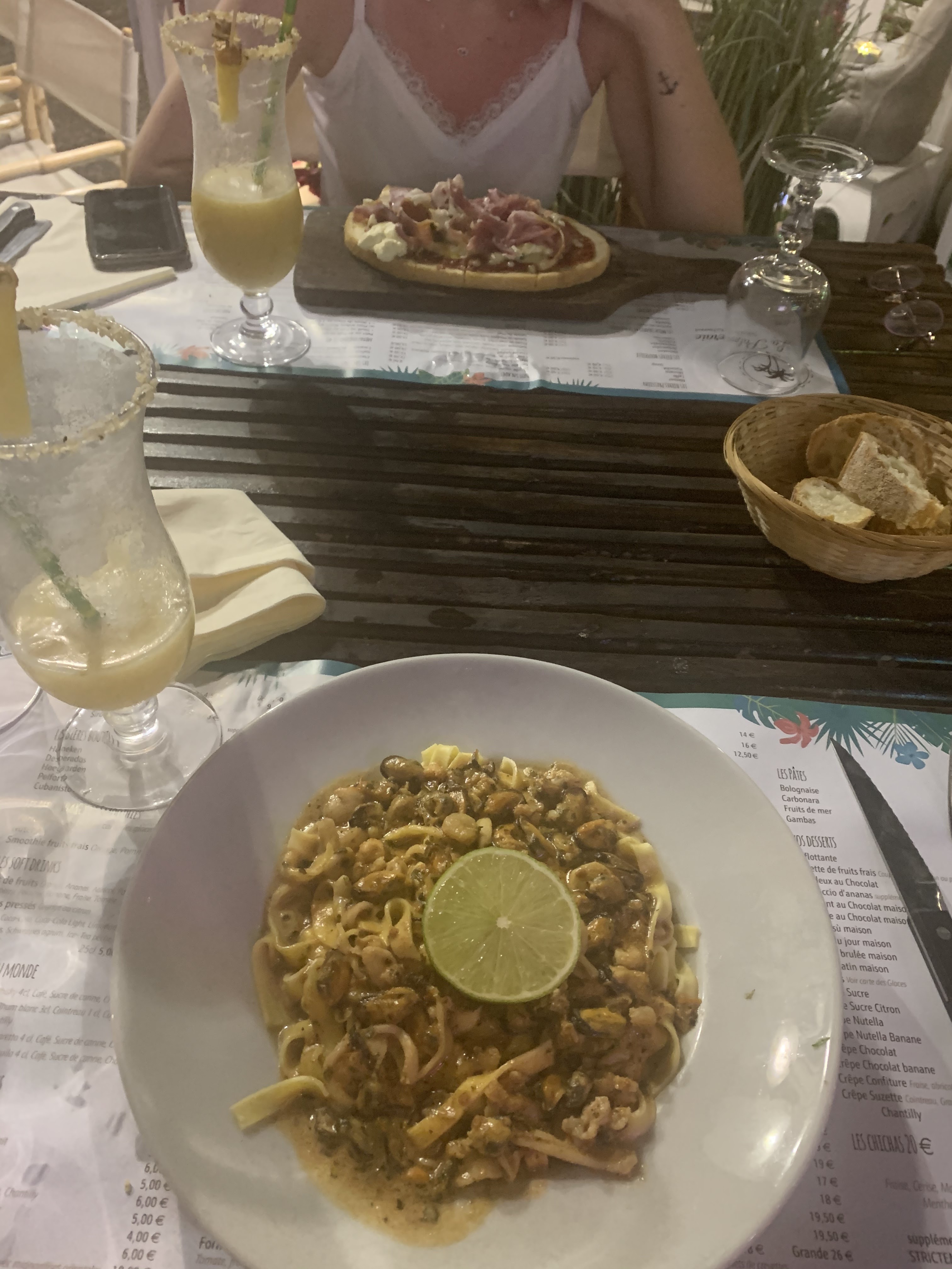1 an sépare les 2 photos ou j’ai mangé des superbes pâtes aux fruits de mer… Et malheureusement la différence est grande. Aujourd’hui vous payez 16€ pour des pâtes au beurre avec des fruits de mer surgelés par dessus, pas de sauce et quelques crevettes encore congelés… Vous aurez aussi un petit supplément coquilles de moule!!!! Bruschetta correct. Serveuse envahissante, qui ne connaît pas les produits de la carte. A contrario 1 étoile pour le serveur super sympa.