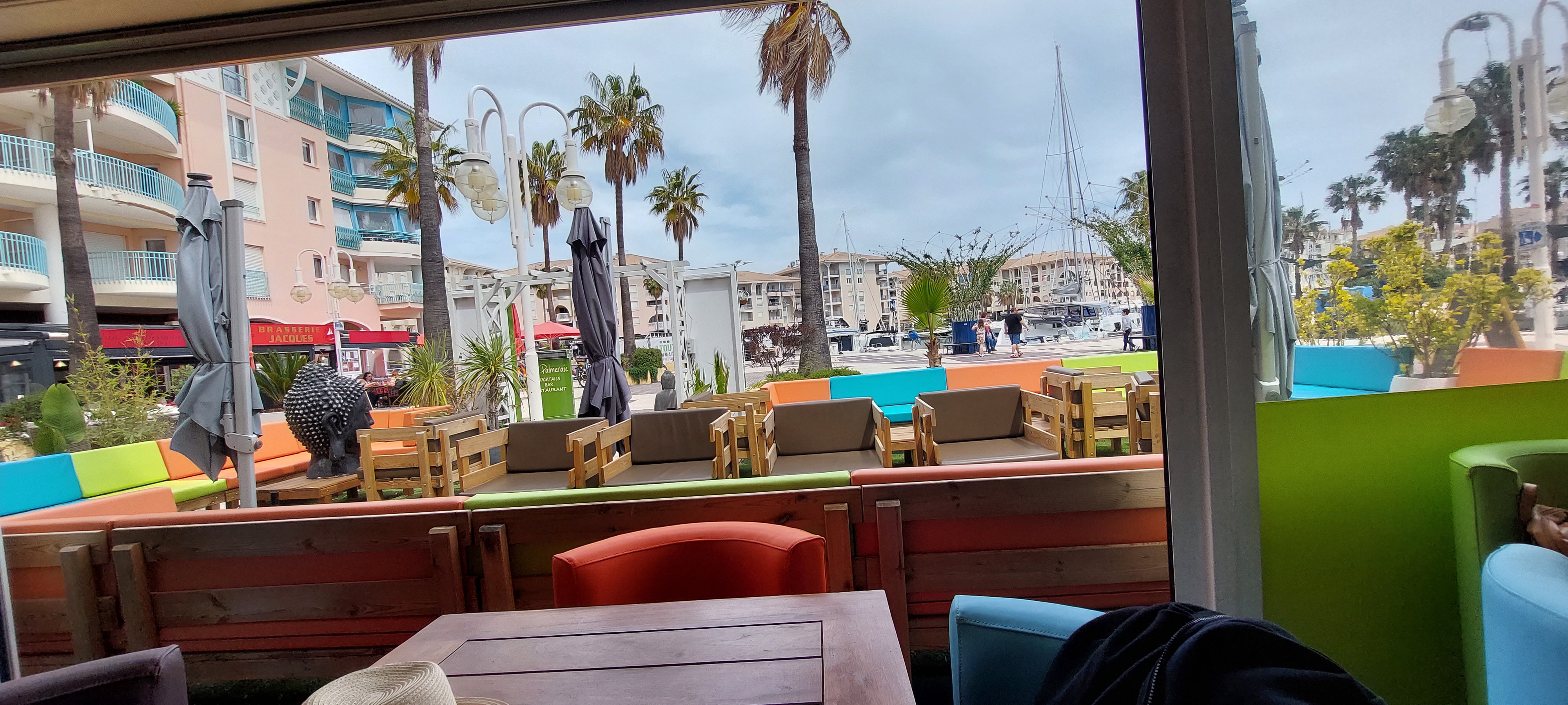 Nous nous étions arrétés pour le cadre mais... Les prix sont particulièrement excessifs pour des produits peu savoureux, pas frais . Mais le vrai problème est le service: Des serveurs peu souriants et peu accueillants qui n'aident pas les personnes qui bossent véritablement, alors que le service est à la traine et peu organisé. Il faut vraiment revoir le service clientèle et l'organisation de salle, ça ne communique pas et on attend 20 minutes pour obtenir une addition, et nous avons juste grignoté... Bref pas le meilleur endroit au port de Fréjus.