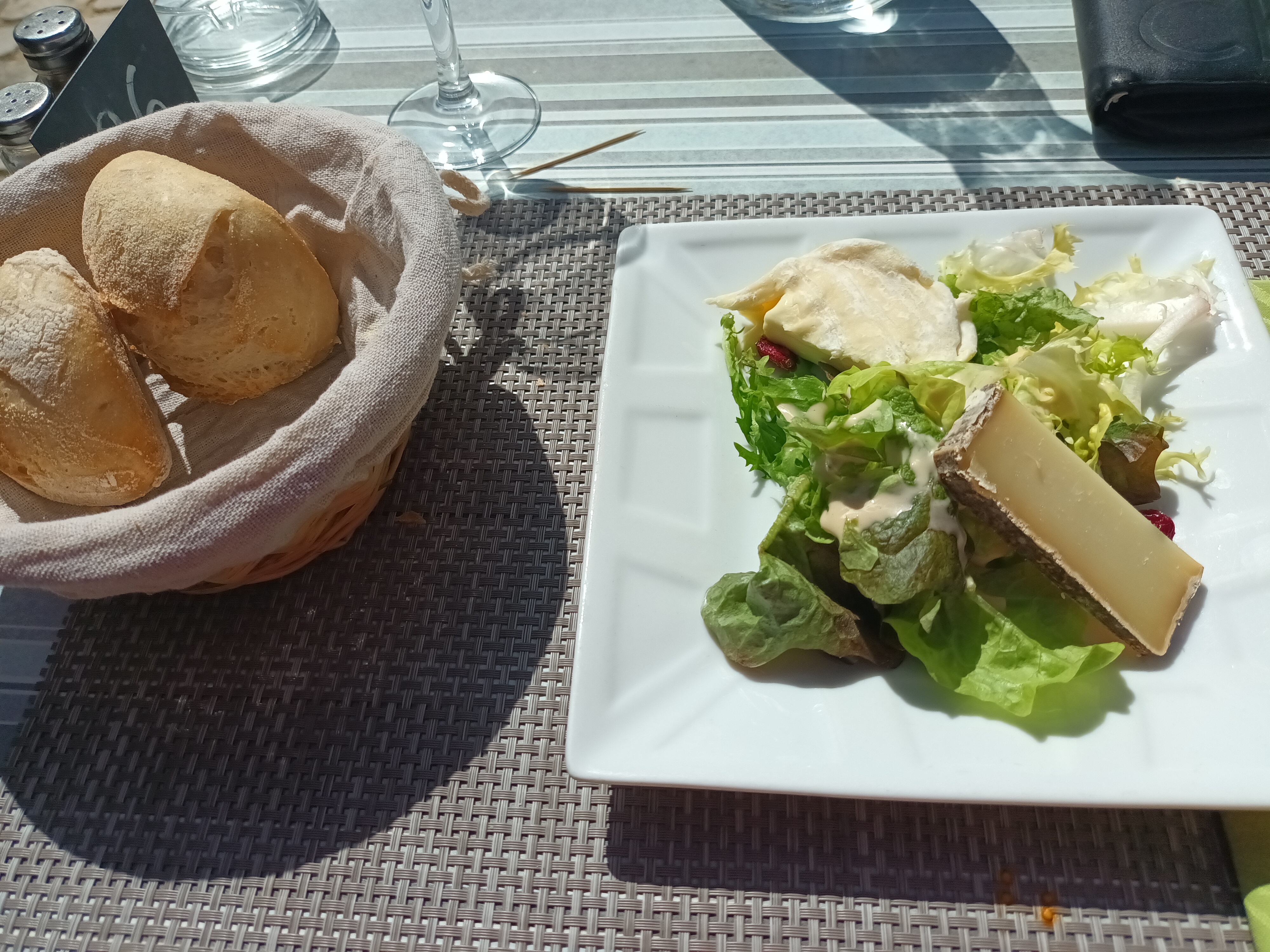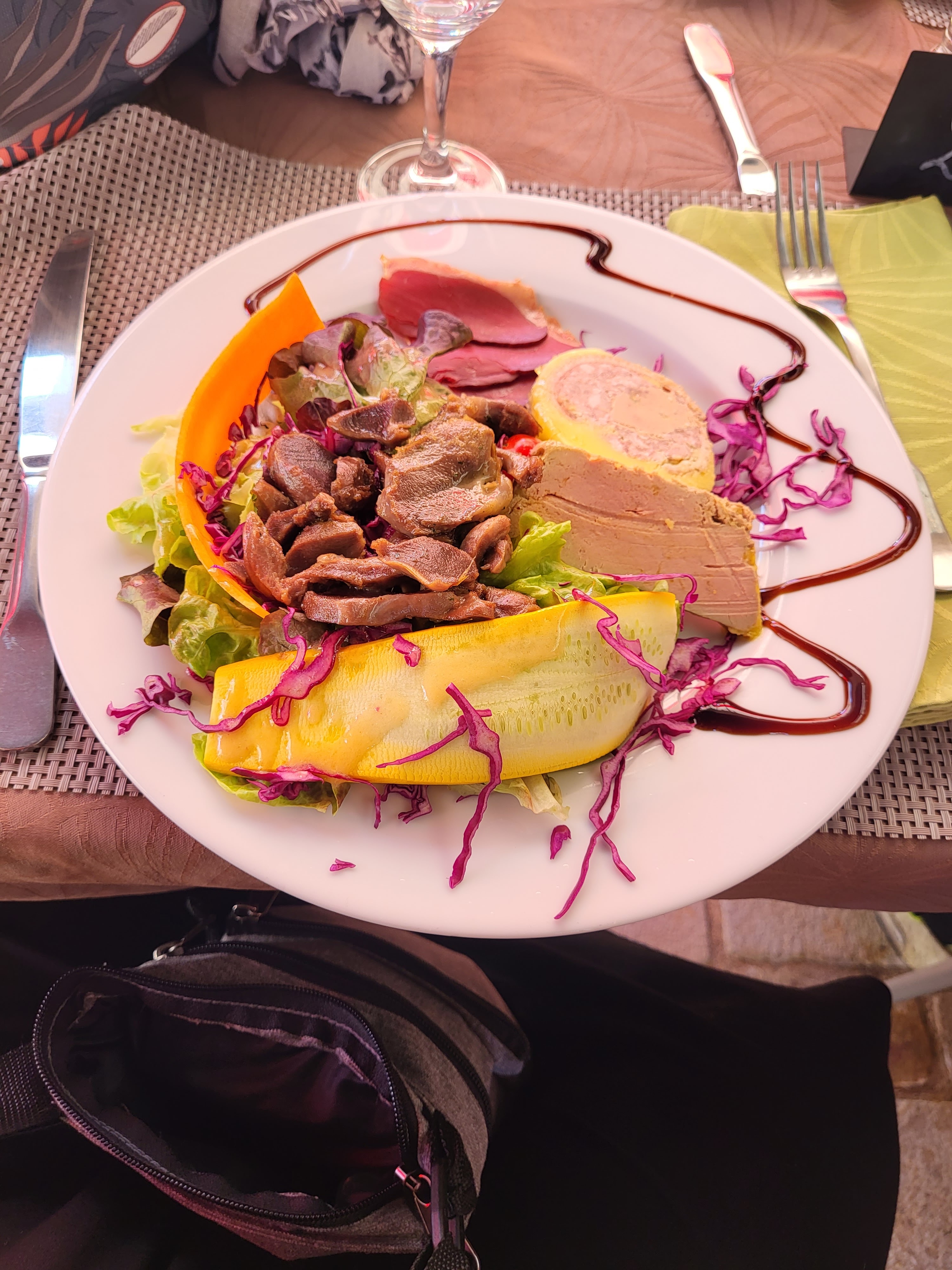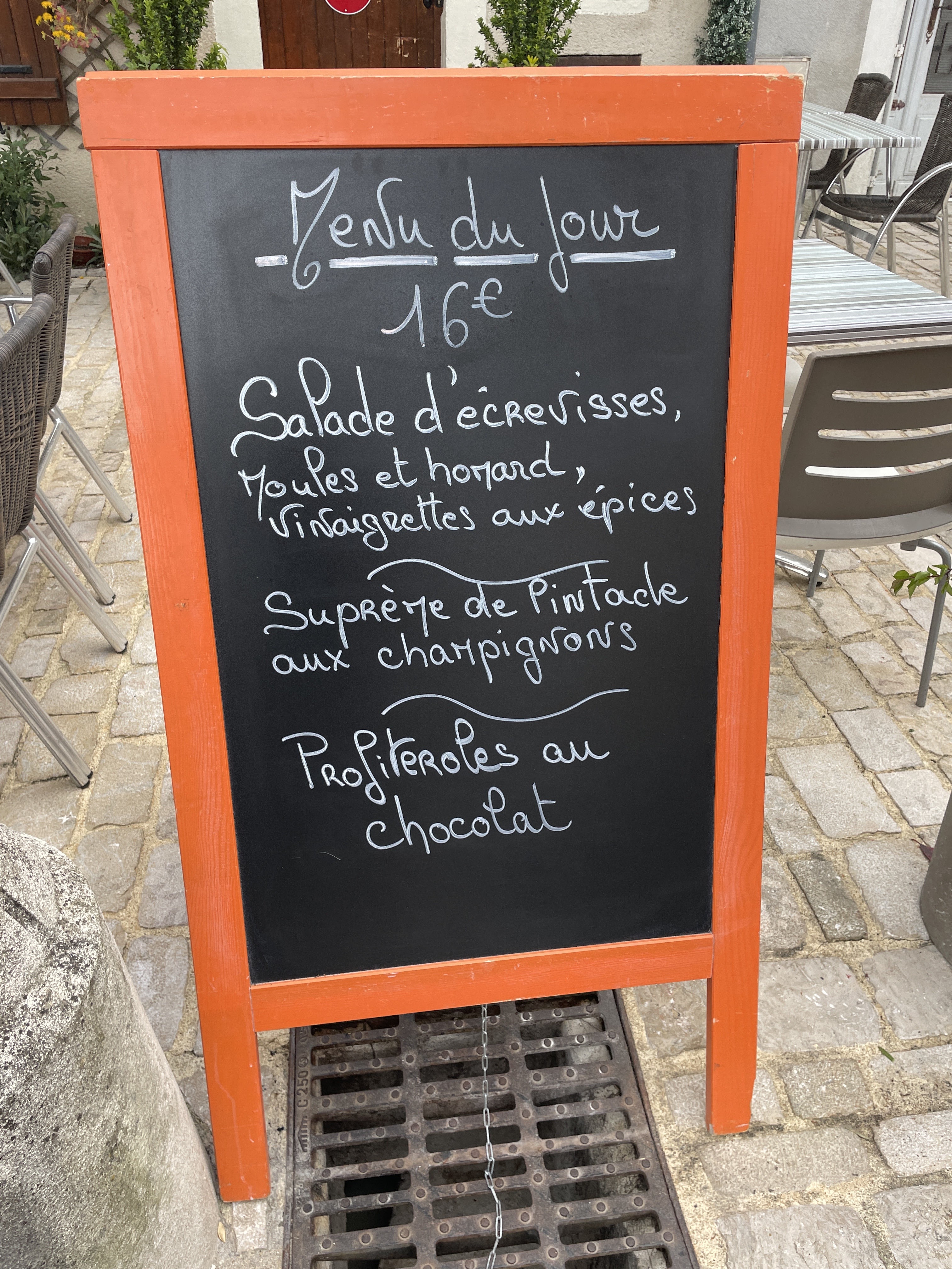 Menu du jour à 15 € sans boisson ni café. 2 cuillères à soupe de taboulé sur quelques feuilles de salade non assaisonnées. Des filets de poulet en petite quantité sur des légumes variés. Une demi-gaufre avec de la chantilly industrielle. On trouve beaucoup mieux en Périgord à ce prix.