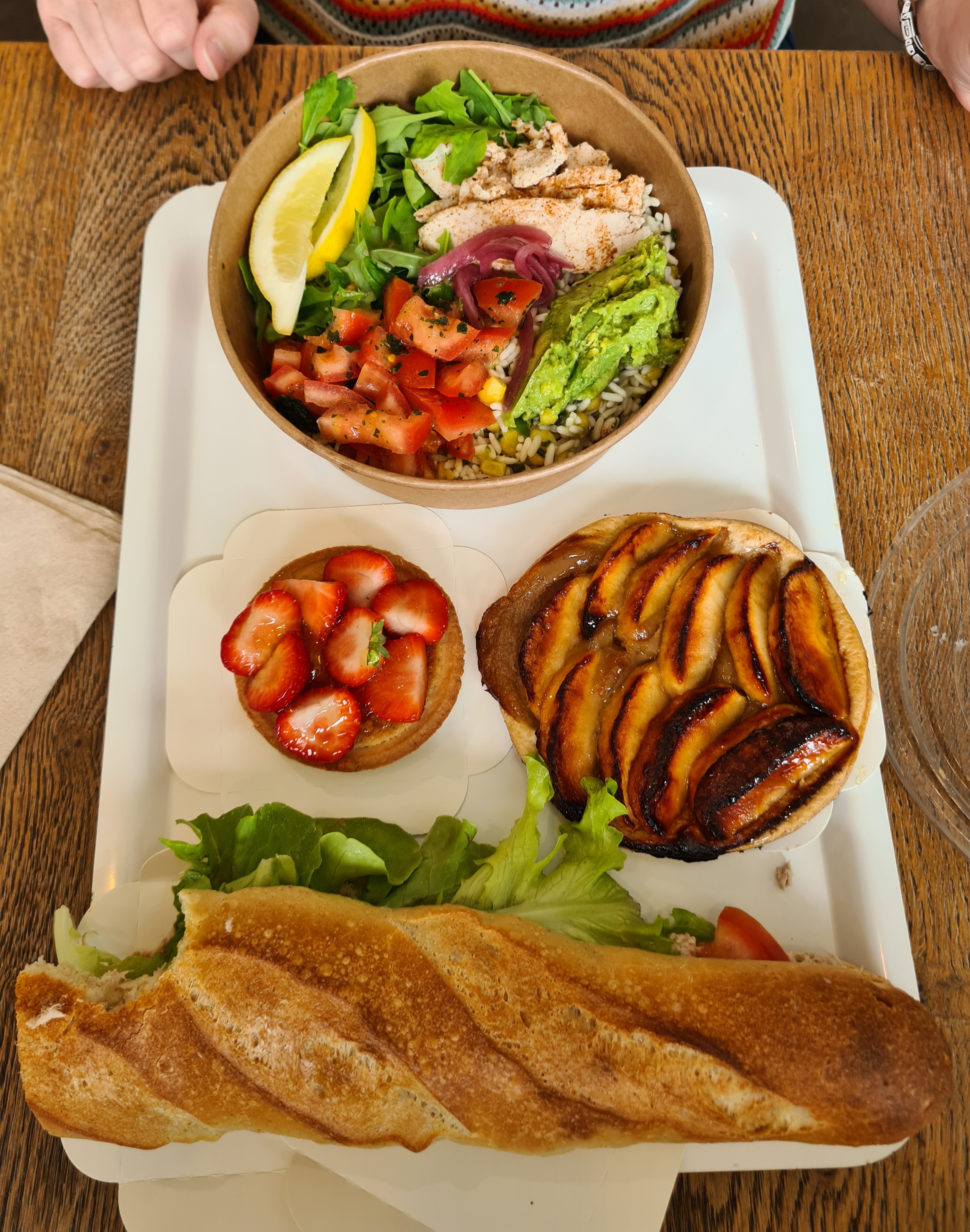Lieu où il est possible de manger sur place ou à l'emporter. Possible de payer en espèces ou avec une carte de crédit. Possible de manger aux espaces du Rez ou à l'étage. Nous avons pris un forfait menu: panière au thon/poke bowl de poulet, tartelettes aux pommes et aux fraises et boissons. Les mets étaient bons. Cependant, la propreté de la table occupée et de nos chaises n'était pas satisfaisante. Idem pour nos couverts de table.