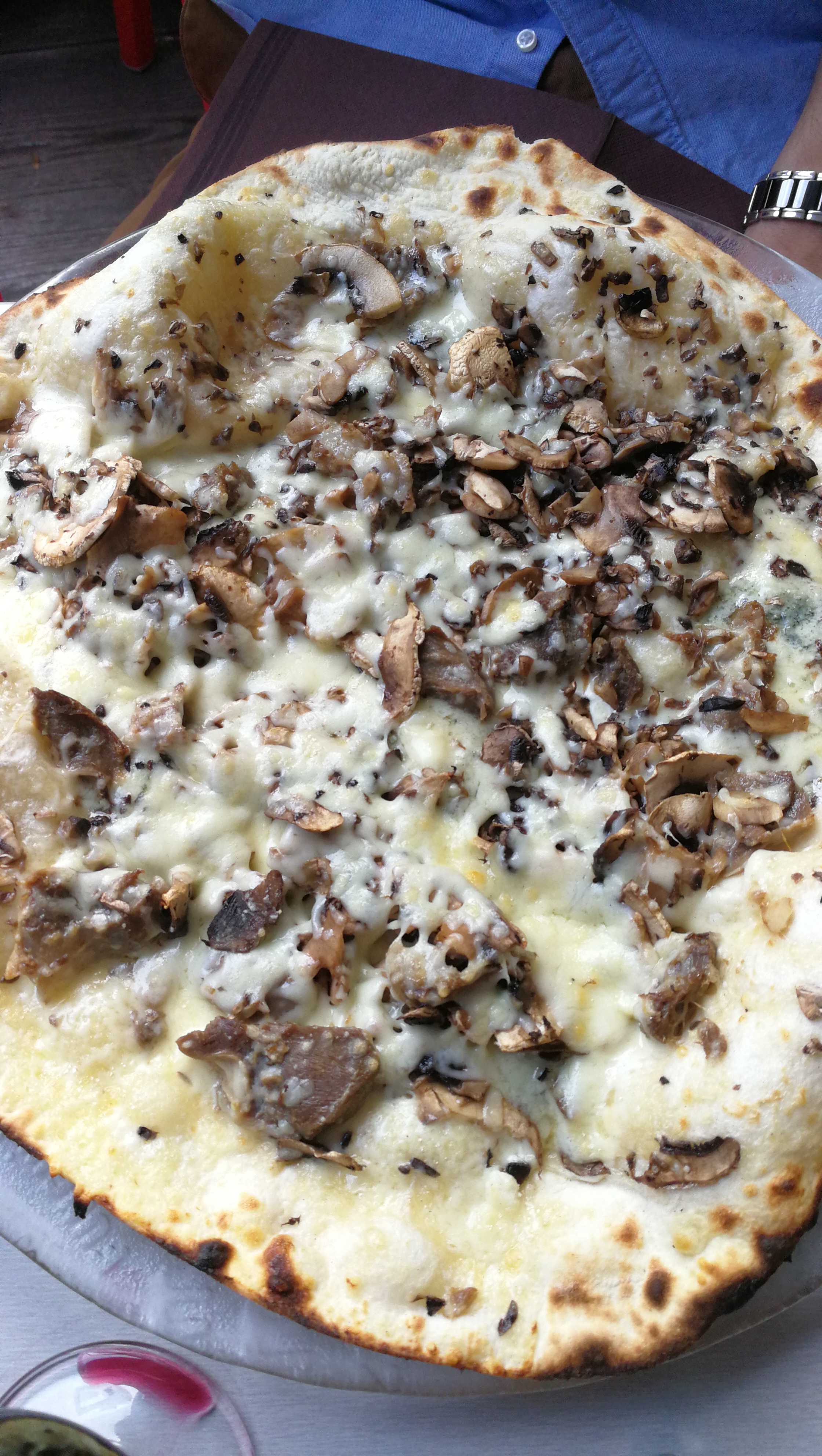 Pizza pâte fine mi cuite, aspect on a jeté les aliments dessus, goût de gruyère je n'ai pas retrouvé le goût de ce qui était annoncé ! Meilleur en dessert toute fois !! A peine l'assiette vide alors que d'autres n'ont pas fini que la table est desservie.