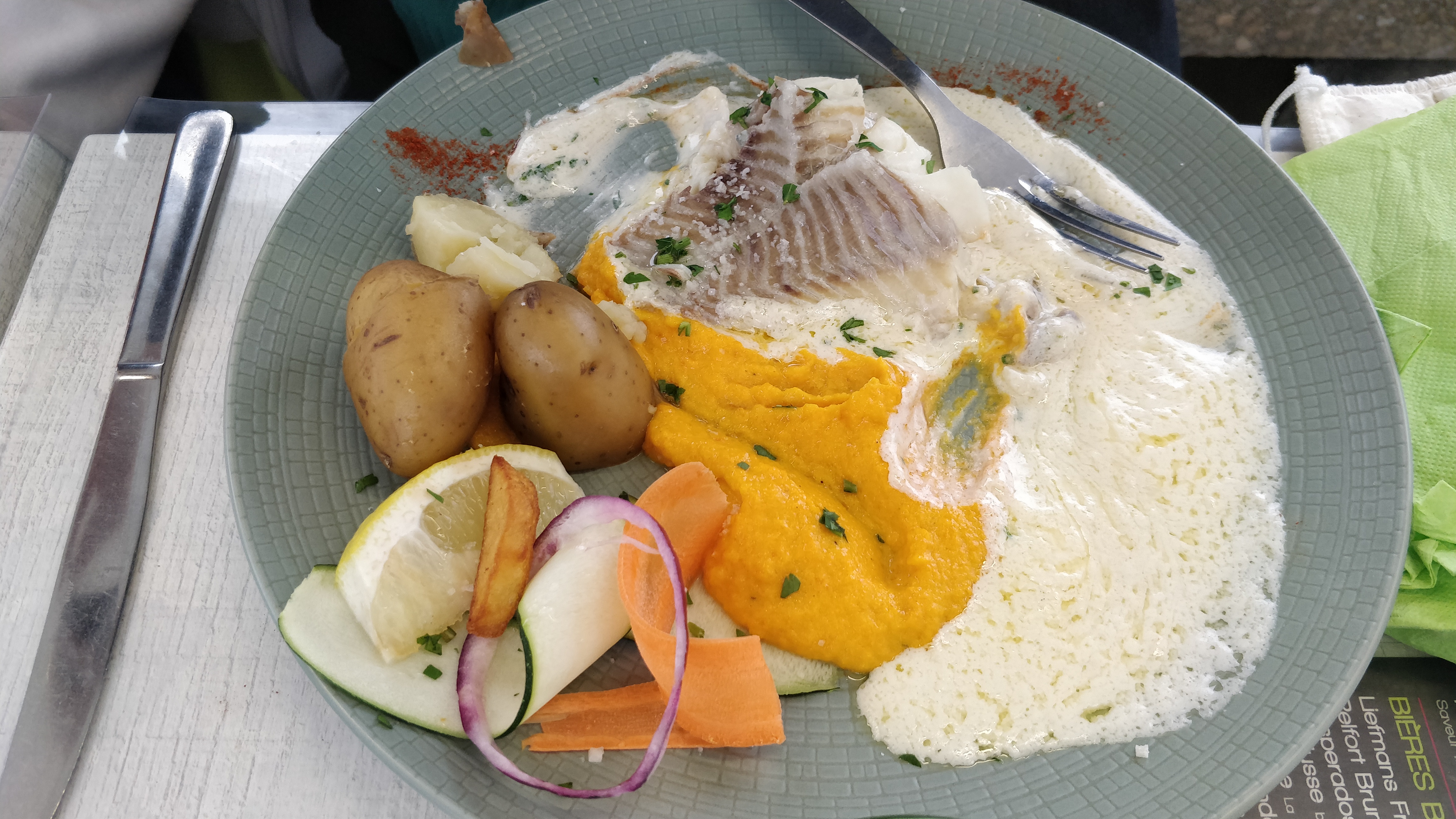 Une belle parenthèse culinaire ! Malgré un afflux de clients (c'était en période creuse), le service a été très satisfaisant. Une sauce au beurre blanc avec un merlan cuit parfaitement et une excellente purée de légumes. Ceci dans un menu entrée/plat/dessert pour 16.20 € Je conseille