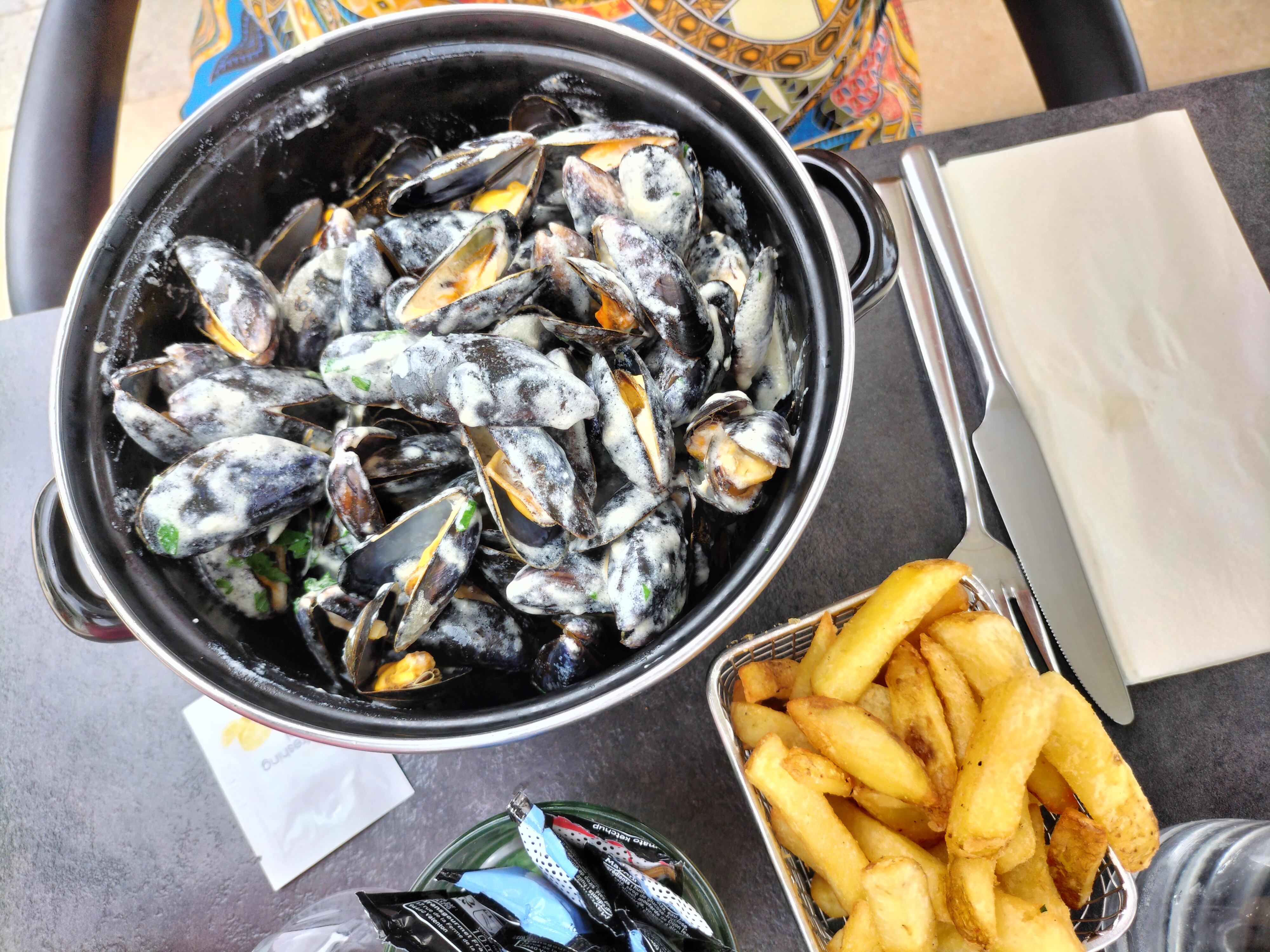 Il a fait vraiment chaud mais bon, ça peux encore aller. Nous avons commandé 2 kirs. Nous avons à peine eu le temps de trinquer que les moules marinières sont arrivées et la serveuse nous retire les cacahuètes... les moules non triées, beaucoup de cassées. On a fait le plein de coquille 😐. Malgré la chaleur, on a été obligé de demander une carafe d'eau. Accueil moyen. Je ne suis pas difficile mais je suis obligé de publier cet avis qui j'espère sera constructif pour le restaurant...