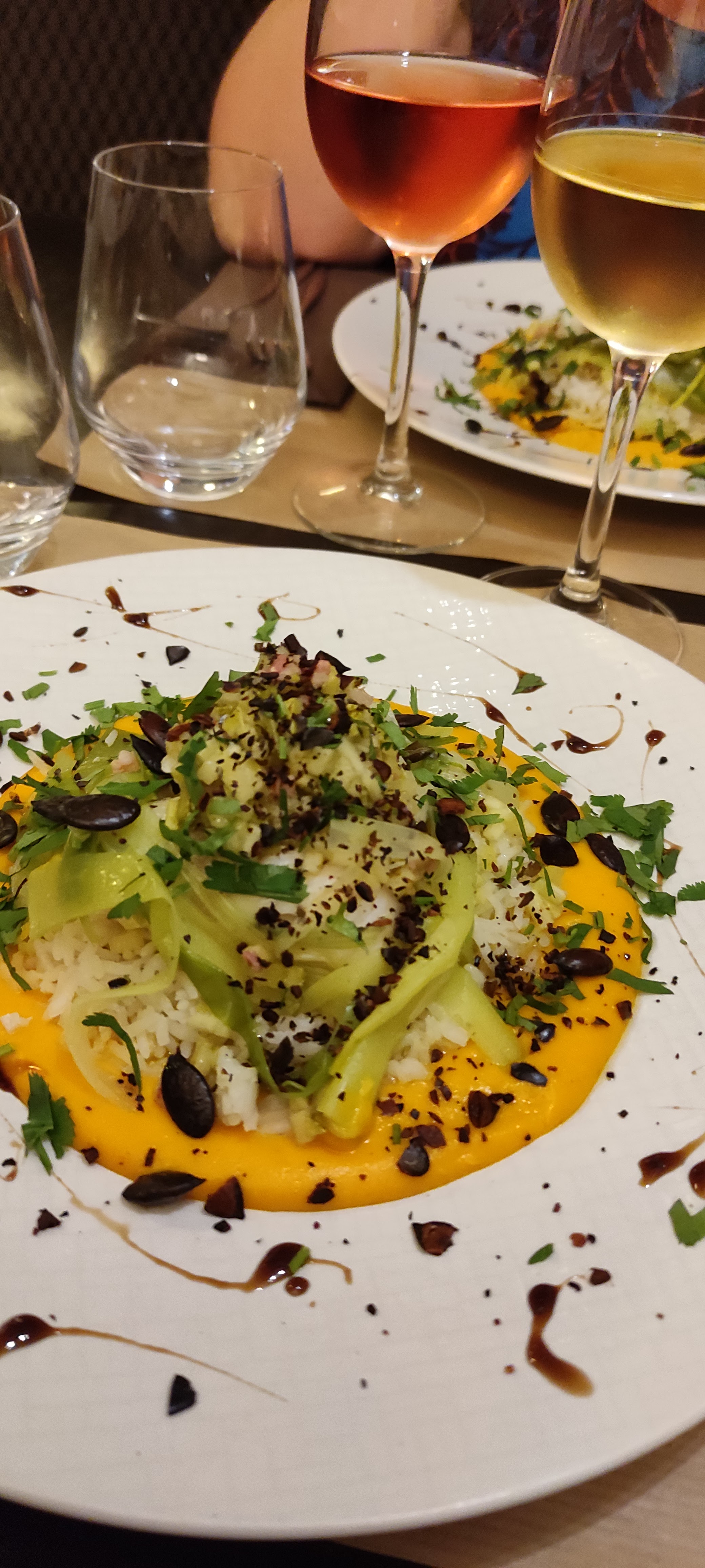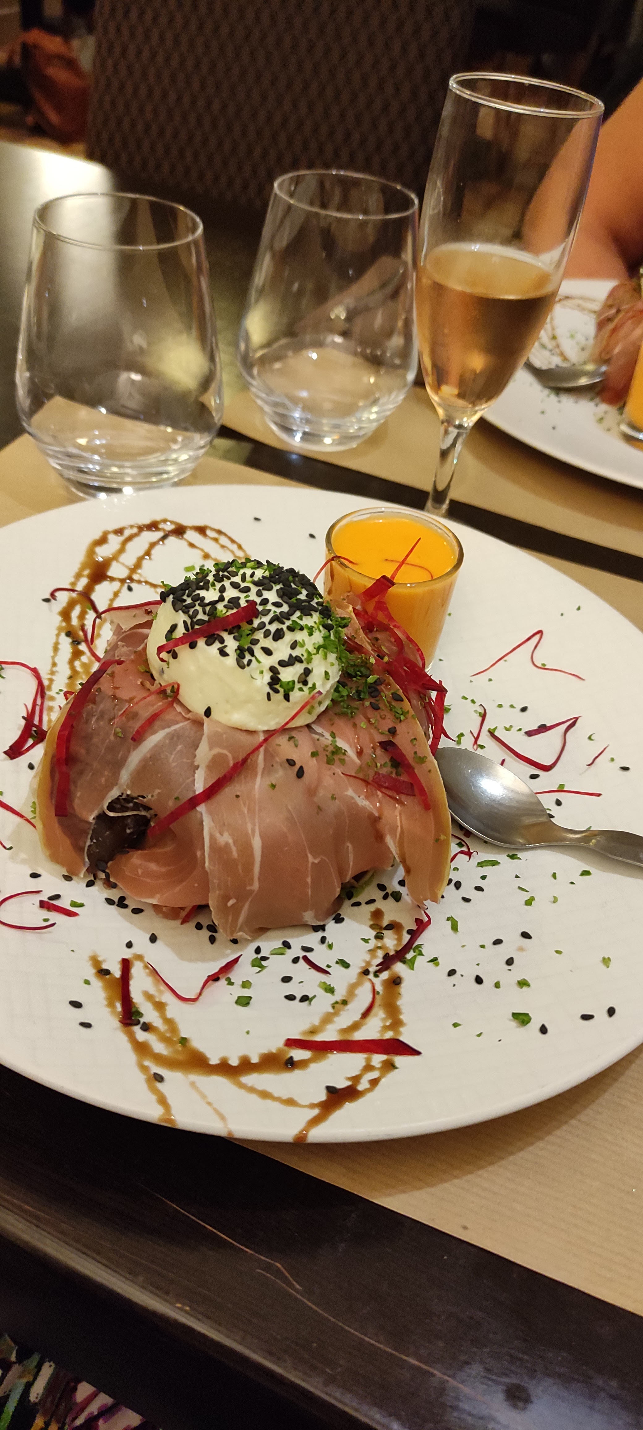 Belle expérience a deux pour le dejeuner. Nous nous sommes régalés. Belles assiettes. Service impeccable . Souriant malgré qu ils soient que deux