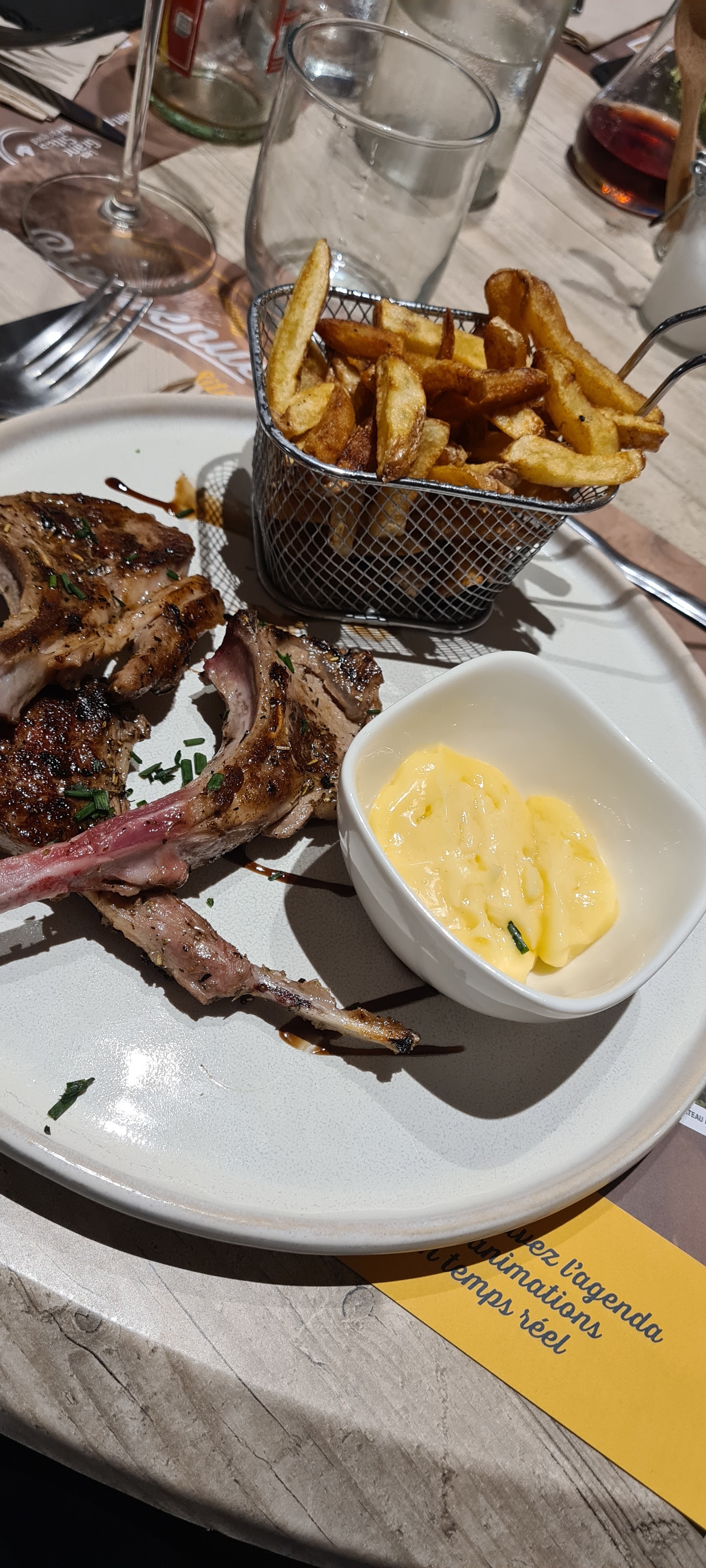 Pour commencer, le cadre est magnifique avec un intérieur en pierre apparente, et une belle terrasse couverte ou non à l'extérieur. L'attente a été longue, mais visiblement on n'a pas eu de chance suite à une absence en cuisine. Cependant les côtelettes d'agneau etaient cuites parfaitement, le burger délicieux et les frites à tomber !!! Petit cocktail très frais et bon Merci