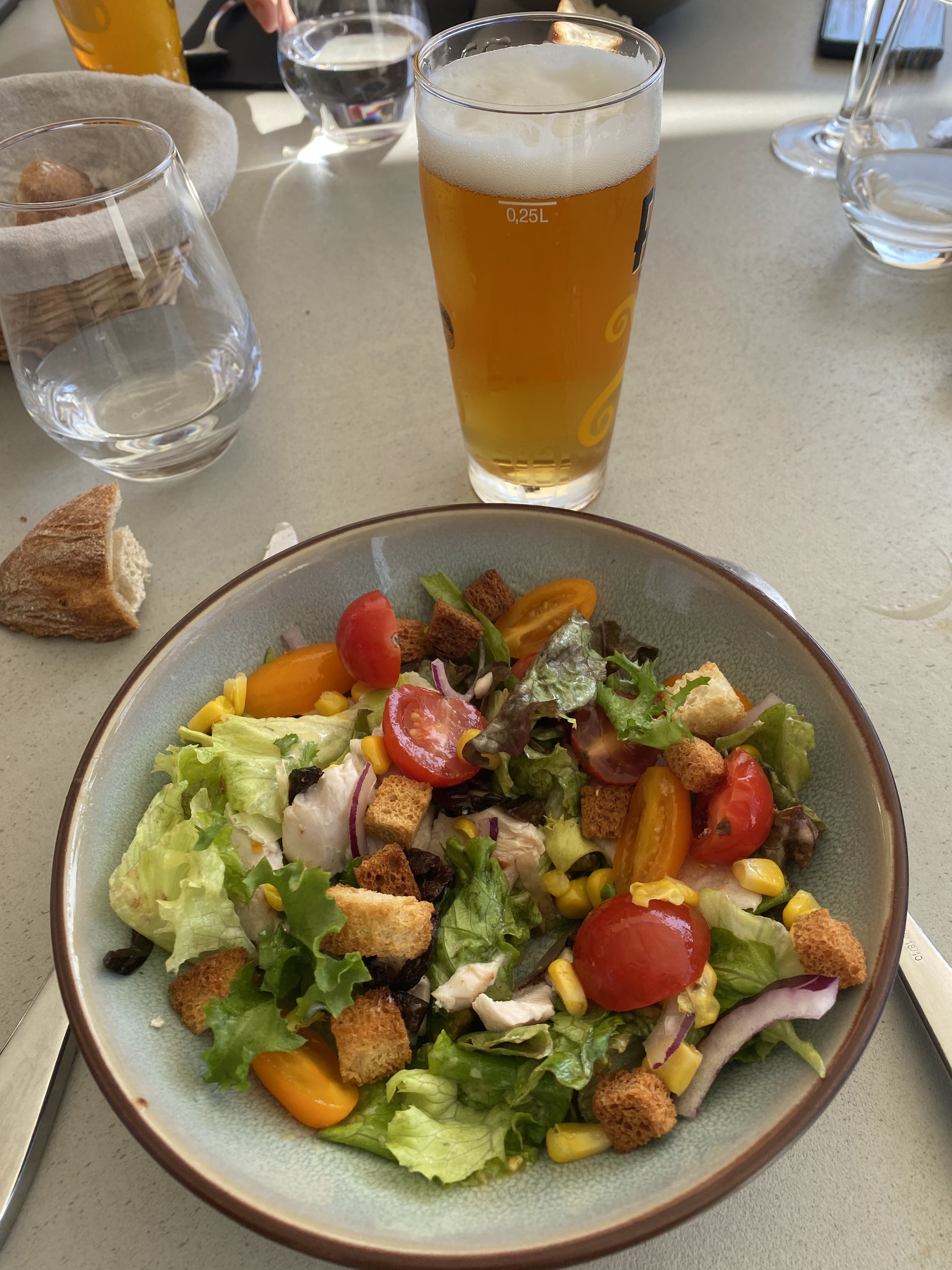 Si vous avez faim passez votre chemin, vous allez payer 15€ une salade verte très très light. On a demandé 2 corbeilles de pain pour ne pas avoir à commander un dessert à 9€ qui nous aurait déçu. La responsable en fait trop et à trop vouloir être gentille ça sonne faux. Nous sommes 5 personnes en formation à côté toute la semaine et bien c'est la seule fois que vous nous verrez.