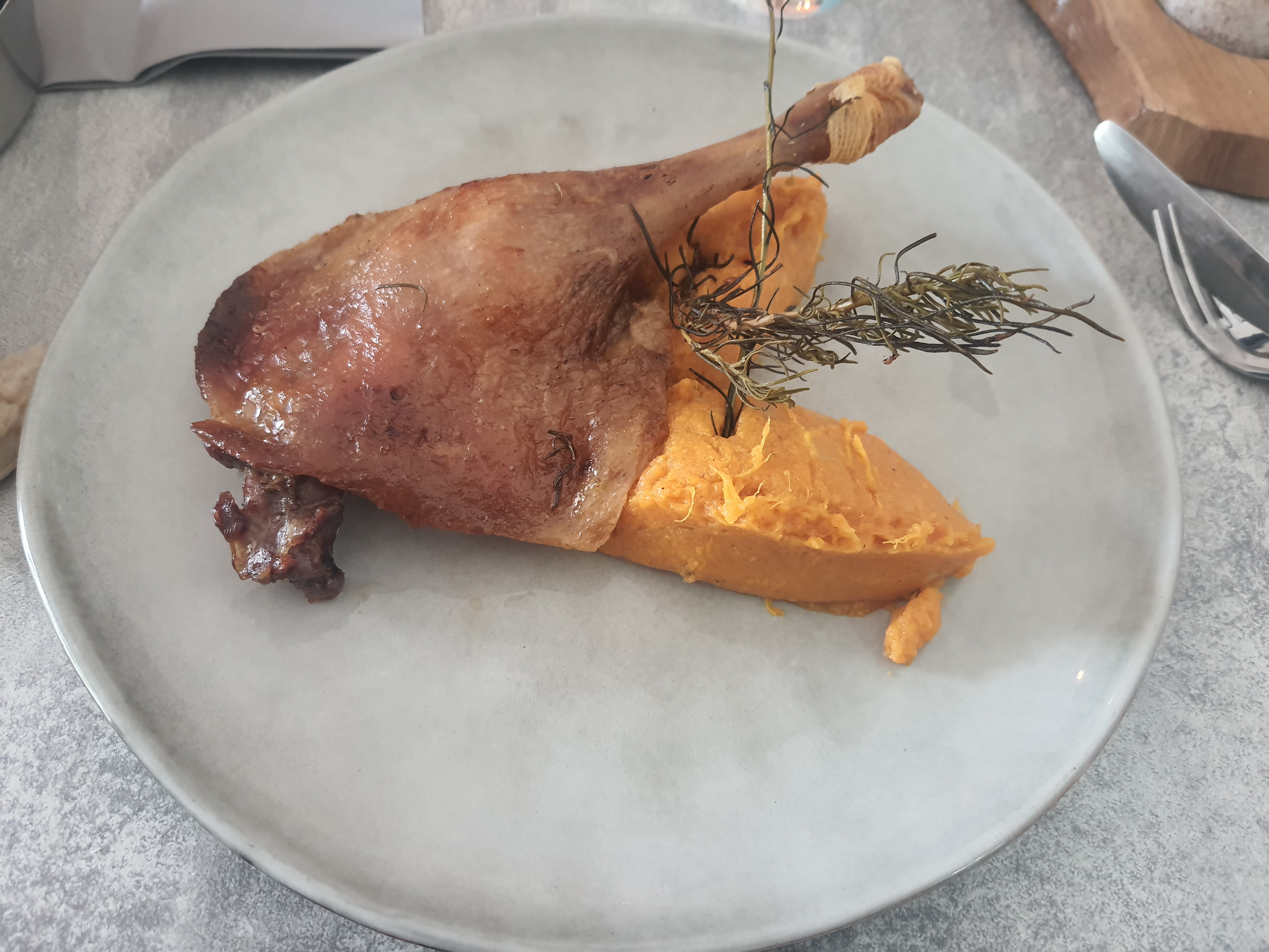 Parking facile d'accès. Une belle terrasse plutôt bien ombragée qui va permettre de beaux repas extérieurs. La salle intérieure est assez grande et les tables bien espacées. Plat servi dans une grande assiette qui donne l'impression que l'on ne va pas en avoir pour sa faim mais en réalité c'est copieux. Et très bon !!! Une cuisse de canard bien confite !! Serveuse et patron/cuisiner agréables et à la bonne humeur