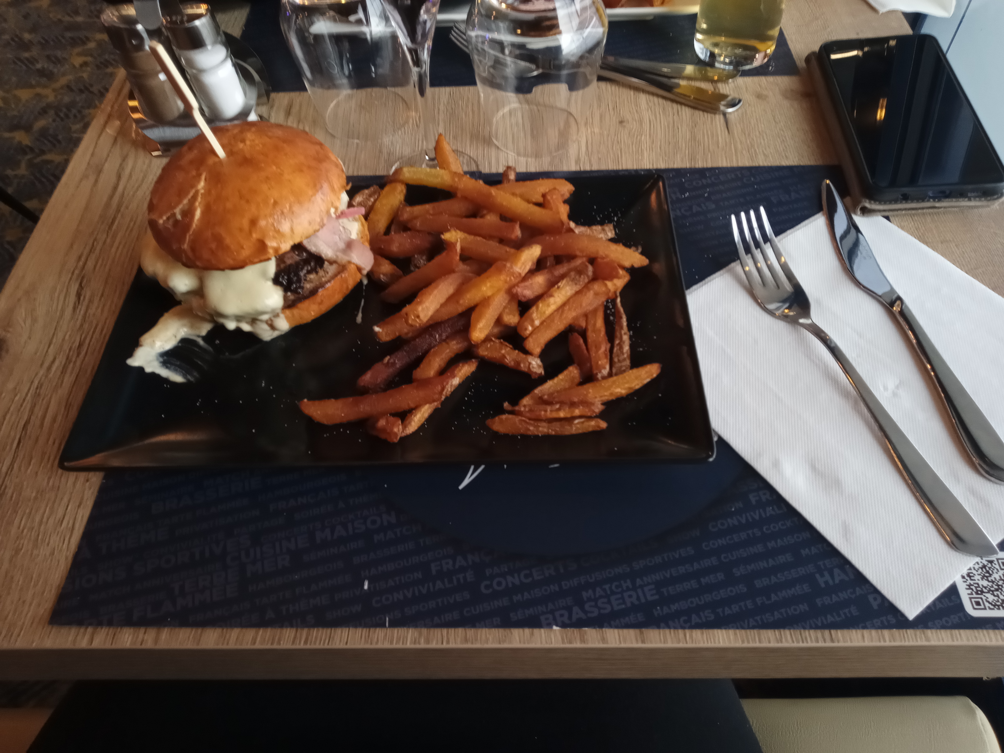 Cadre sympathique et accueillant, nous avons pu choisir notre table et avons été confortablement installés. La serveuse est rapidement venue prendre notre commande mais l'apéro a quand même tardé à arriver ! Nous avons bien mangé et en quantité largement suffisante pour un soir. Juste dommage que le steak du burger soit arrivé trop cuit alors qu'il a été commandé saignant. Personnel sympathique, tarifs un peu cher pour de la brasserie mais nous reviendrons certainement