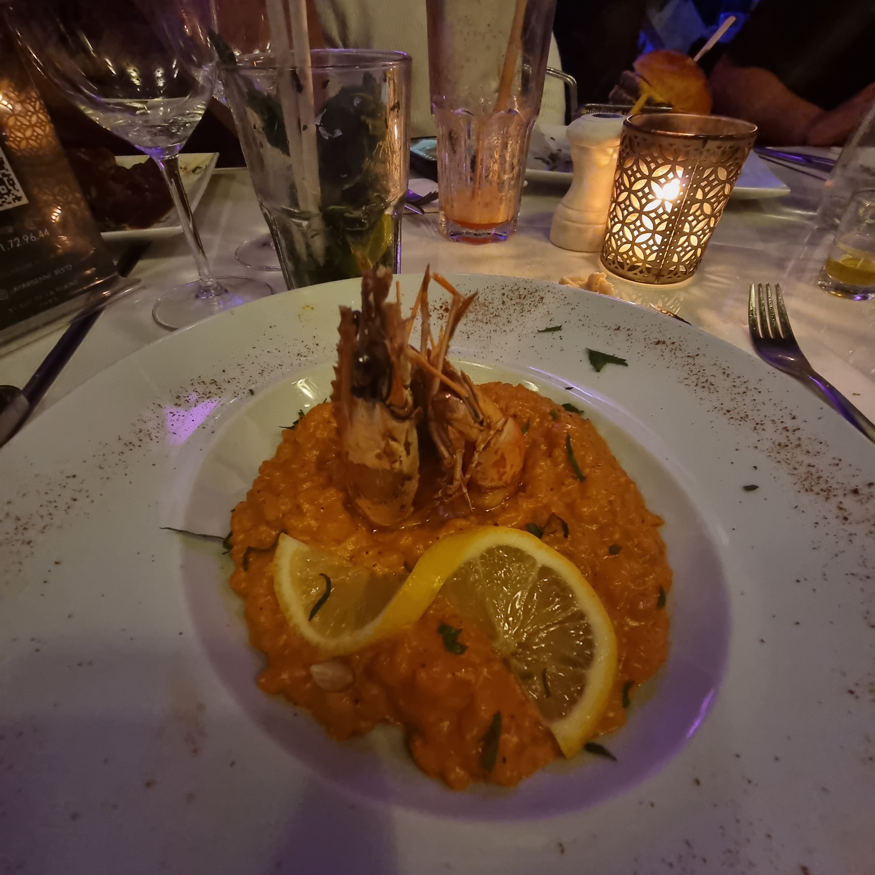 C'était un réel plaisir de manger dans ce restaurant ! L'accueil est au top, le personnel est accueillant, souriant, disponible. De l'entrée au dessert je n'ai pas été déçu vraiment c'était extrêmement délicieux, j'ai pris un risotto de gambas succulent !!!!! C'est rare de tomber dans un restaurant où tout est parfait du personnel au repas ! Et l'ambiance tamisée j'aime beaucoup! Le restaurant la Parisienne vous méritez amplement les 5 étoiles même plus !!!!!!