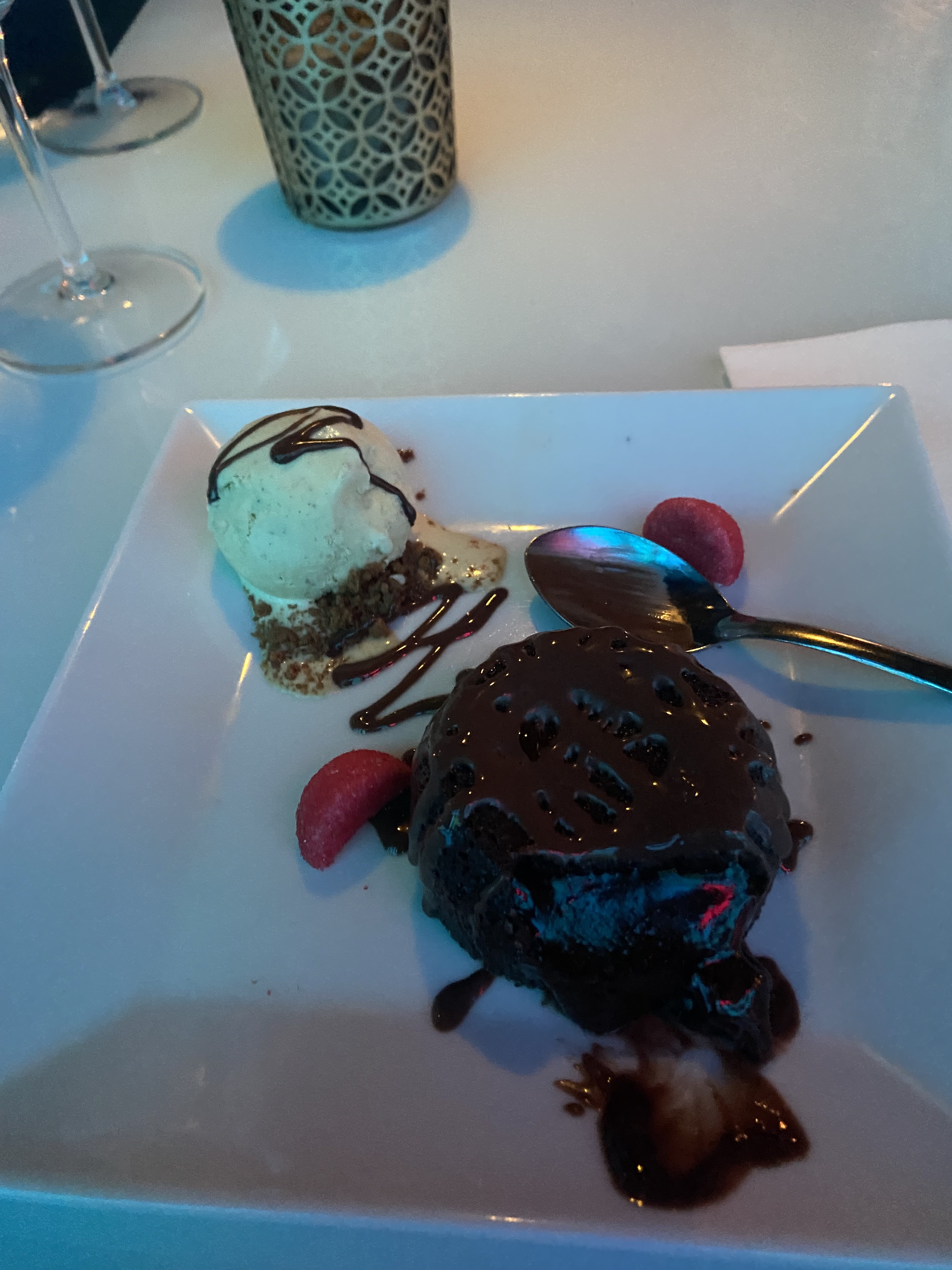 Triste pour mon anniversaire surprise. Le cadre était plutôt jolie mais la soirée tourna mal petit à petit. La serveuse ne retenait pas nos commandes malgré les avoir notées (étant revenu nous voir plusieurs fois). Mon plat principal n’était pas très chaud mais sa ne me dérangeais pas, ça restait bon malgré tout. Une fois montée à l’étage pour la chicha avec mes amies, nous avons longuement attendu quand la musique “Happy Birthday” passe, ne me doutant pas que c’était pour nous. Le serveur arrive jusqu’à notre table avec le gâteau puis fait demi tour. Donc surprise gâchée. Il revient une seconde fois en catimini pour limite nous le jeter. Les filles et moi étions également déçue de l’aspect final du gâteau d’anniversaire. Nous avons donc écourter notre soirée...dommage.