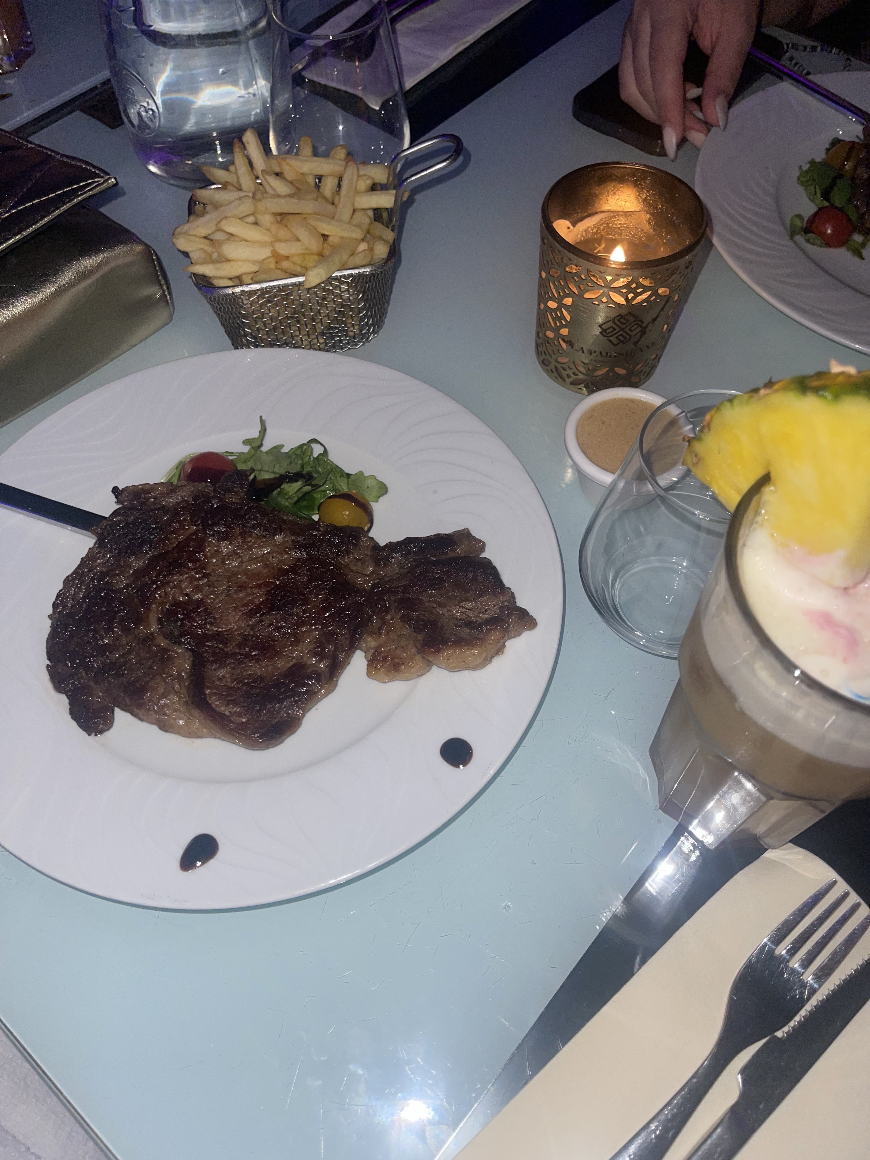 Plus jamais ! Entrecôte huileuse jusqu’à à avoir mal au ventre, salade césar poulet pire que sec, chicha goût tabac et charbon, frites du mac do. Le manager agressive qui parle comme Kaaris. Il prenne pas la cb prévienne 30min avant la resa. Par contre le serveur Julien très gentil s’est bien occupé de nous malgré tout.
