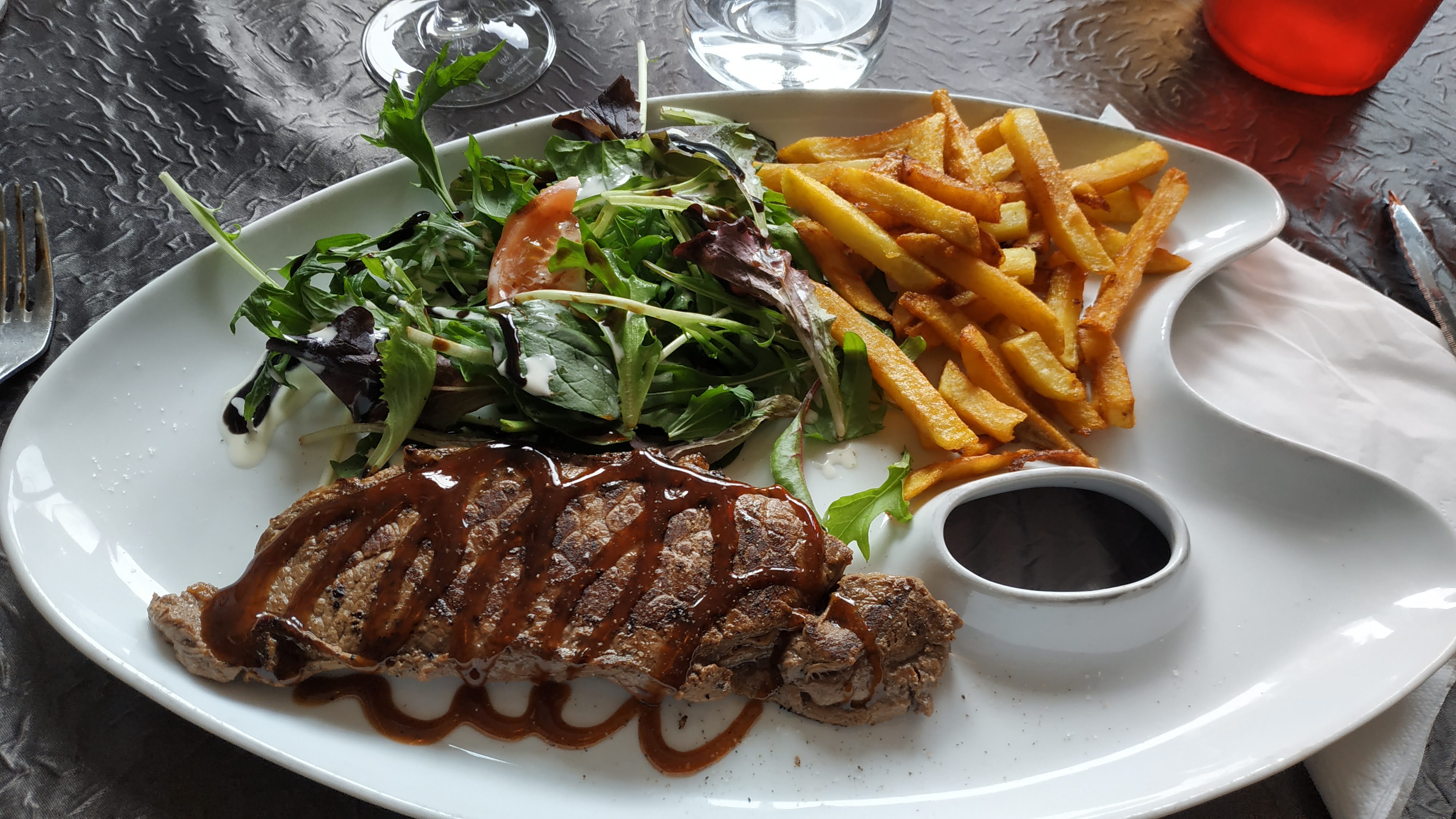 petit restaurant mais très jolie décoration. le repas , rien d exceptionnel mais bon, par contre nous étions un groupe et 2 personnes ont pris des frites et 5 euros l assiette, je trouve que cela est un peu abusé. le service , bien , la serveuse qui je crois etait la patronne est super bien organisé et garde le sourire malgré le travail .