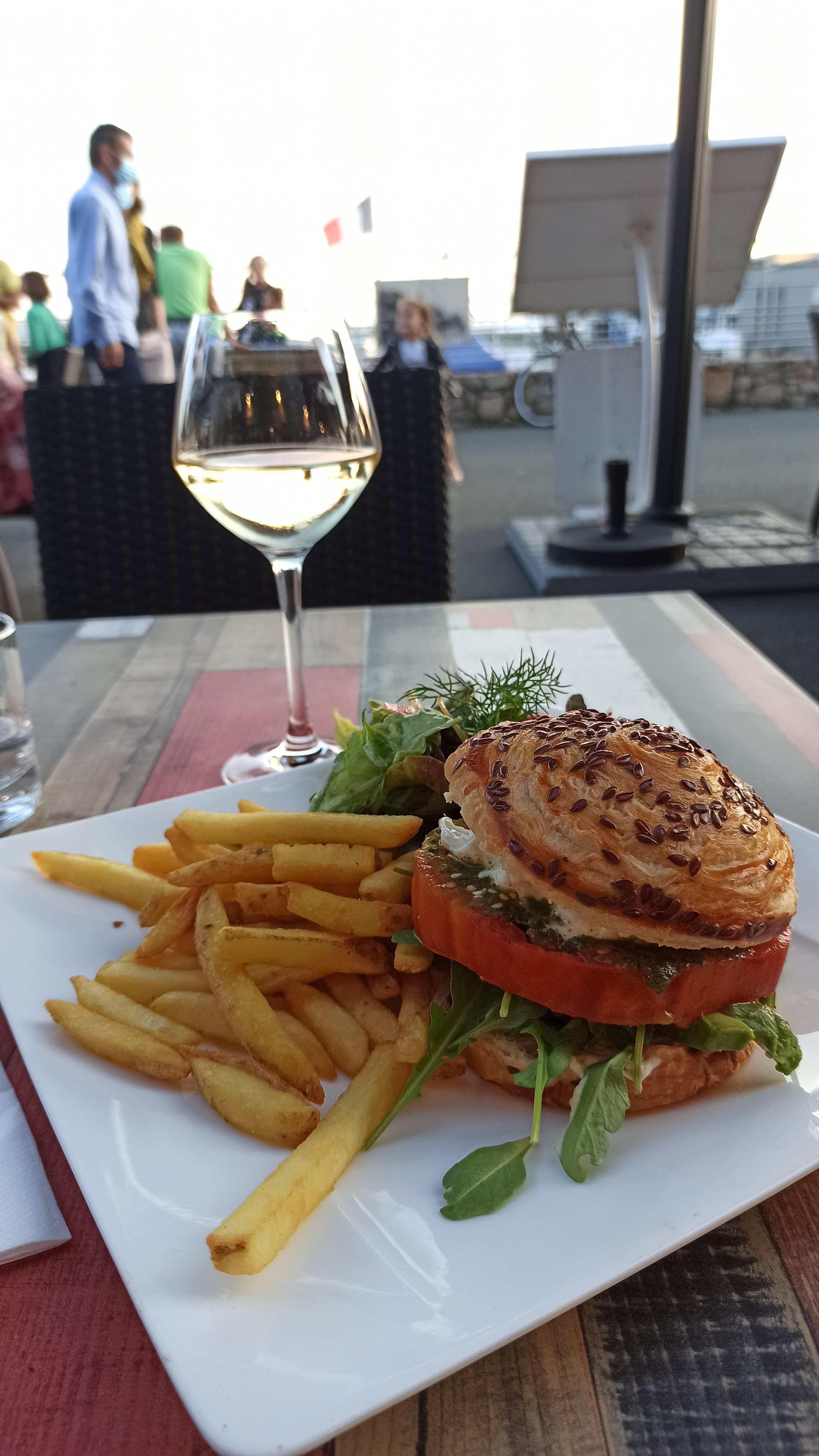 Cadre idéal face au port et au soleil couchant. Prise de commande et service boissons rapides ainsi que les plats. Les burgers (buns & Roll) veges sont très originaux et franchement délicieux. Le vegan bowl est très bon aussi ( 3 choix végétaliens pour les plats dans ce restau ! Ça fait plaisir !) . Il y a meme un dessert vegan du jour ( moelleux chocolat , délicieux même si un peu petit. J’avais tellement mangé avant que ca n’etait pas grave). Un peu d’attente pour les desserts et les carafes d’eau. Mais il y avait tellement de monde que c’est compréhensible même si évitable. Personnel agréable.