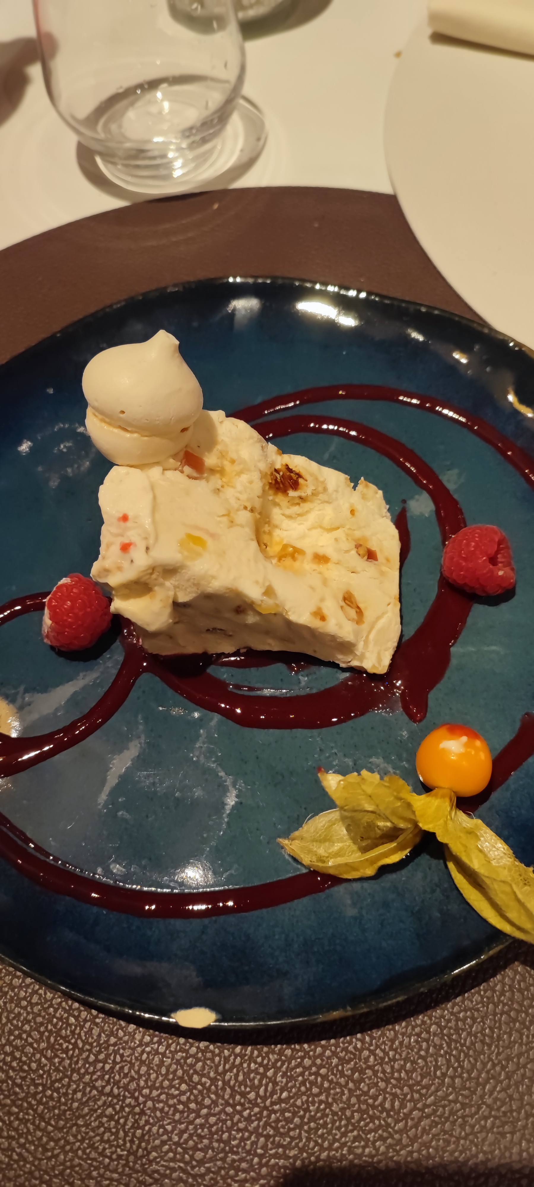 Des mets simples mais mis en valeur avec de jolies surprises. Amuses bouches sympathiques ..nougat glacé à tomber services très agréable mais un peu long