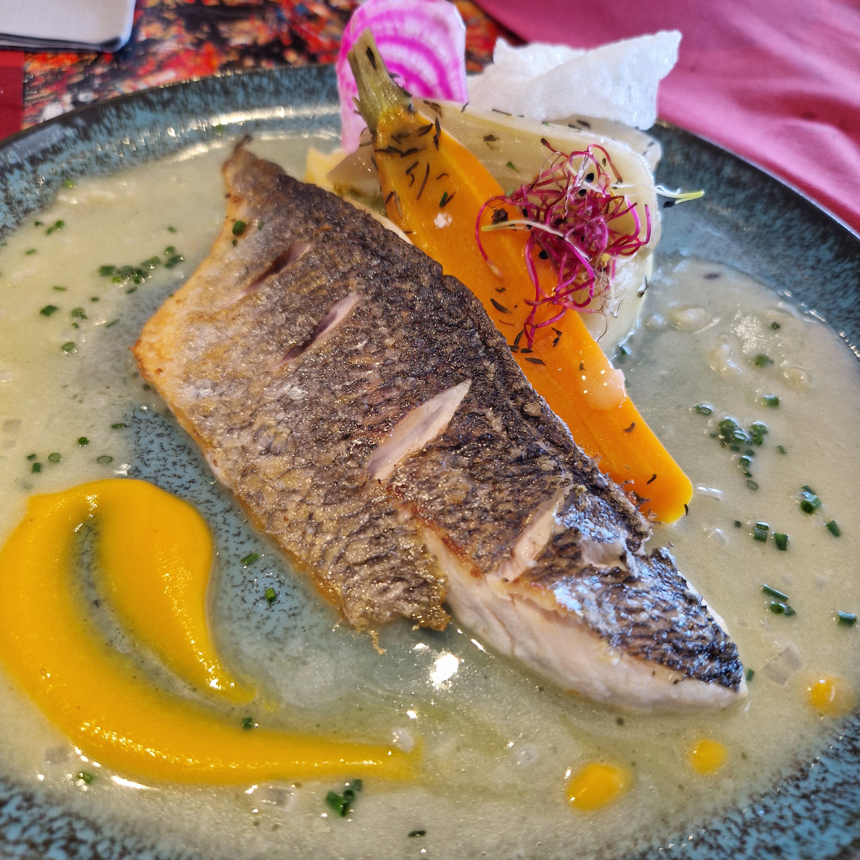 Beau restaurant, cadre magnifique. Dans les assiettes un festival de saveurs. Un personnel fort sympathique et à vos petits soins. Merci à cette jeune équipe 😉