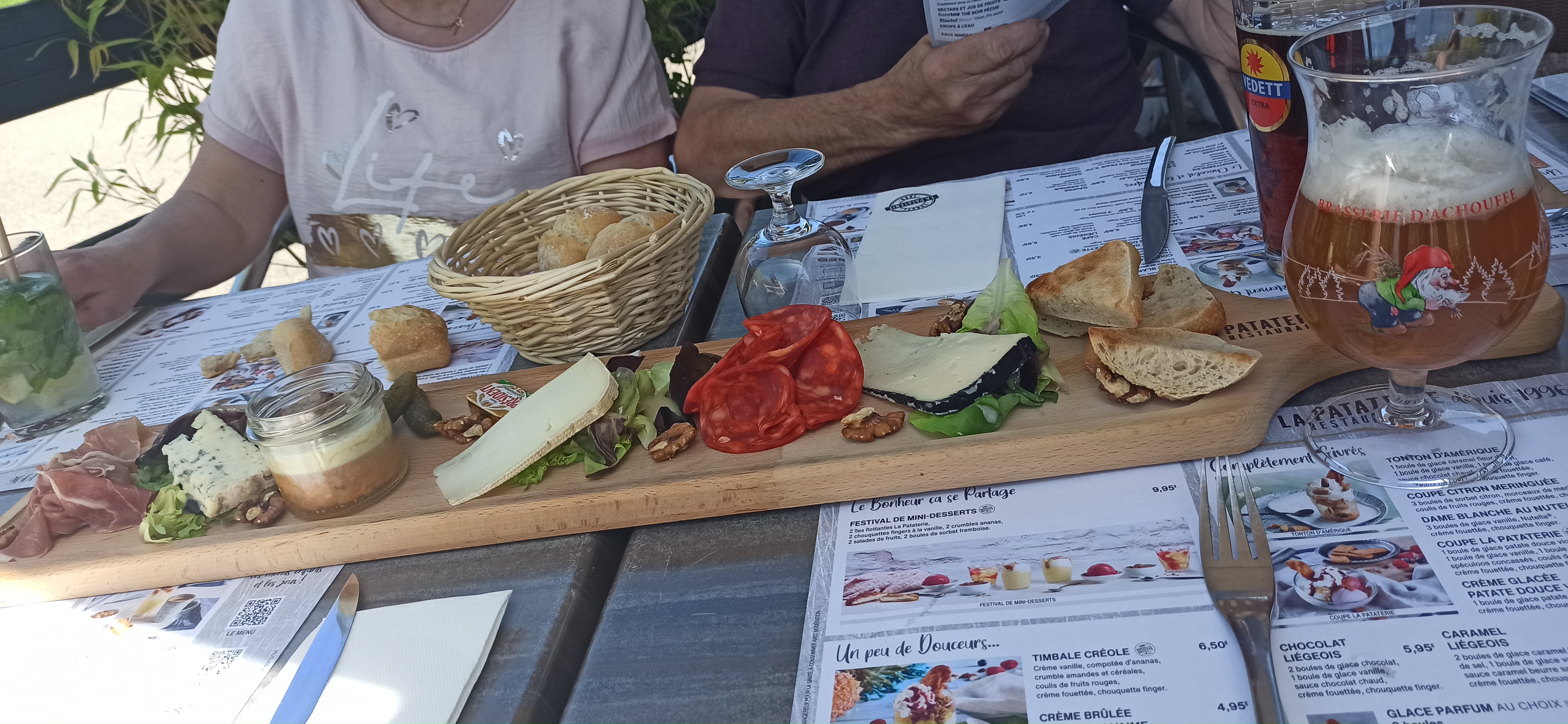 NOUS SOMMES ALLÉS A LA PATATERIE LUNDI 25/07/22.lUN BON ACCEUIL,LE PERSONNEL SOURIANT,NOUS AVONS MANGÉ EN TERRASSE.NOUS AVONS PRIS 2 PETITS BOWL CÉSAREN ENTRÉE,HEUREUSENT QUE NOUS AVONS PRIS EN PETIT SUIVI DE2 CAMENBERTS RÔTIS OULALA 1 CAMENBERT PAR PERSONNE SERVI AVEC UNE GROSSE POMME DE TERRE ET 1 PLAT DE CHARCUTERIE TOUJOURS POUR 1 PERSONNE,JAMBON BLANC ET CRU,SAUSSISSON SEC,CORNICHONS,BEURRE. JE PEUX VOUS ASSURER QUE C ETAIT DÉLICIEUX. IL N Y A PAS EU D ATTENTE ENTRE LES PLATS. MERCI POUR CE TRÈS BON REPAS NOUS REVIENDRONS CA C EST CERTAIN.PRENNEZ LE TEMPS DE VOUS Y ARRETER,VOUS NE SEREZ PAS DÉÇU.