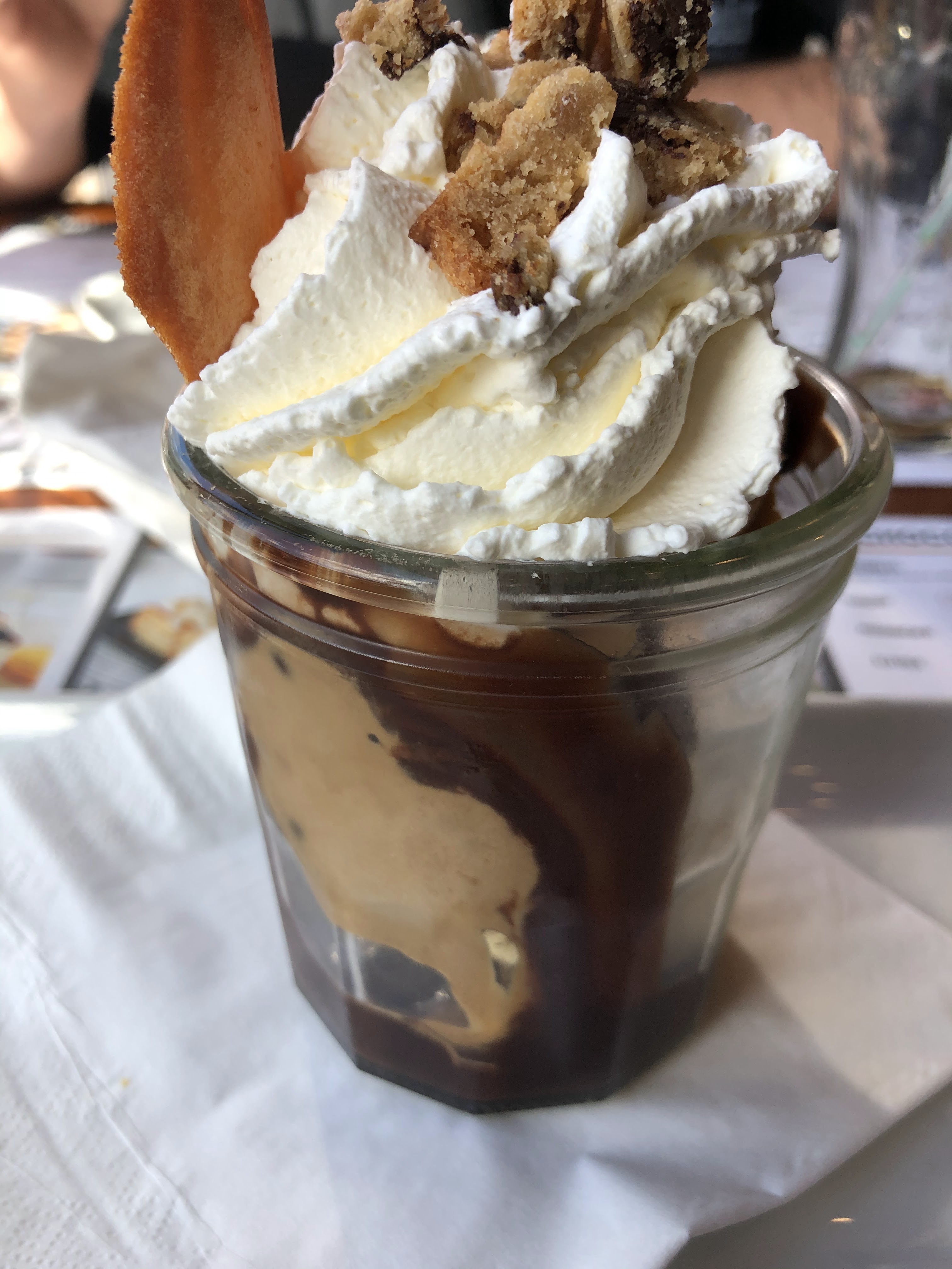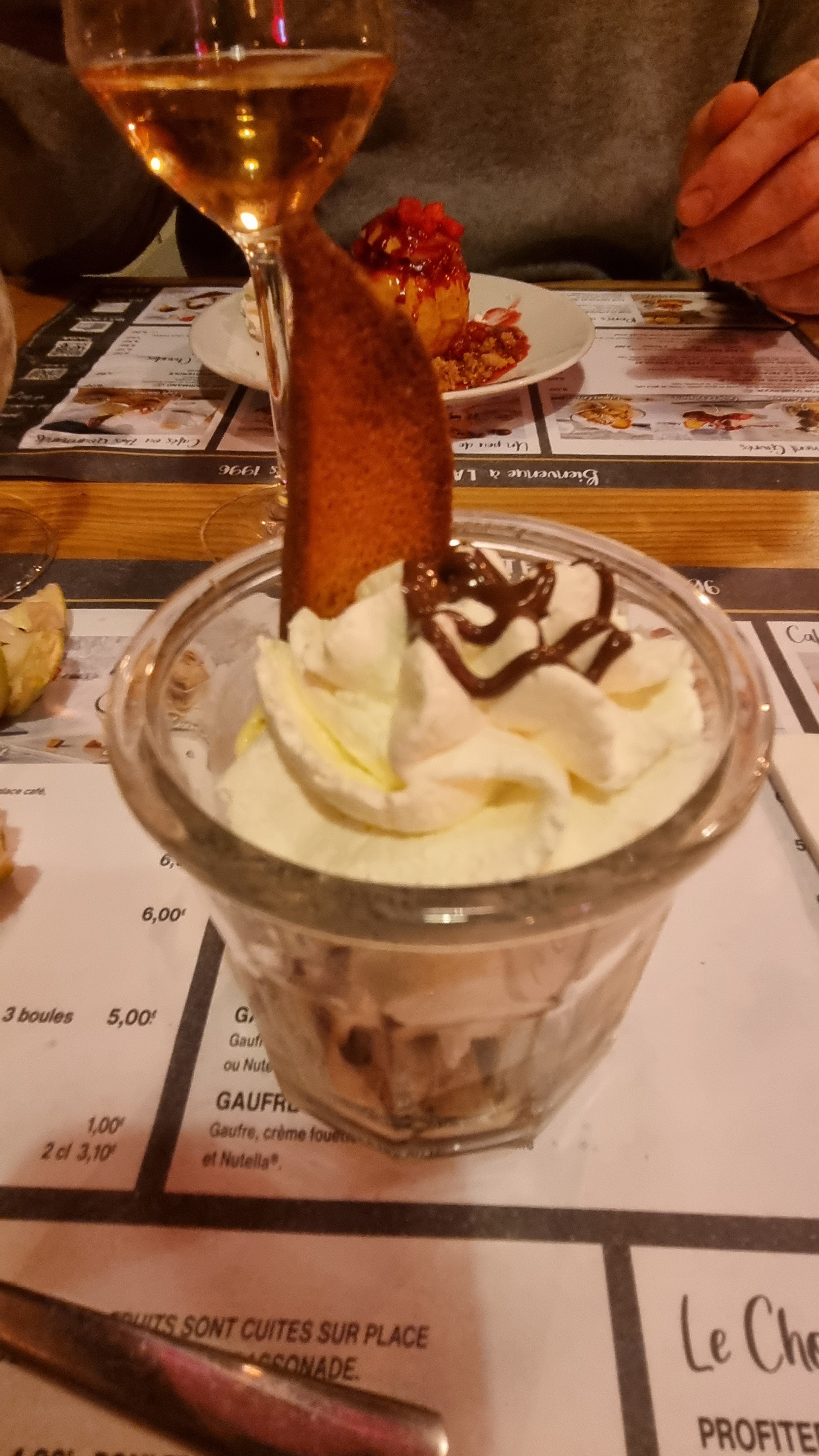 Lieu agréable. Très bon accueil. Satisfait dans l'ensemble sauf les profiteroles. Cristaux dans la glace. Chocolat pas bon. Le plat correct.