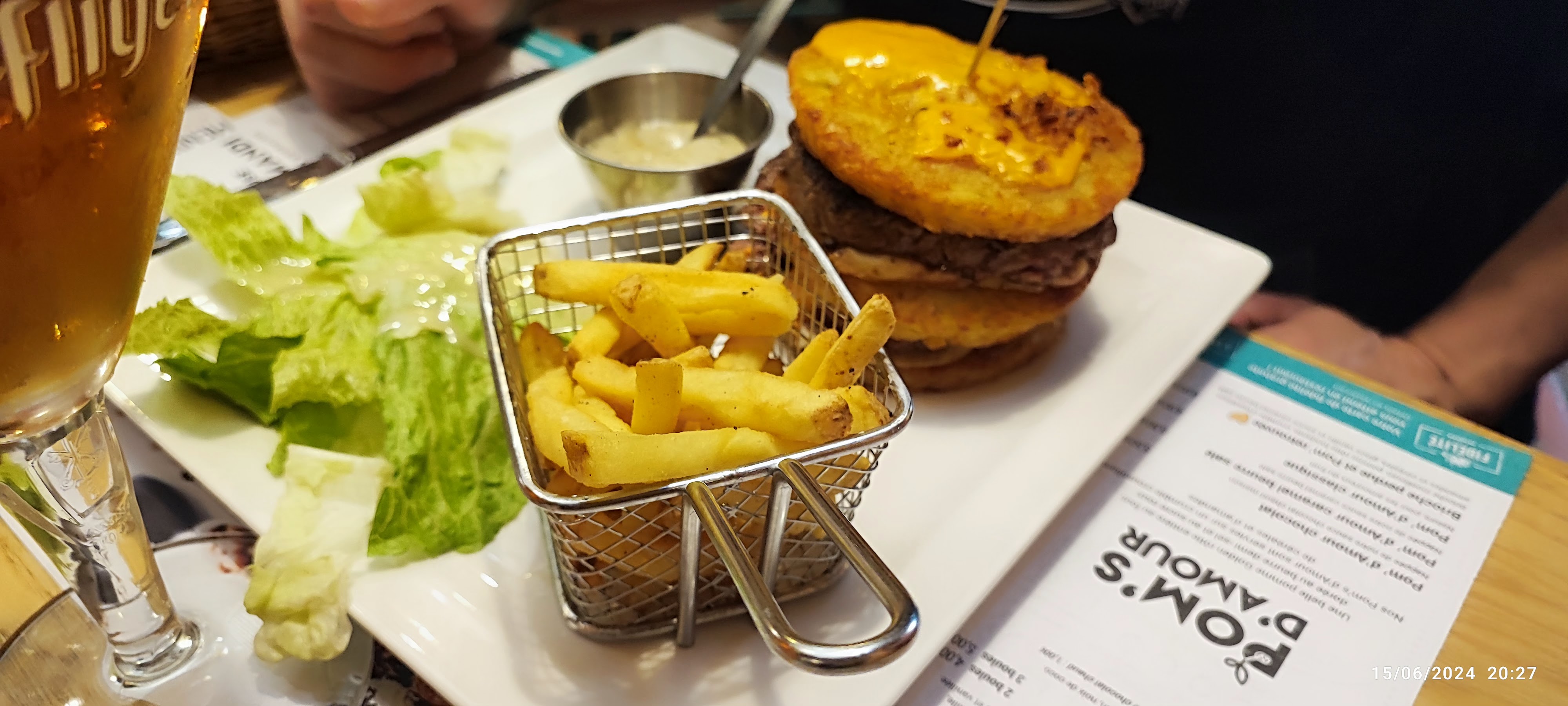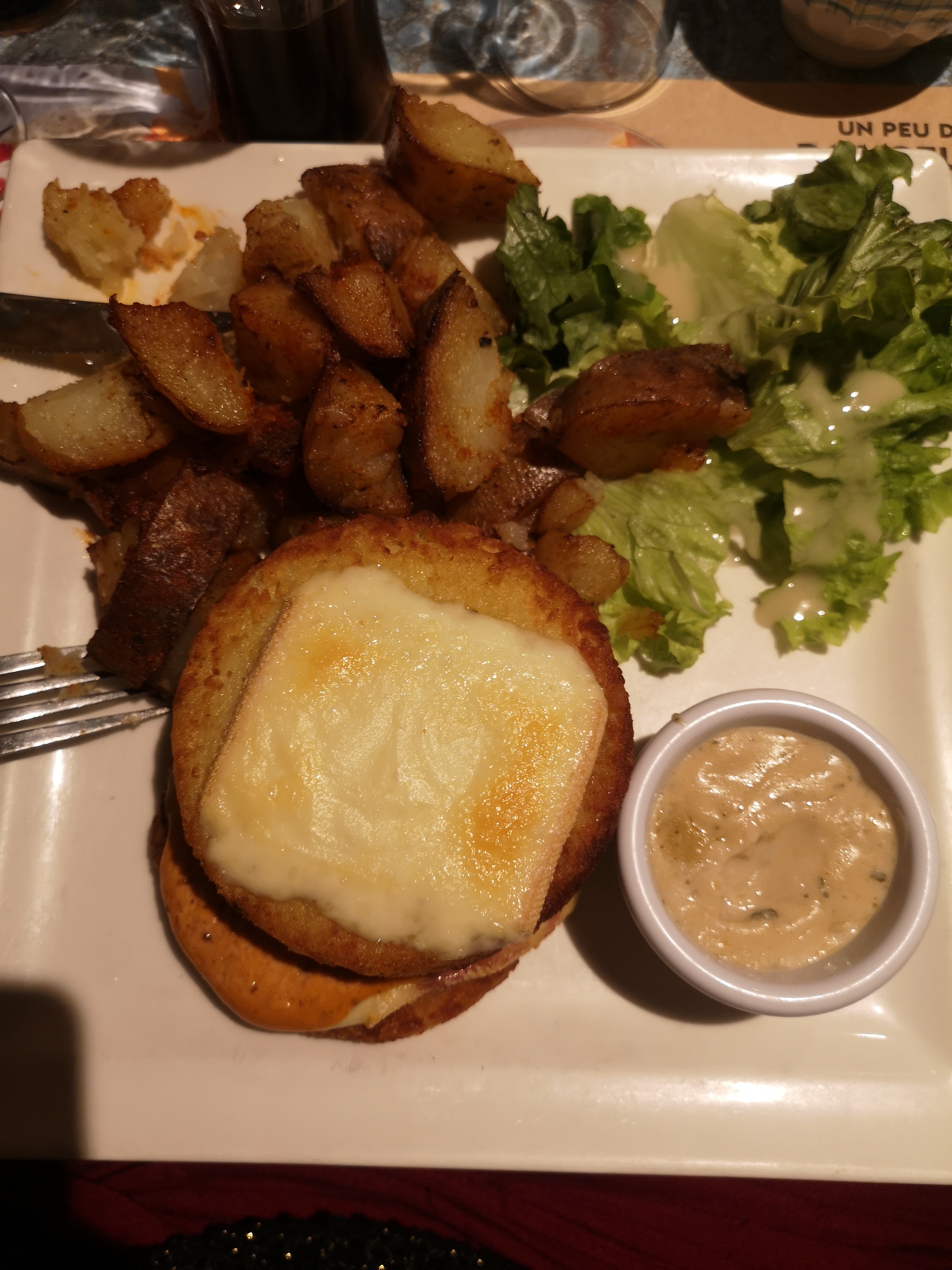 Pommes de terre semblent cuites à l'eau puis passées au four, sans goût. Poulet croustillant qui n'a que le nom. cf KFC Pavé froid àl'intérieur, frites fades pour une Patarie. Heureusement, la serveuse Léa fut très professionnelle. Je ne conseille pas.