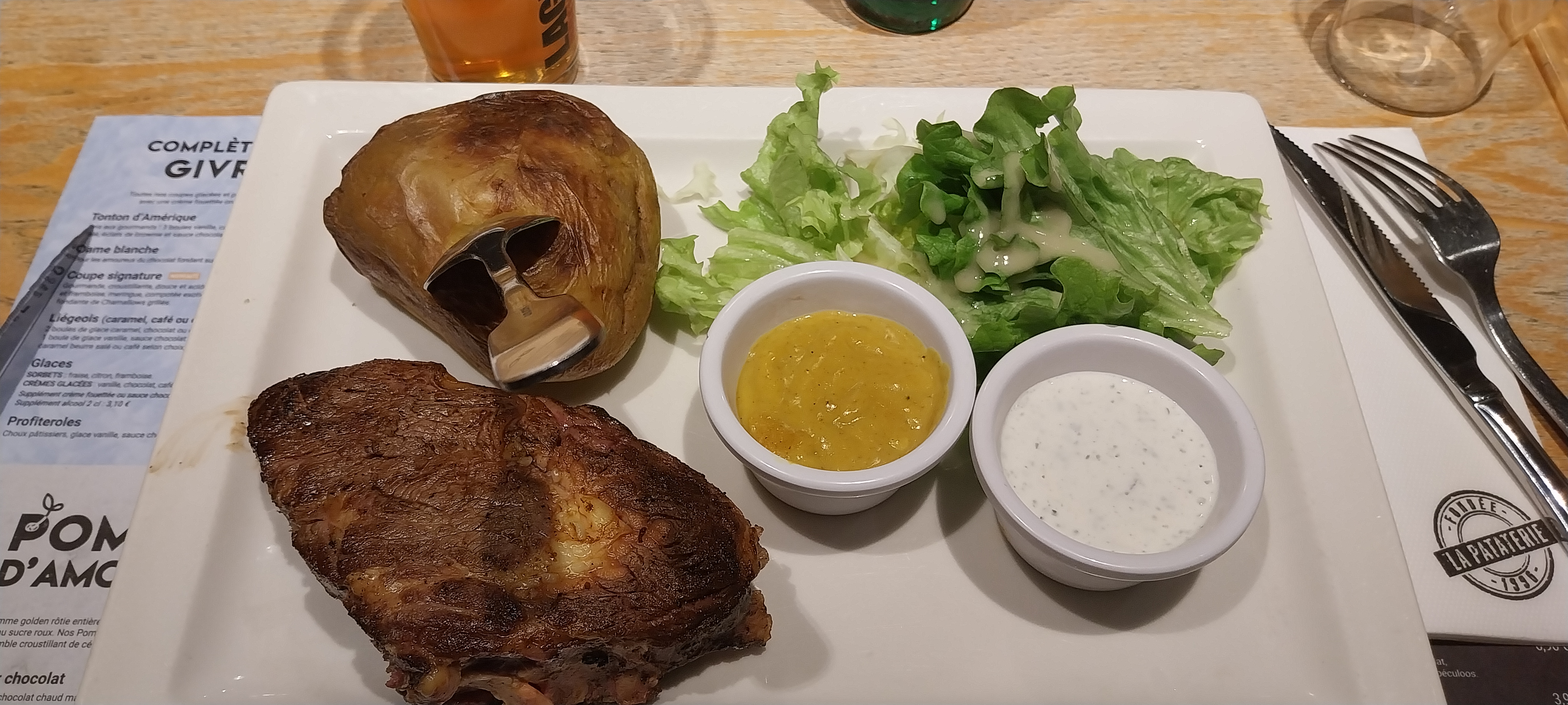 Venir déguster des bonnes patates dans une pataterie !!! Ben non....😱😱😱 Il s'agit de vulgaires frites congelées comme le fast food d'à côté.... C'est vraiment dommage. Heureusement que la viande était excellente. J'ai voulu me rattraper avec un liégeois caramel et sa soit disante crème fouettée comme il est inscrit sur la carte.... Ben non..... Déception il s'agit d'une basique crème en bombe....bilan personnel très sympa où il faudra juste apprendre ce qu'est un café ristretto, service un peu trop rapide à mon goût mais là ça n'engage que moi.... Pour conclure ben je n'ai pas vraiment envie de revenir.... Désolé