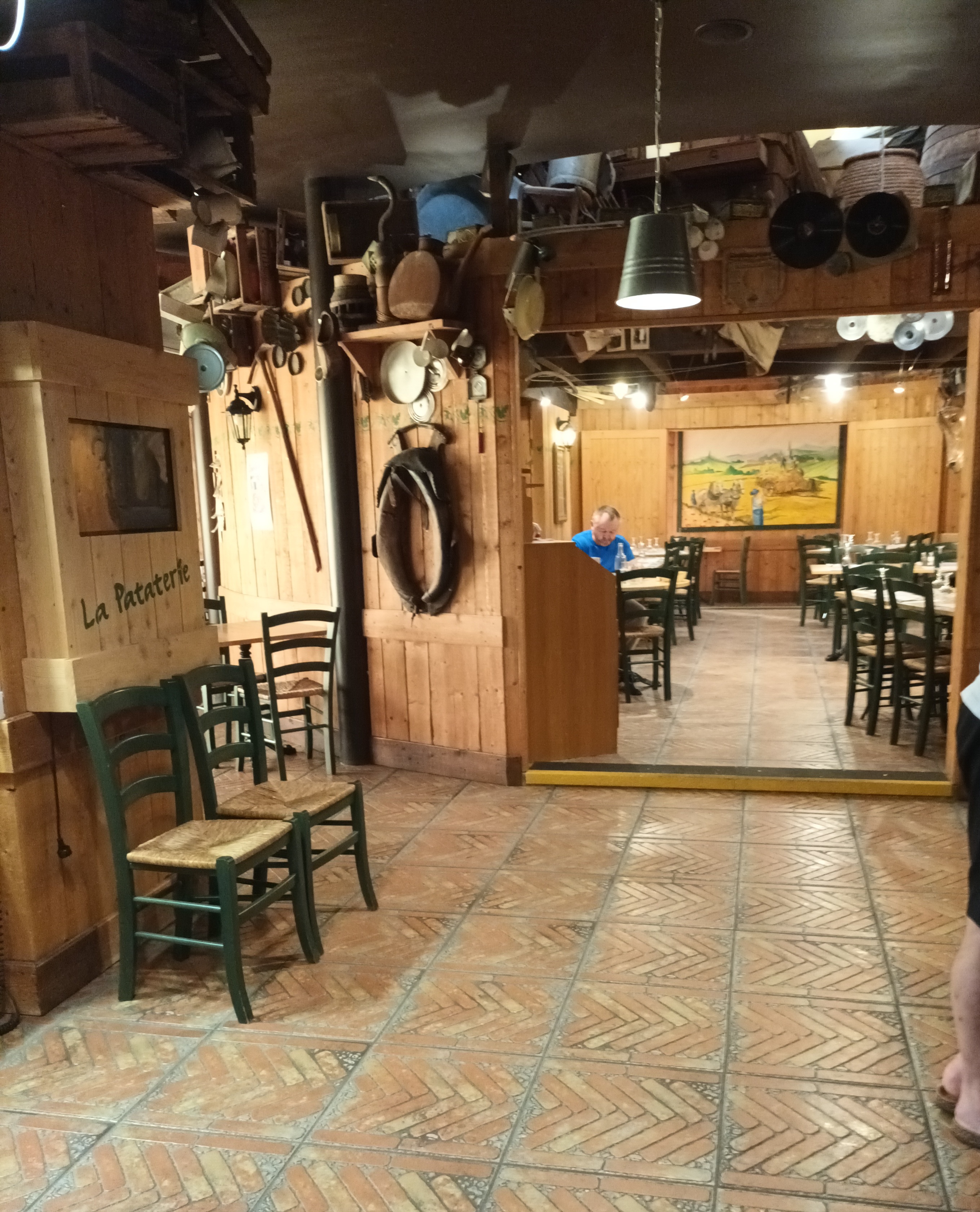 Je suis passé des dizaines de fois en pensant que ce restaurant était fermé... Les extérieurs sont vraiment... Bof ... Vieux... Passés ... Et le parking, vide. Lorsqu'on fait l'effort de rentrer, on imagine que l'extérieur fait finalement partie du décor et du style souhaité. Parce que honnêtement, il faut rentrer ! La décoration est phénoménale ! C'est une ambiance de brocante, avec des produits incroyables. Un repas ne suffira pas pour entrevoir tous les trésors. Venez pour le décor. À un moment, on oublie même que nous sommes rentrés dans un restaurant, jusqu'au moment où l'on entend bonjour, une table pour deux personnes ? Le personnel est sympathique, d'une grande politesse, professionnelle. Nous arrivons au moins drôle. Le repas n'est pas fameux, du coup le rapport qualité/prix laissé un petit goût amer. Les plateaux apéritifs sont fades, au vue de la texture, je pense au congelé... Mou, poisseux, gras, aucun goût. Le menu promettait 3 saveurs et pourtant tout avait le même goût de c'est pas fait maison, c'est plein de gras et de conservateurs. La suite n'a pas été bien plus agréable. Du gras, du sel et pas de saveurs. Les assiettes sont bien remplies, on ne peut pas faire se reproche mais à la Pataterie, les patates devraient être à tomber, non ? Je vous le dis, ce n'est pas le cas... Farineuses, abîmées, sans saveur... Pour la viande, il ne semble pas que la qualité soit supérieure, beaucoup de sel pour tenter de faire oublier qu'il n'y a là non plus aucune saveur. Le dessert n'a pas relevé le niveau... J'aime les glaces donc je prends une coupe. La présentation est ... comme à la maison. Mon épouse choisit une pomme au four pour laquelle aucun reproche, ni aucune éloges n'est à faire. Pour terminer, avant le café, une visite aux toilettes s'imposent. Là, pas de très mauvaises surprises mais l'endroit est plus que défraîchi, loin de faire propre et surtout pas de savon et un séchoir à main dégoûtant mais ce n'est pas si grave car il ne fonctionne pas. Si le repas avait été délicieux, l'addition aurait été très acceptable mais notre conclusion est que l'addition était vraiment grasse et salée, comme le repas. Conclusion, venez prendre un bon café et contempler un superbe décor.