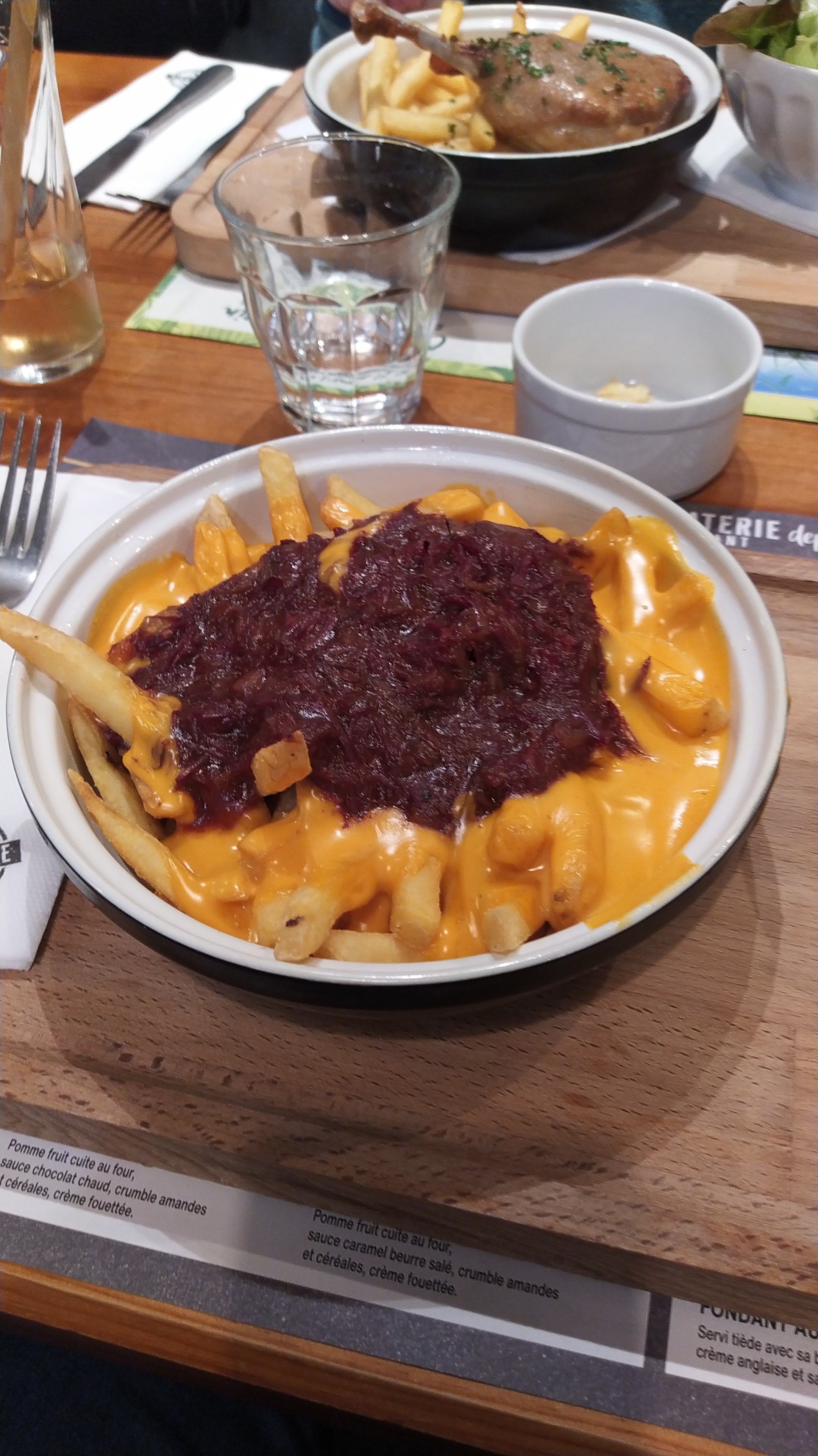 Très bonne salade de chèvre chaud acidulée avec de la pomme cuite, Camembert rôti très bien garni avec charcuterie et pommes de terre La brioche perdue avec sa pomme cuite excellente Petit bémol sur le menu enfant: les frites de poulet sont à oublier, très sèches et sans intérêt gustatif