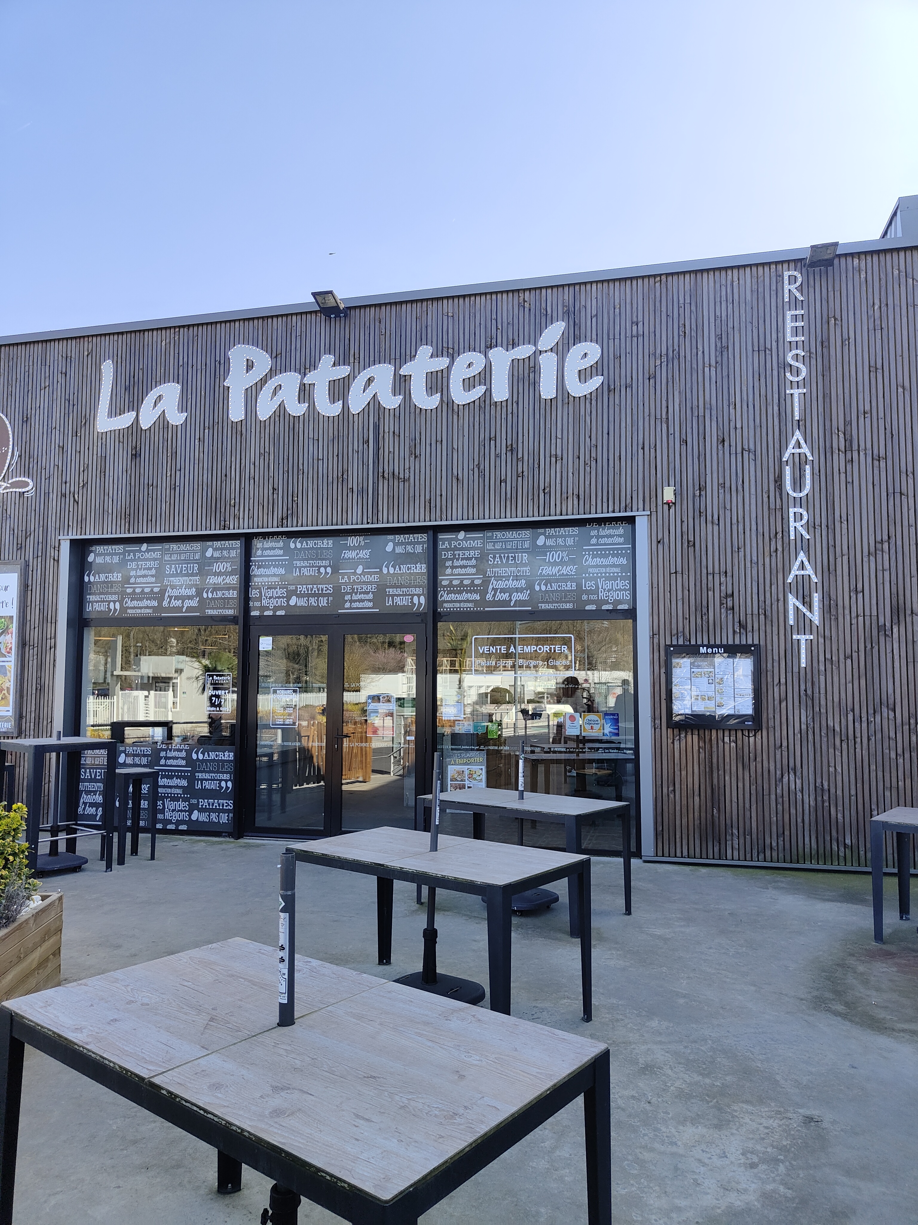 La pataterie à changé depuis 10 jours, très déçu , la pomme de terre mise dans un petit récipient pas facile a couper et n'a plus le fromage à l'intérieur mais dans un petit craquelon sur le côté , le jambon moins garni d'ans une petite assiette avec un peu de salade et 3 tomates cerises et un peu d'oignons rouge, ceci n'est pas la vraie pataterie connue et n'étant pas le seul a s'en faire là remarque, plus de chips à l'apero, Bonjour les économies dans l'assiette mais pas dans l'addition