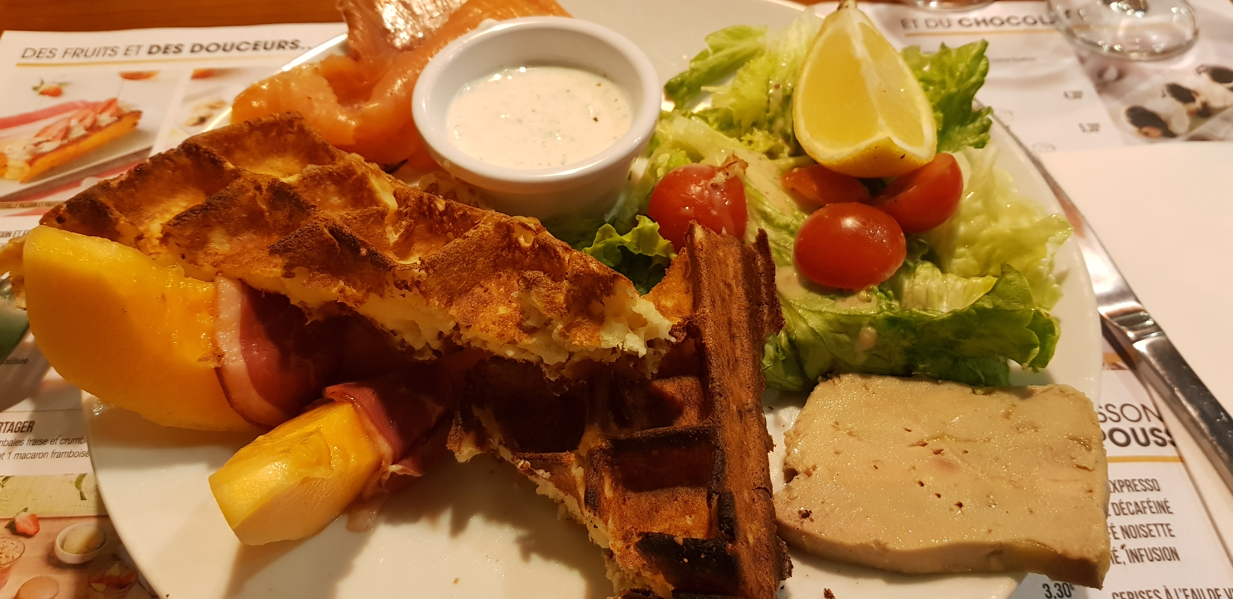 Sourire en arrivant. Service rapide. Assiettes ultra garnies (même pour les desserts, le fromage blanc doit faire l'équivalent de 2 ou 3 yaourts !). Ultra généreux dans les assiettes. Et c'était très bon. 👍