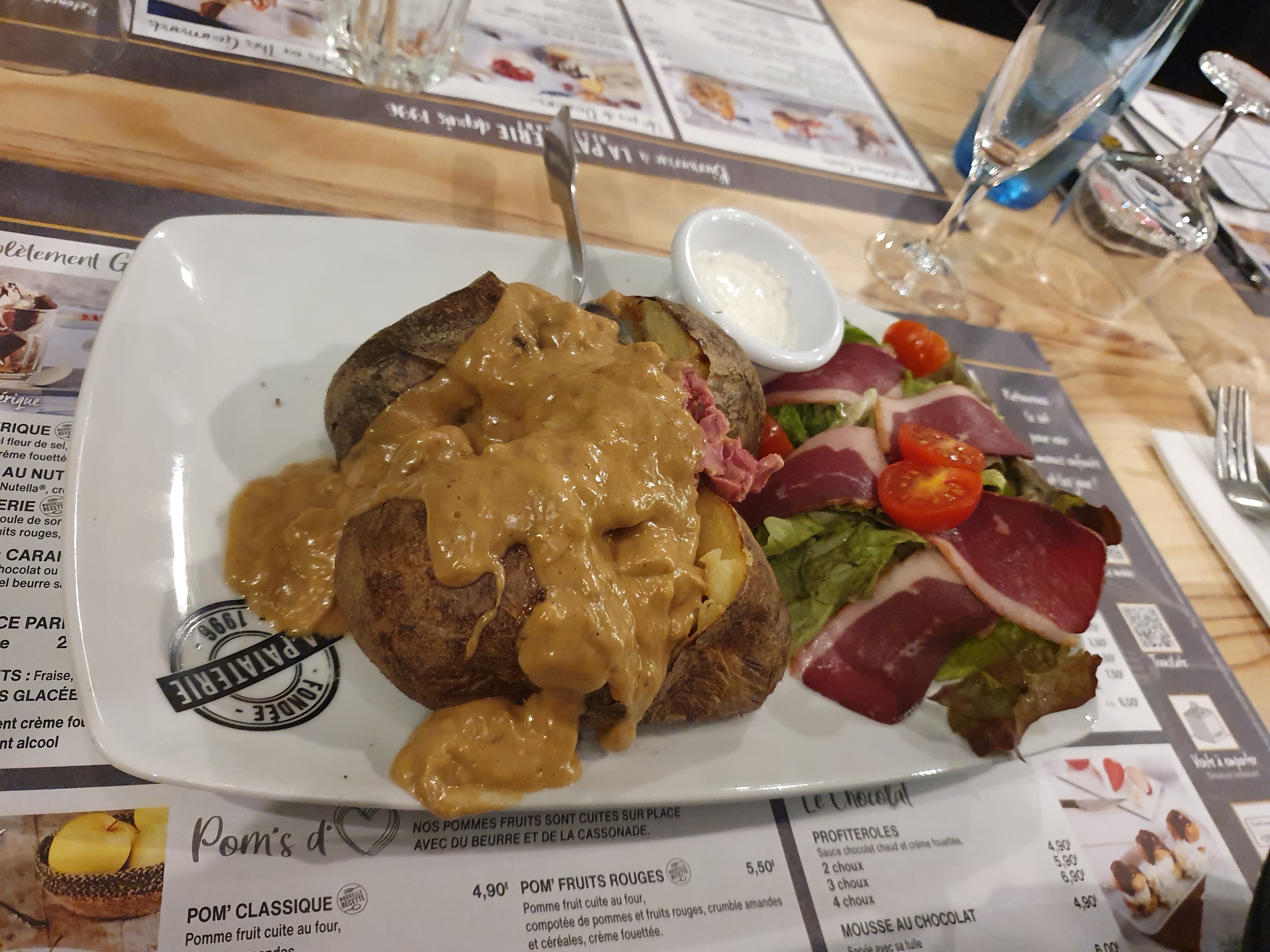 Repas plus que satisfaisant ! Tout était excellent je dirai bien autant le plat que le dessert. Les serveurs ont vraiment été indulgents et a l'écoute. On a pris les deux menus à 16,95 donc ça faisait du 33,90 euros ... Et on a demandé si on pouvait changer les desserts le serveur a dit qu'on pouvait toujours s'arranger. Cela n'a pas engendré de frais supplémentaires au moment de l'addition ce qui m'a agréablement surprise. Je recommande absolument ce restaurant pour passer un moment convivial en famille ou en couple. Parfait si vous aimez les repas à base de patate.