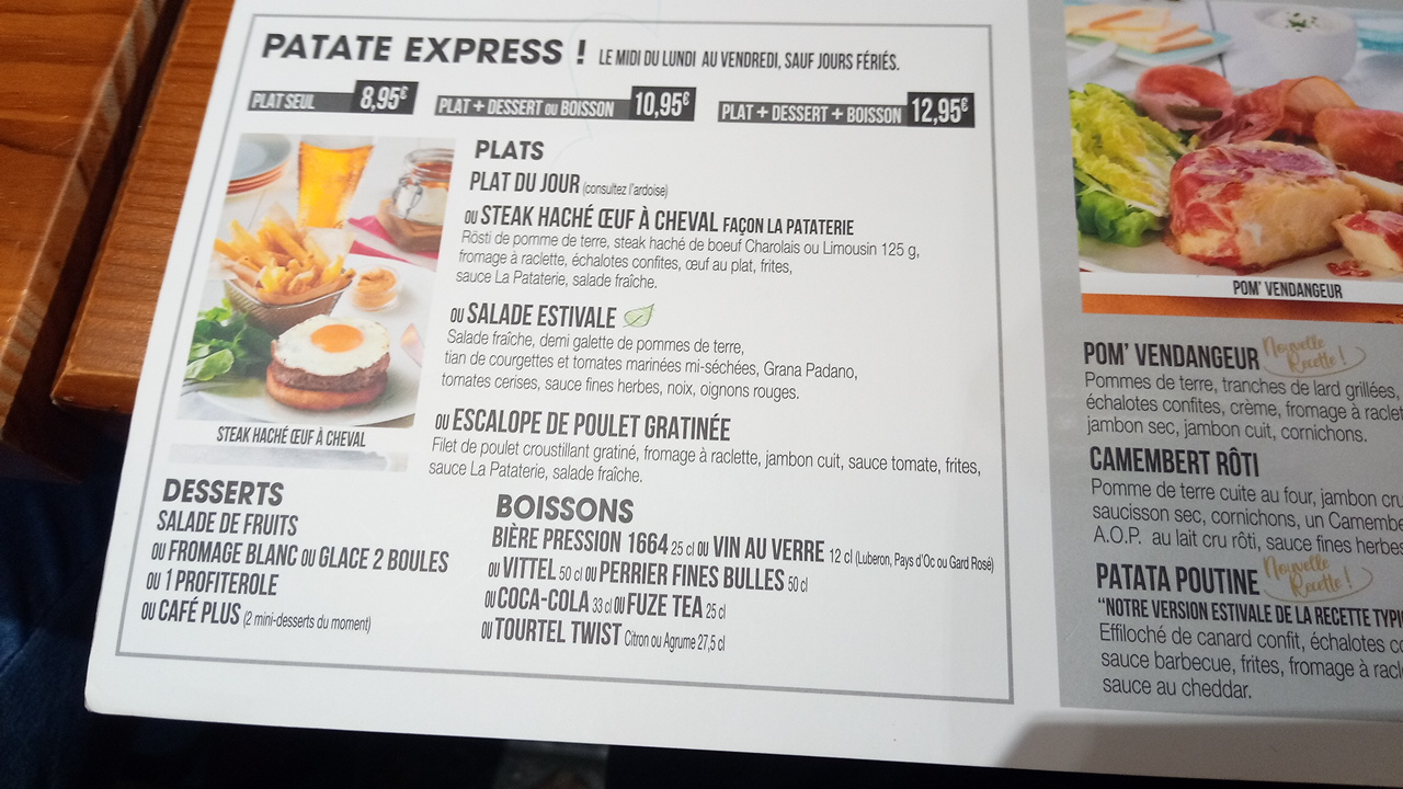 Repas très agréable malgré un restaurant rempli, nous étions au calme au fond de la salle avec notre fils c'était parfait. Les prix sont corrects, on apprécie le cocktail à petit prix pour les enfants. Le gros plus a été le service, des serveurs avec le sourire malgré un restau bondé c'est pas tous les jours qu'on voit ça, et on a pas eu l'impression d'être oublié ! Bravo à vous, bravo au gérant pour la remise à neuf de la Pataterie, nous reviendrons.