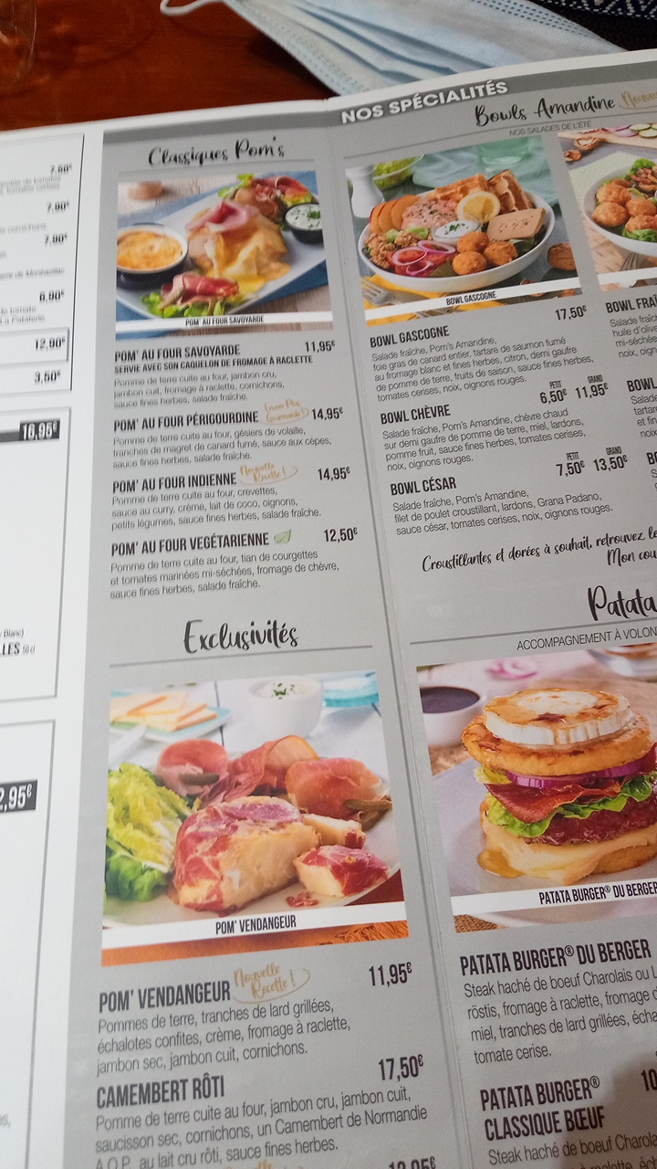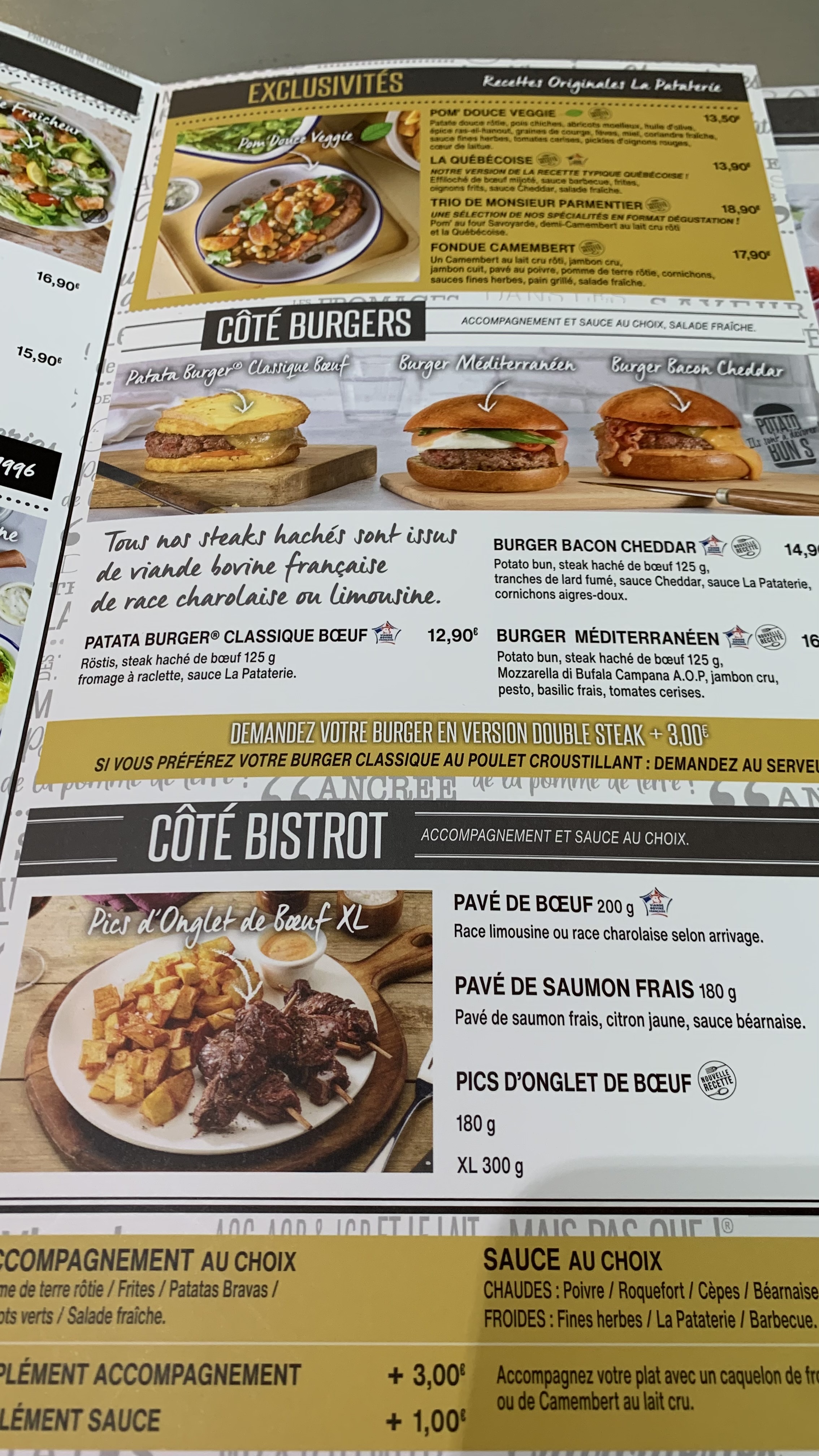 Prestations général : Prise en charge de la commande un peu longue Temps d'arriver du plat un peu long Ambiance chaleureuse Serveurs disponibles a tout moment et réactif Plat : La québécoise Très bon, mais la quantité est trop petite ou la plat pas assez consistant ce qui fait que l'on a malgré tout faim, a la fin de repas Burger normand : Bon mais un peu equerant Savoyarde : très bon très copieux Les pains qui accompagnent les repas sont très bon et bien moelleux... Par contre dommage que dans un restaurant comme la pataterie ne propose pas de patate ou frites illimité inclus dans les repas...
