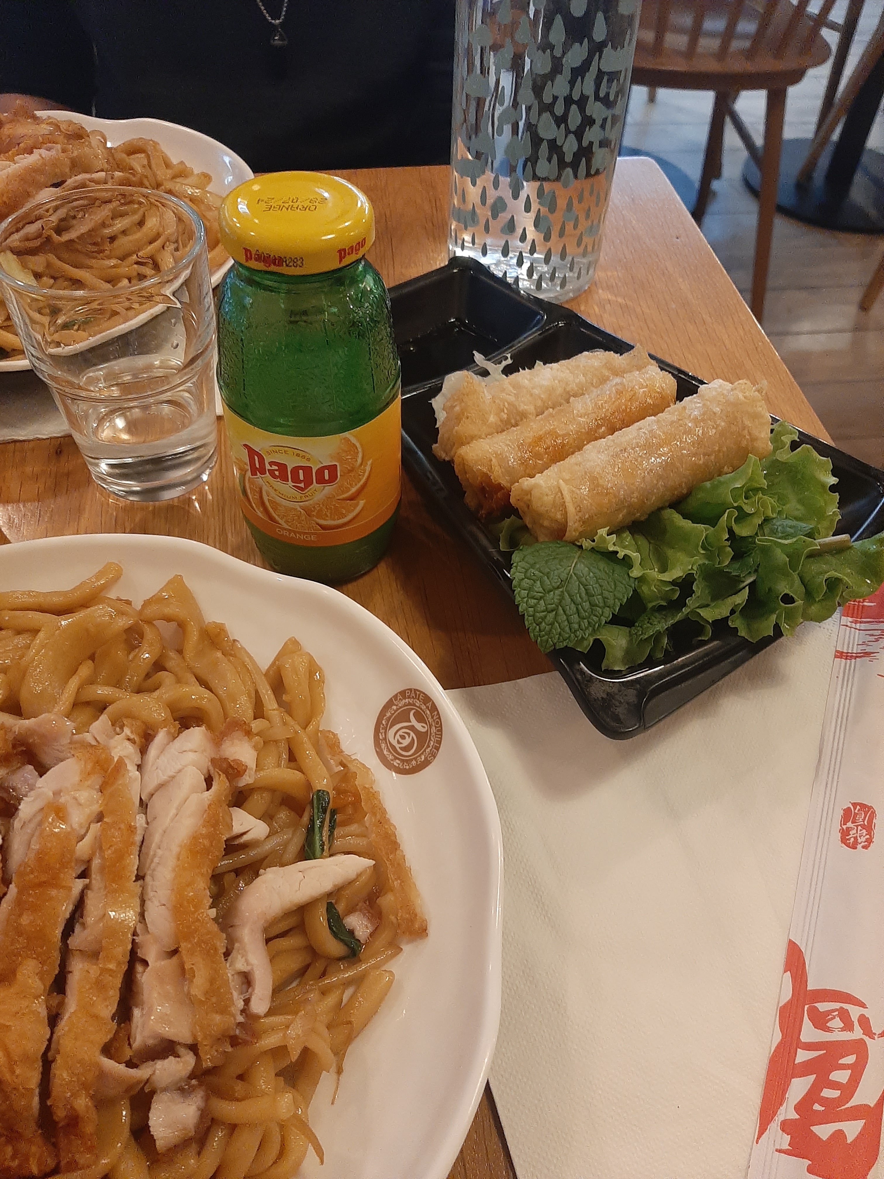Nouilles sautées poulet croustillant et nouilles sautées canard laqué, les nouilles sont très bonnes mais la viande trop sèche.. dommage Service et personnels parfait, merci