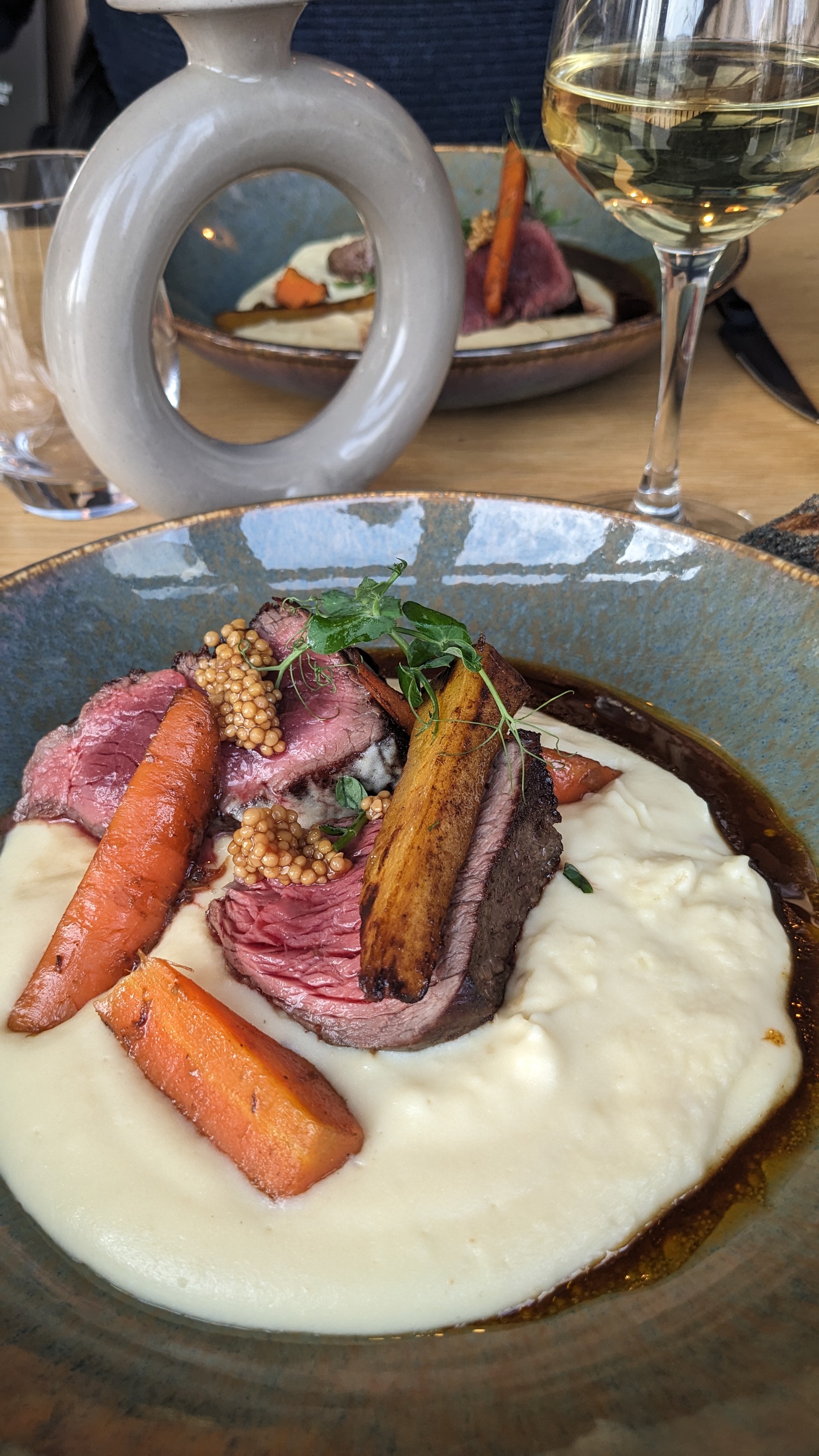 Première expérience pour un évènement festif ou nous avons décidé de nous faire plaisir... très honnêtement nous avons été déçus, même si la qualité des plats étaient corrects, le.prix et les quantités étaient décevantes. En début de service on nous annonce que il ne reste que 2 hampes de bœuf. ? je reste sceptique sur ce point. L'eau de table est arrivée très tard...et pour le dessert 10e pour une île flottante certes bonne mais qui ne vaut pas ce prix. Le concept de peu de plats à la carte est top. Le cadre agréable et épuré. Le personnel agréable. Peut être que je retenterai à un autre moment. Merci 👍